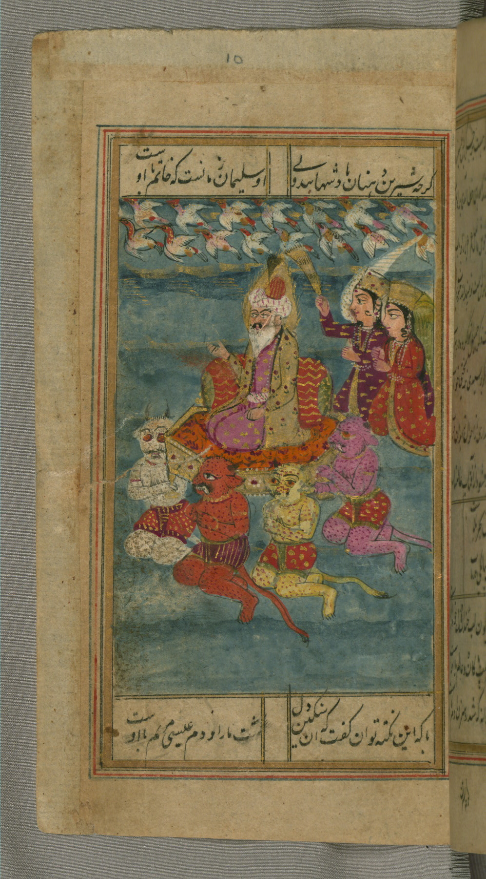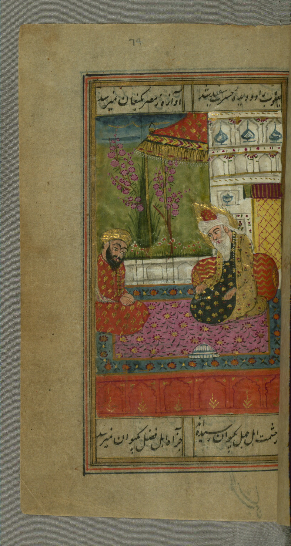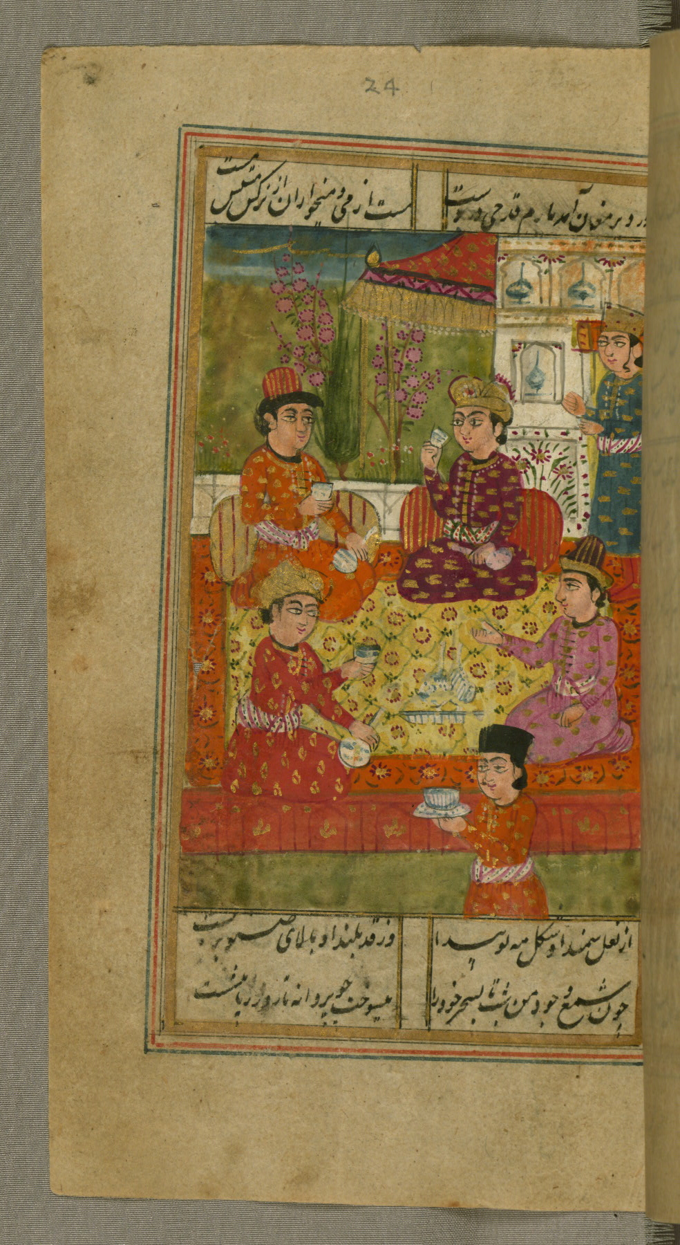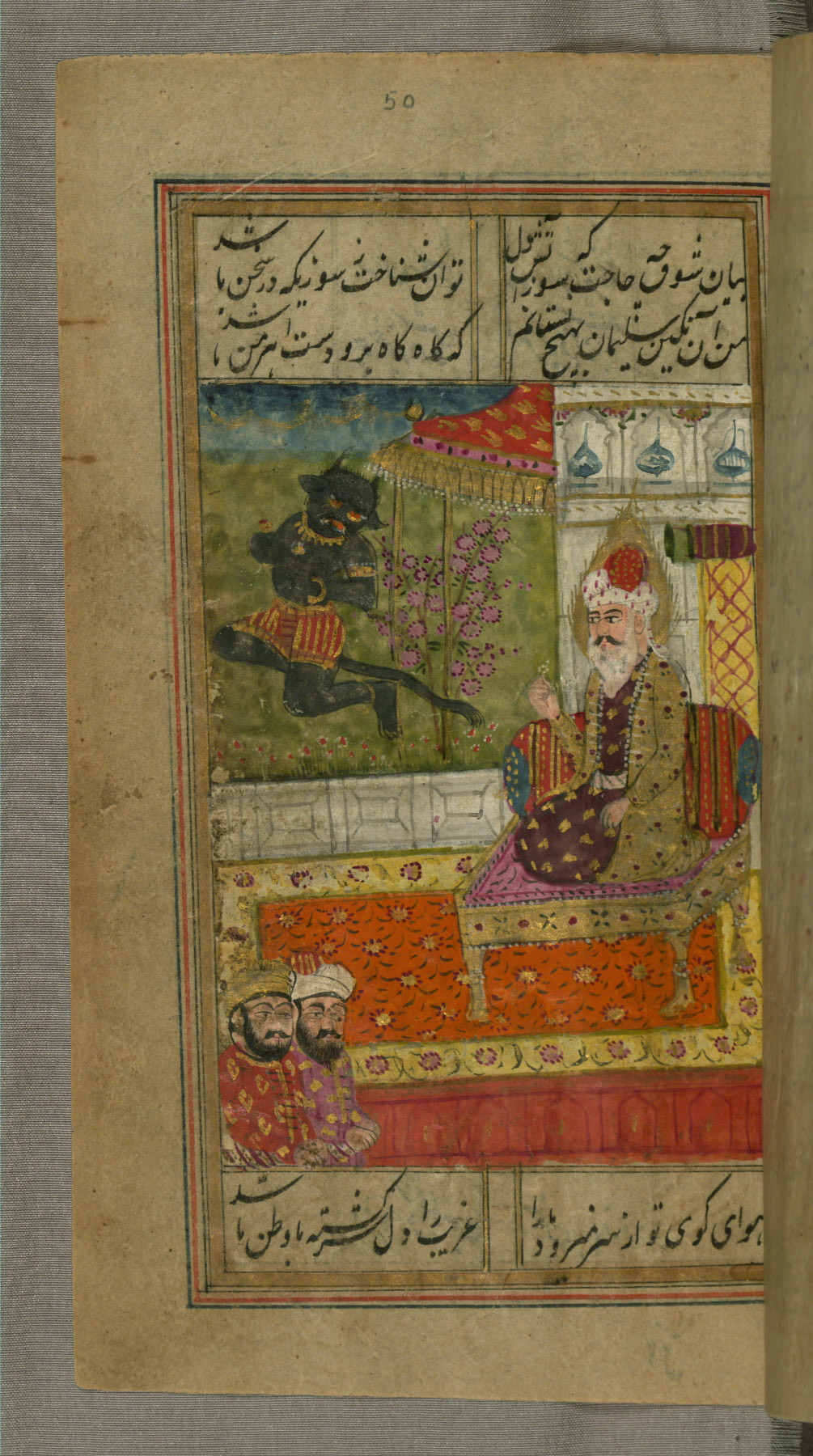 - Label: This page illustrates the first couplet on the page, in which the poet comments that his beloved has hundreds of Jamshīds and Kay Khusraws as slaves.