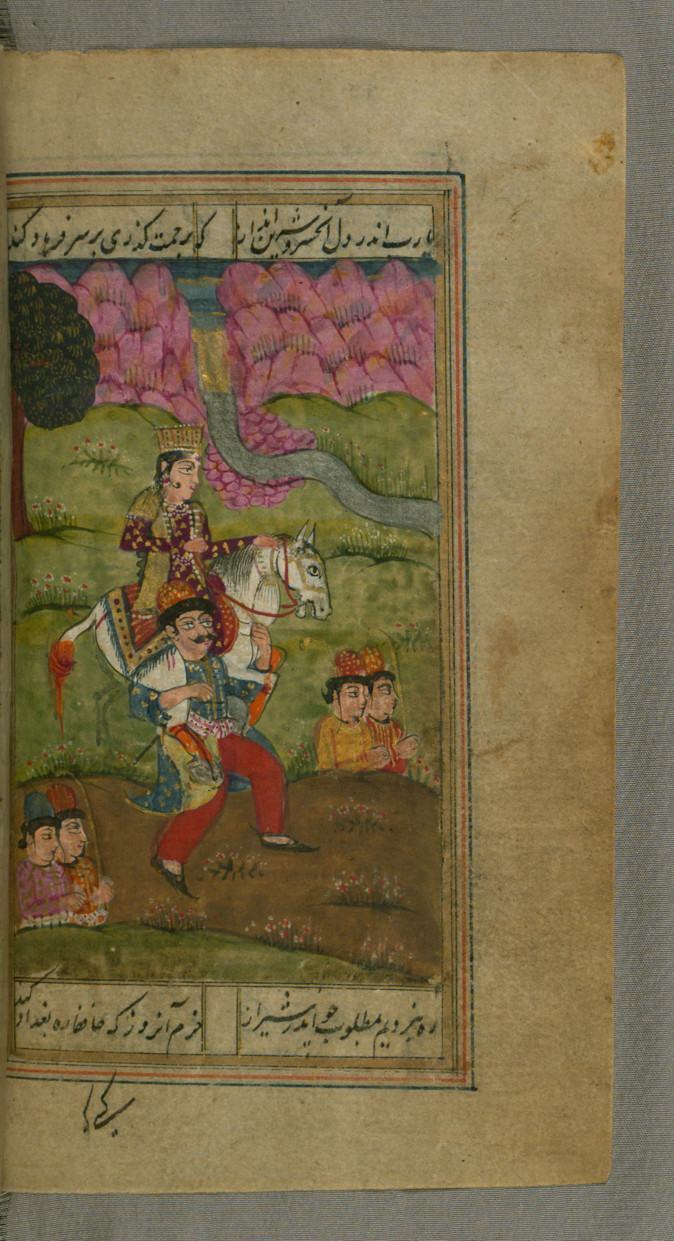 - Label: In the foreground of this illustration, Sultan Maḥmūd and his favorite, Iyāz, are shown. Behind are Laylá and Majnūn. All four are referred to in this ode.