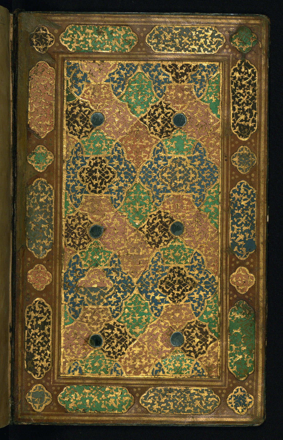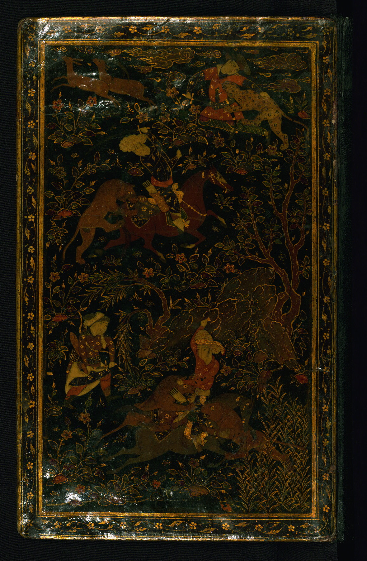 - Label: This Safavid lacquer binding is decorated with hunting scenes and landscape motifs. It is attributable to the late tenth century AH / sixteenth CE or eleventh century AH / seventeenth CE.