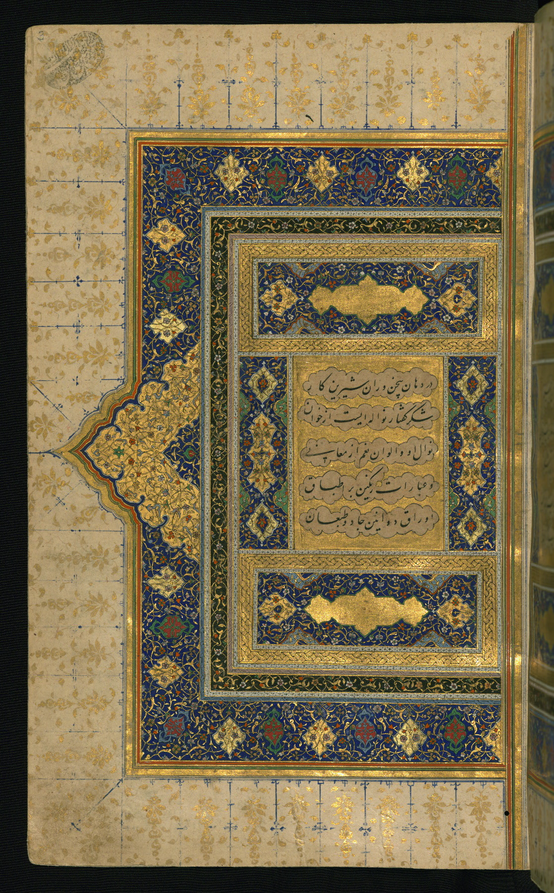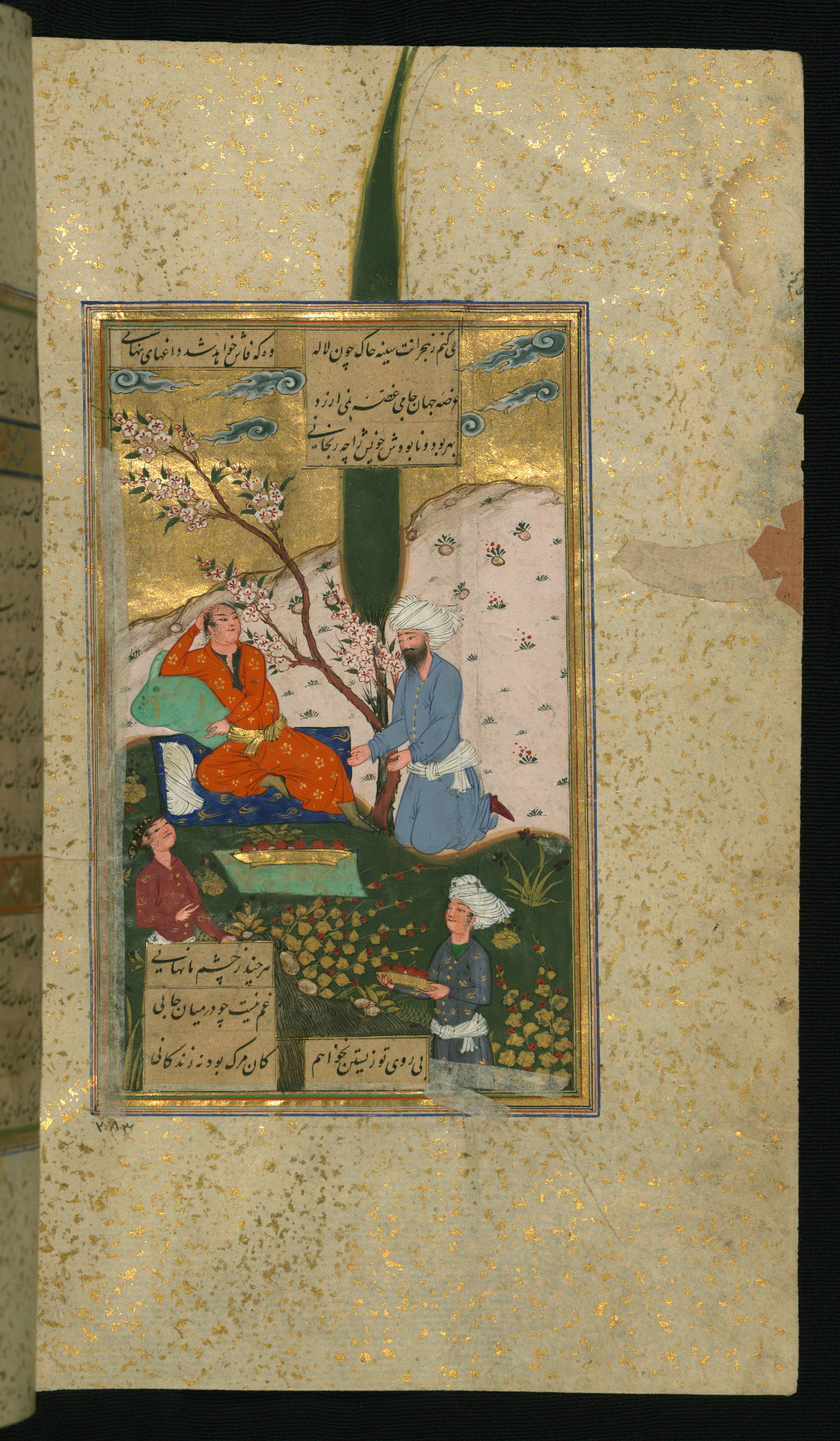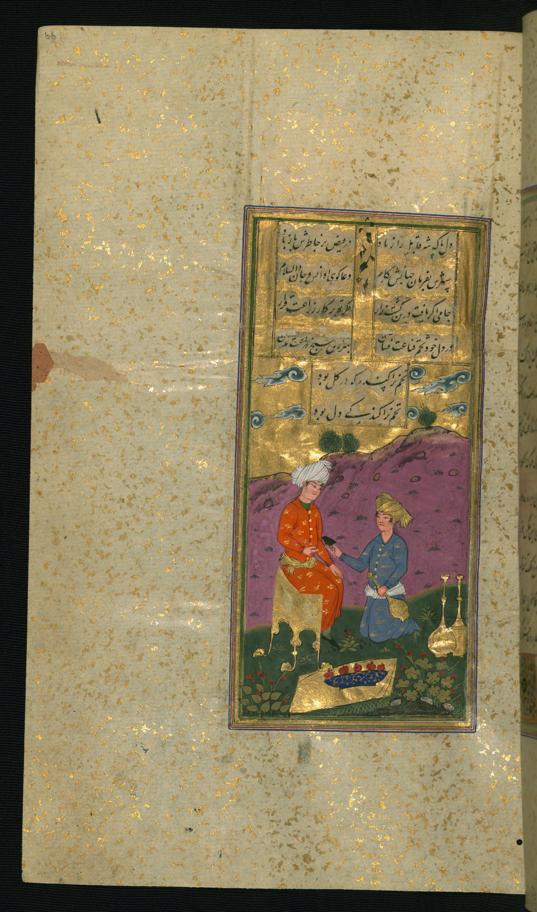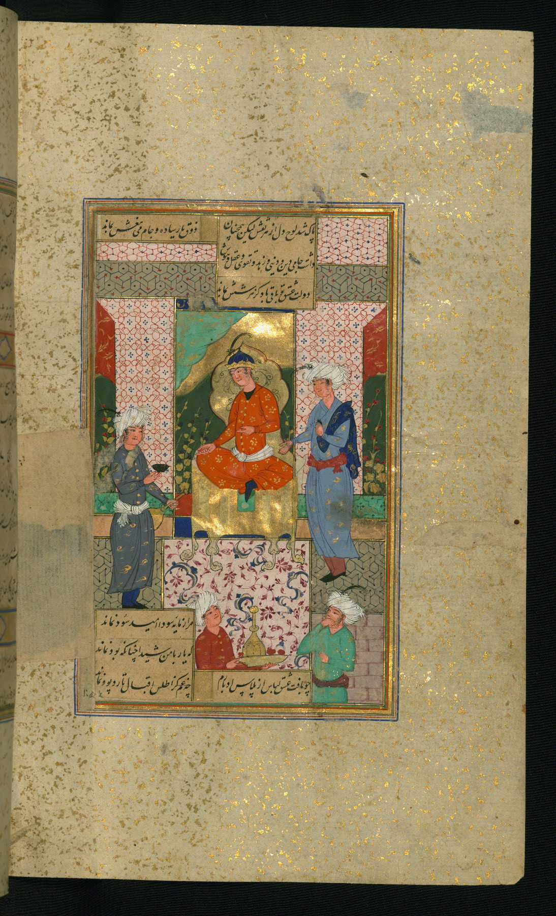 - Decoration note: Ten illustrations; double-page illustrated frontispiece (fols. 1b-2a); double-page illuminated incipit (fols. 2b-3a); headpiece introducing ghazals (fol. 66b), panels in the text, framing lines in blue, red, mustard, green, and gold