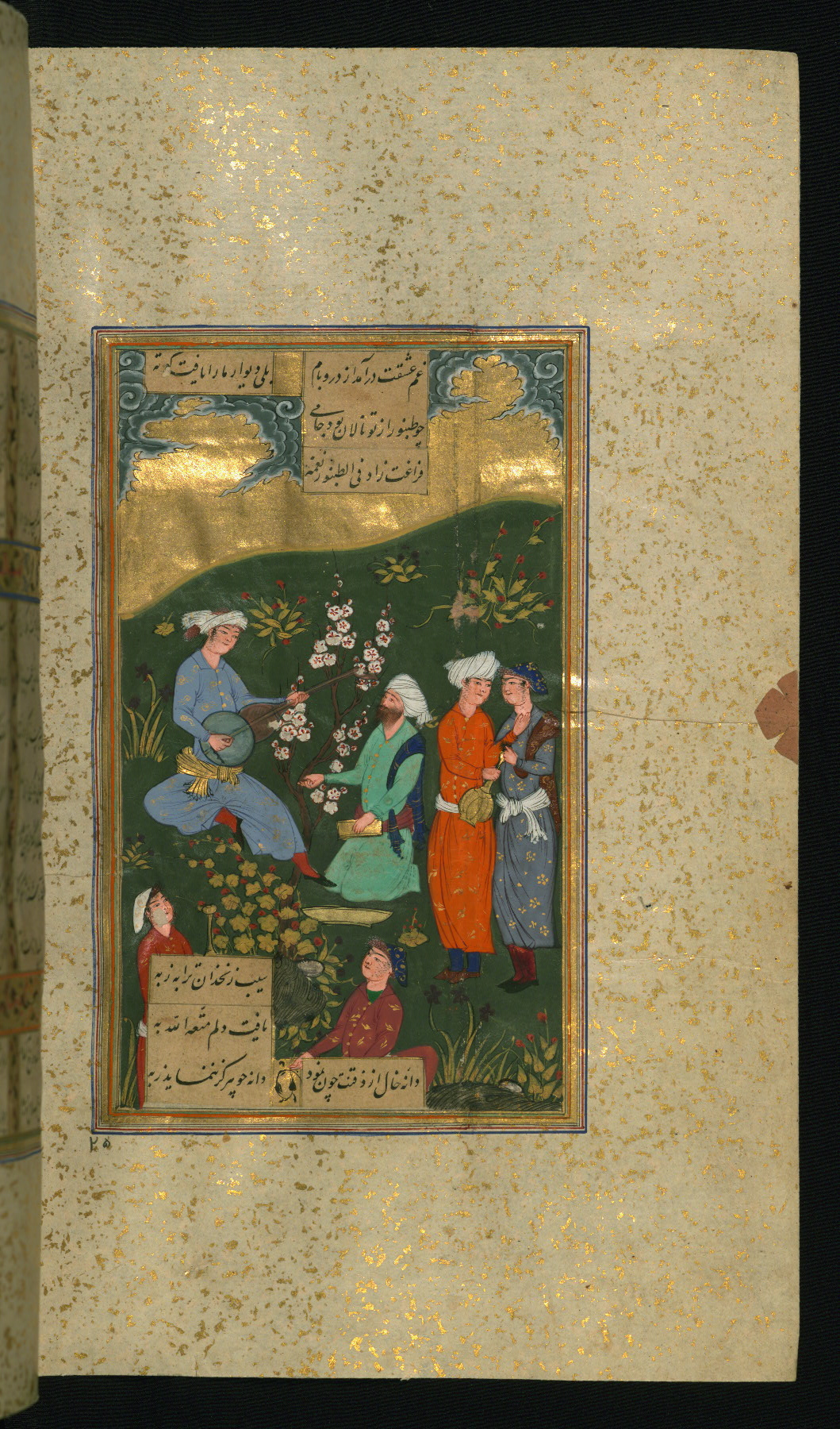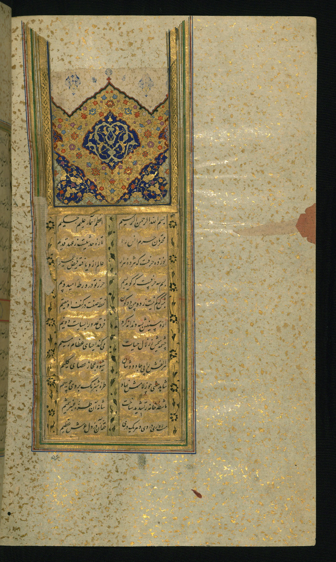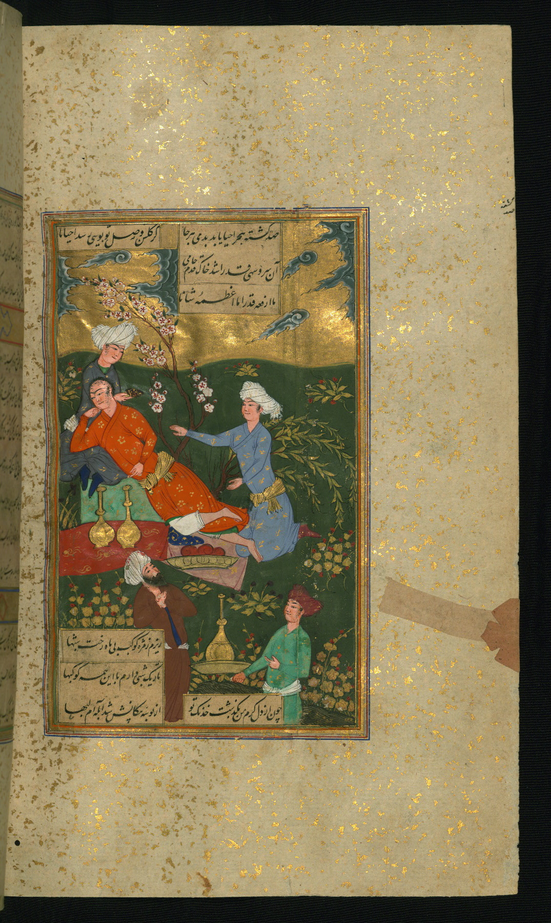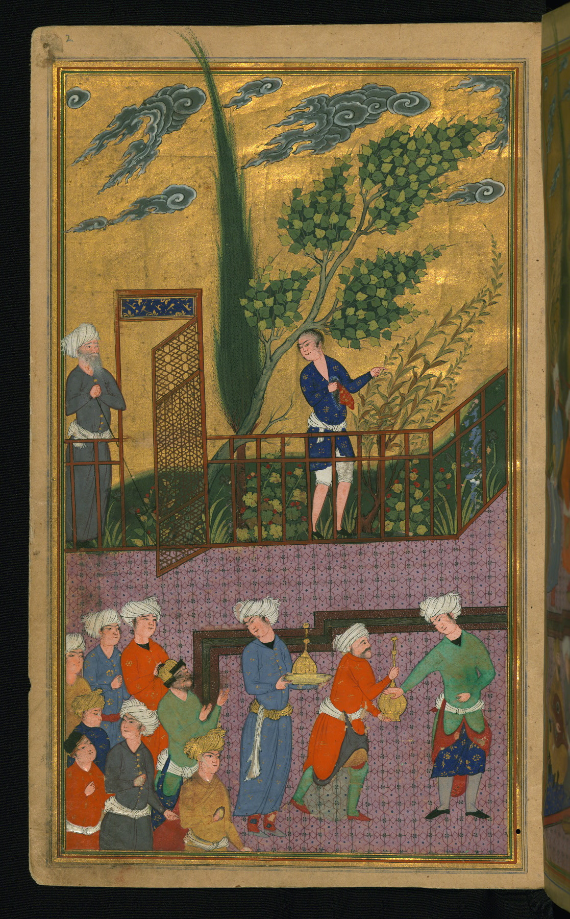 - Decoration note: Ten illustrations; double-page illustrated frontispiece (fols. 1b-2a); double-page illuminated incipit (fols. 2b-3a); headpiece introducing ghazals (fol. 66b), panels in the text, framing lines in blue, red, mustard, green, and gold