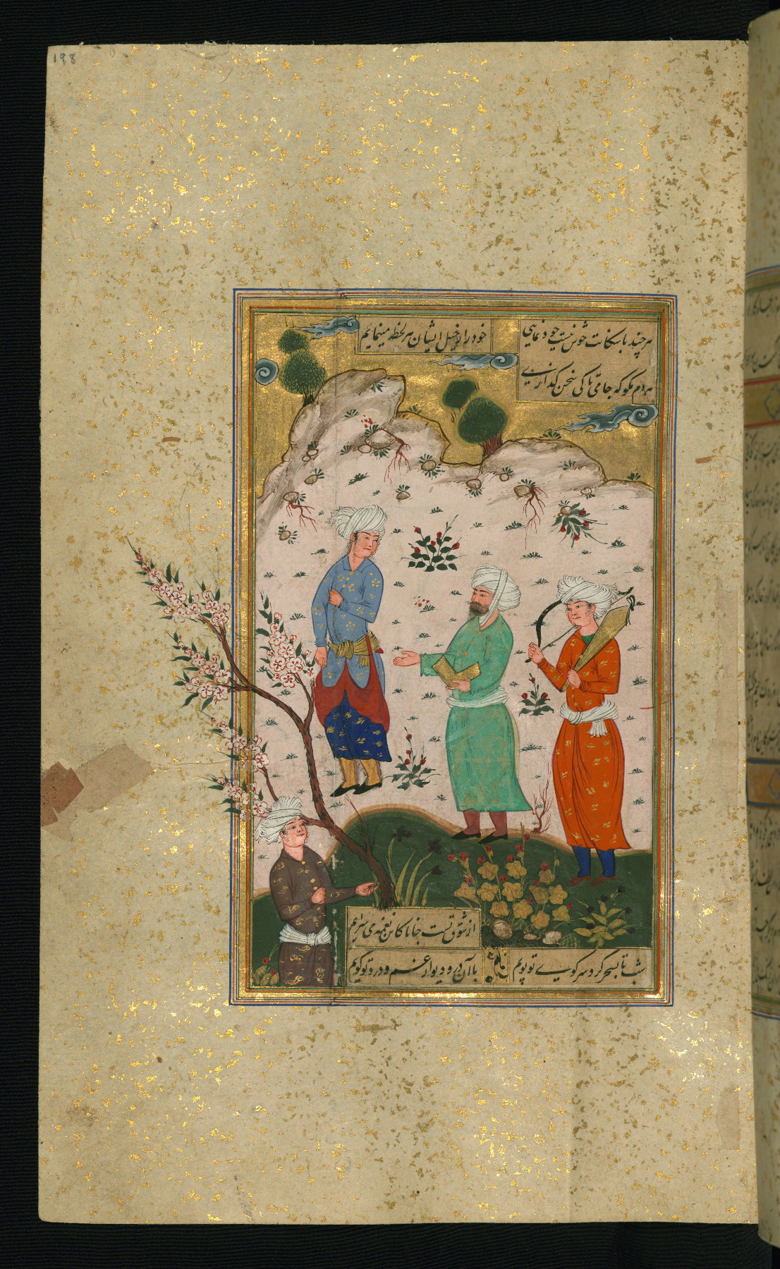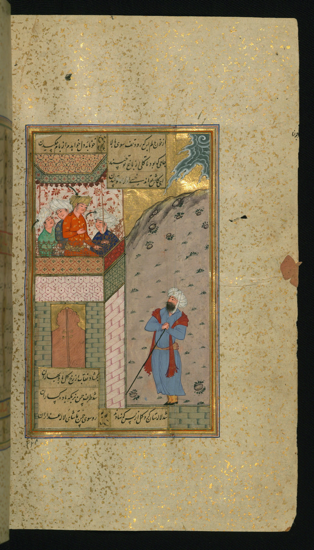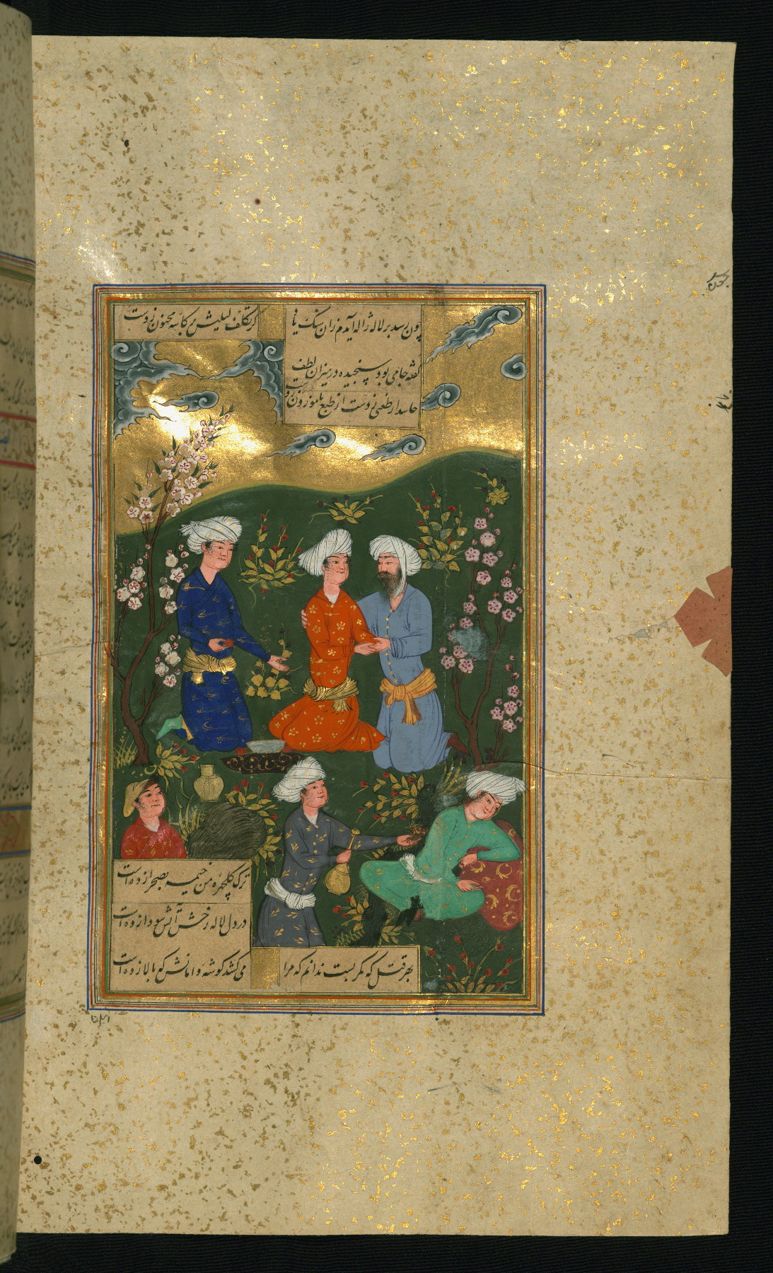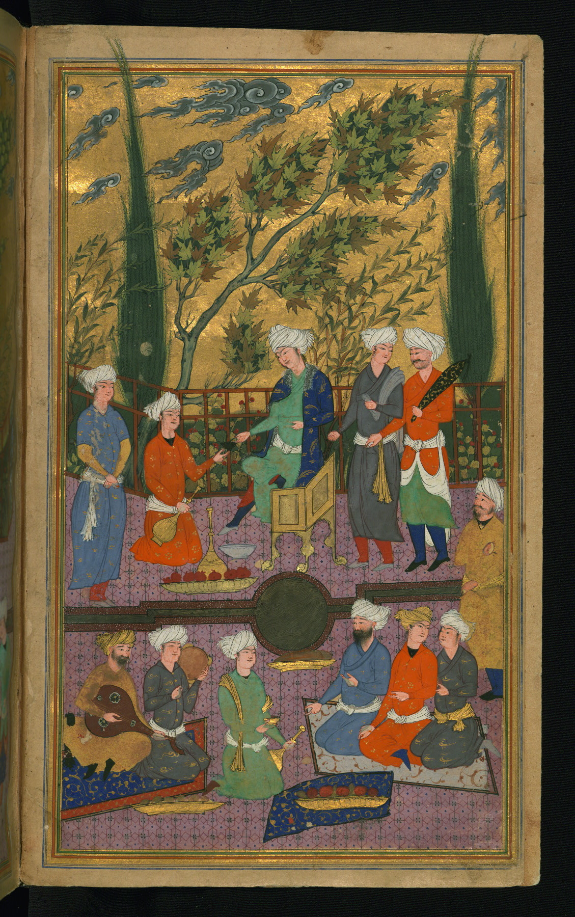 - Decoration note: Ten illustrations; double-page illustrated frontispiece (fols. 1b-2a); double-page illuminated incipit (fols. 2b-3a); headpiece introducing ghazals (fol. 66b), panels in the text, framing lines in blue, red, mustard, green, and gold