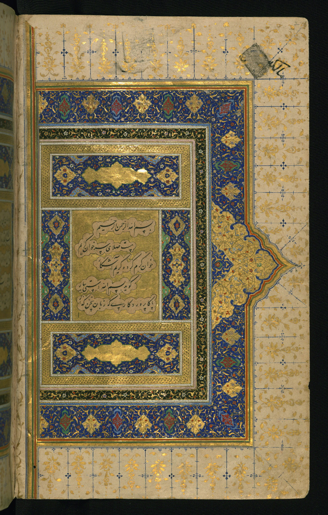 - Label: This incipit page with illuminated headpiece, interlinear decoration, and gold-sprinkled margins introduces the section on ghazals.