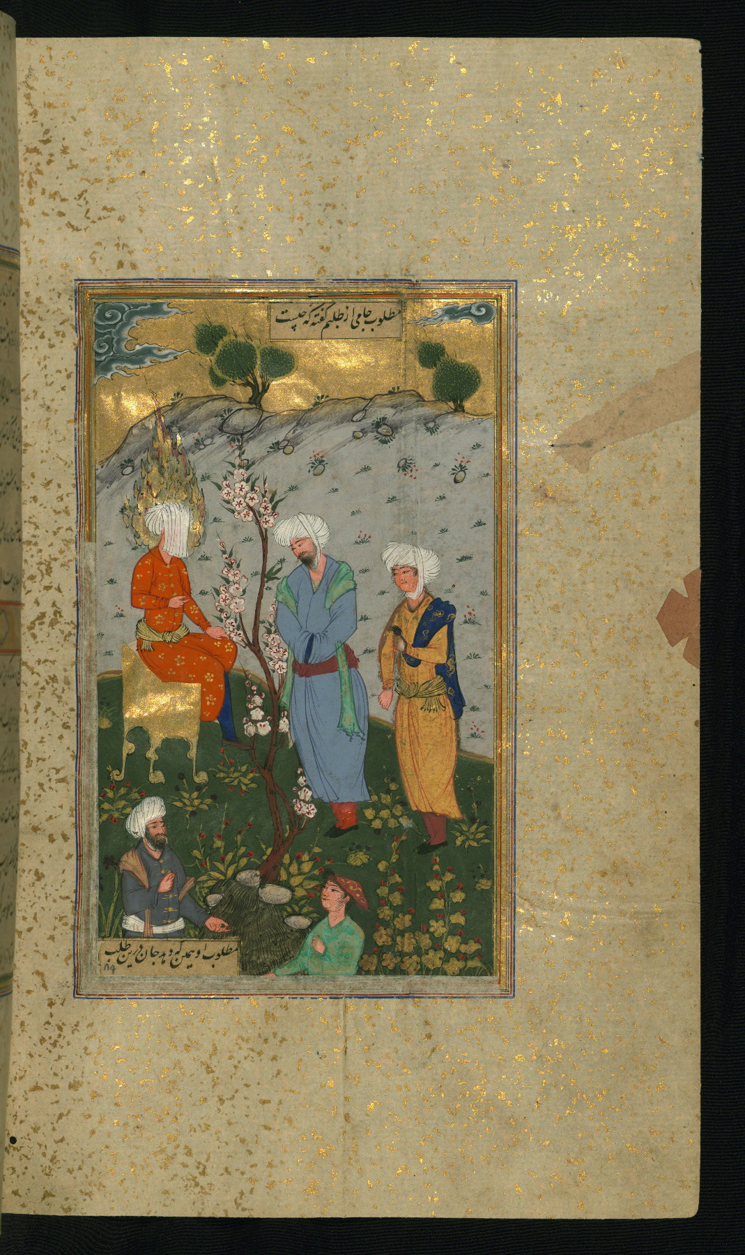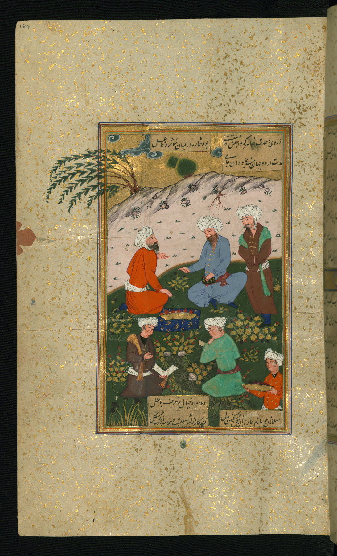 - Label: Jāmī, who is seen in the lower right corner in a brown robe, recites his poetry before others.