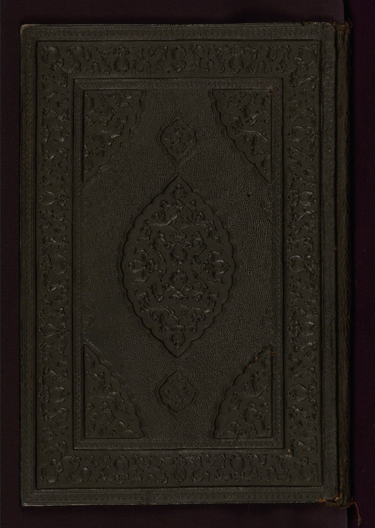 Black leather binding (with flap); stamped central lobed oval, pendants, and cornerpieces, all decorated with a cloudband motif; red doublures with central lobed oval, pendants, and cornerpieces decorated with filigree work on a blue ground; strip of marbled paper at hinges