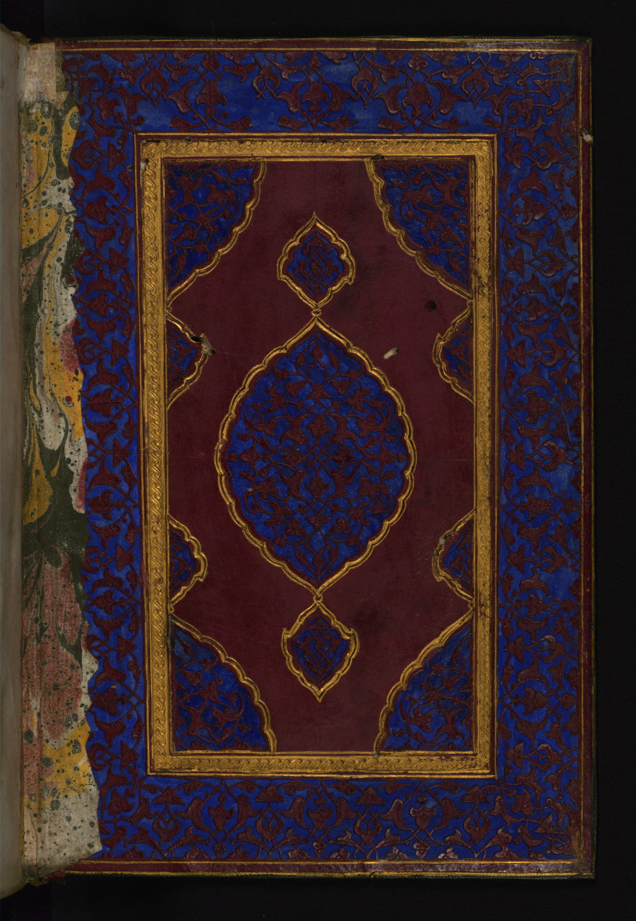 - Label: This red doublure, which is original to the manuscript, is decorated with a central lobed oval, pendants, and cornerpieces decorated with filigree work on a blue ground. A strip of marbled paper is present at the hinge.
