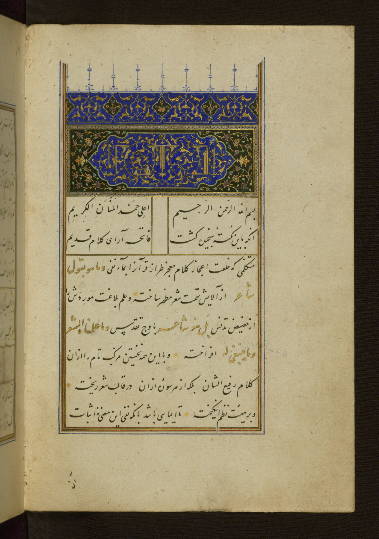 - Hand note: Written in black nastaʿlīq script; illuminated headpiece written in New Abbasid (broken cursive) style; headings and incidentals written in red, gold, and blue