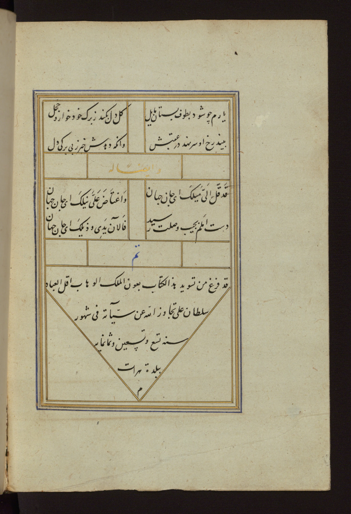 - Label: In this colophon the scribe Sulṭān ‘Alī indicates that the manuscript was completed in 899 AH / 1493-4 CE in the city of Herat, which is in present day Afghanistan. It reads as follows: qad faragha min taswīd h<ā>dh<ā> al-kitāb bi-ʿawn al-malik al-wahhāb aqall al-ʿibād /1/ Sulṭān ʿAlī tajāwaza Allāh ʿan sayyiā<ʾ>ātih fī shuhūr /2/ sanat tisʿ wa-tisʿīn wa-thamānimi<ʾ>ah /3/ bi-baldat Harāt /4/ m [=tamma] /5/