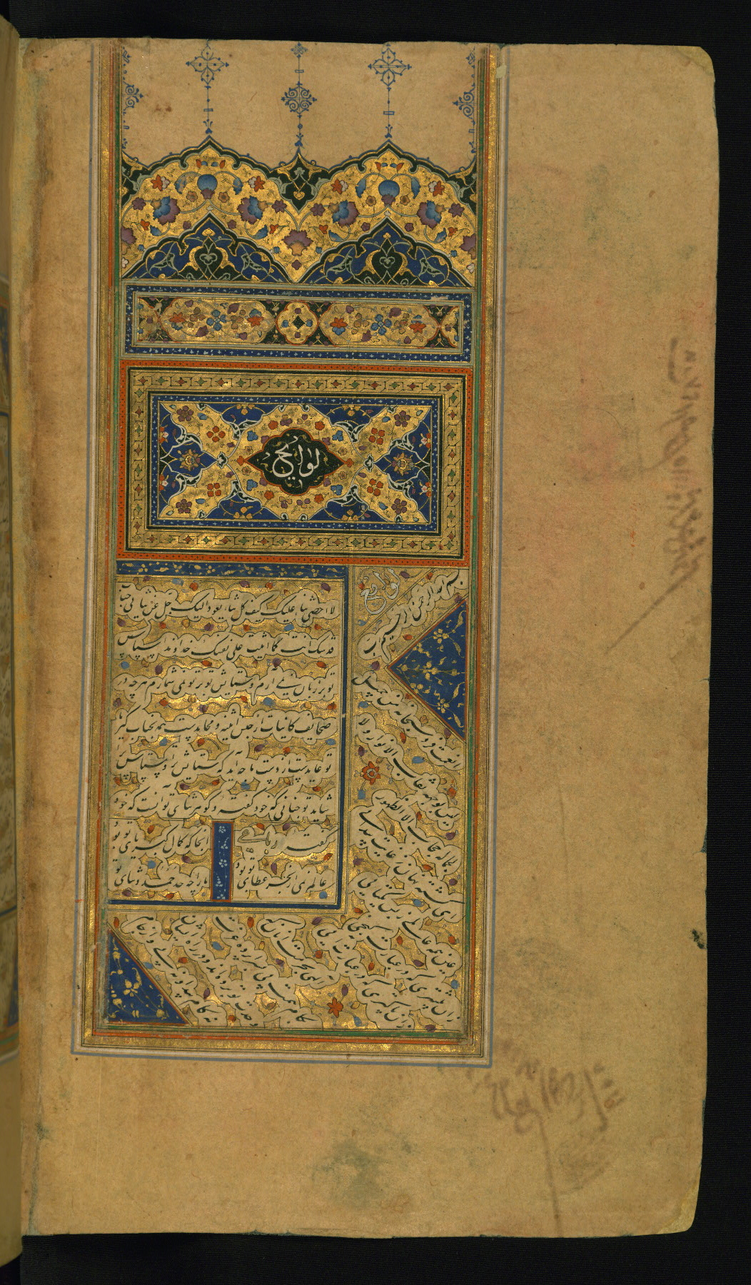 - Label: This is an illuminated incipit page bearing a titlepiece inscribed Lavāyiḥ in white tawqīʿ script. In the outer margin is inscribed the text of the second work, Lavāmiʿ.