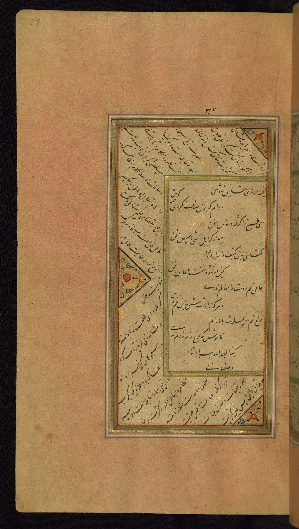 - Label: This colophon explains the nature of the work and gives the name of the calligrapher and the date of copying as Rajab 999 AH / 1591 CE. It reads: tammat hadhā [sic] al-risālah al-sharīfa[h] /1/ mushtamal [sic] ʿalá nikāt laṭīfah /2/ fī tafsīr abyāt maʿnawīyah ʿalá /3/ al-ṣadr al-Mathawī al-Maʿnawī /4/ qaddasa sirruhu al-ʿazīz Jalāl /5/ al-Dīn Muḥammad al-Rūmī ʿalayhi /6/ al-raḥmah wa-al-ghufrān /7/ ʿalá yad al-kātib al-faqīr Bābā Sāh bn Sulṭān /8/ ʿAlī Iṣfahānī /9/ fī shahr Rajab al-murajjab /10/ sanat tisʿ wa-tisʿīn wa-tisʿimi<ʾ>ah /11/ al-hijrīyah al-nabawīyah /12/