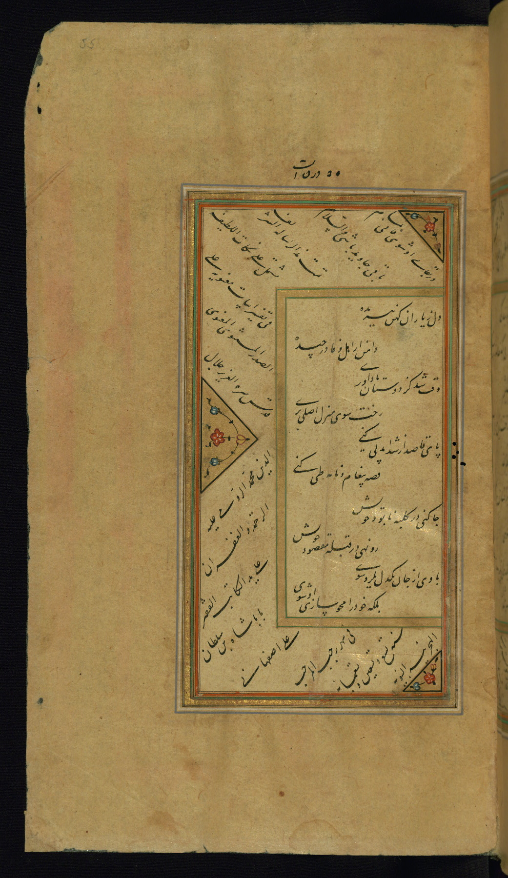 - Hand note: Written in nastaʿlīq script in black with incidentals in gold ink