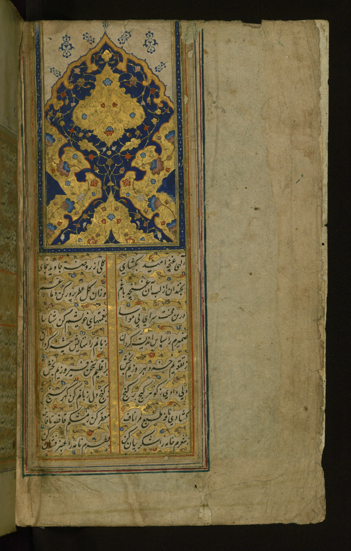 This manuscript is an illuminated and illustrated copy of the famous story of Joseph and Potiphar's wife (Yūsuf va Zulaykhā) by Nūr al-Dīn Jāmī (d. 898 AH / 1492 CE), executed in the tenth century AH / sixteenth CE in Safavid Iran. The text is written in black nasta‘līq script and begins with a double-page illuminated incipit with headpiece (fol. 1b-2a). The manuscript contains three illustrations (fols. 50b, 116a, and 150b). The dark brown goatskin binding, which is original to the manuscript, has panel-stamped designs and red doublures with gold filigree work over colored paper.