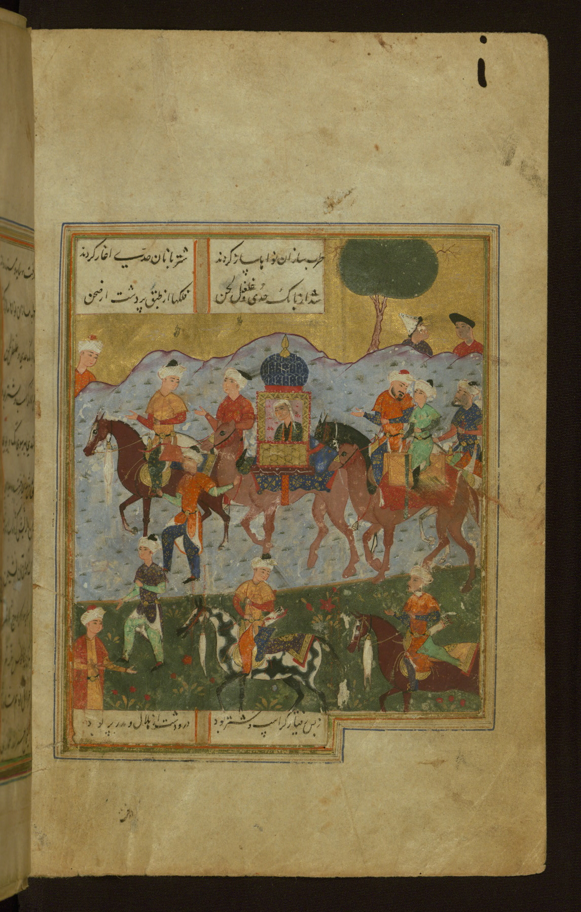 - Label: This illustration depicts Zulaykha in a blue-domed litter on a camel led by a cameleer. The retinue is entering the capital of Egypt.