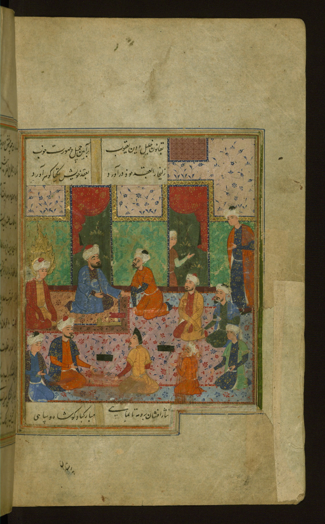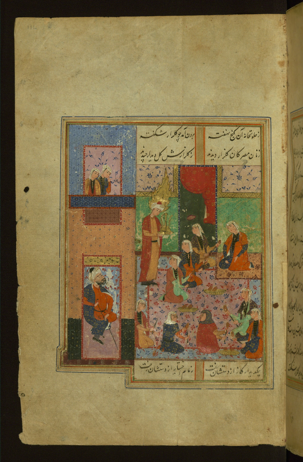 - Label: Once Yūsuf, depicted here with a flaming halo and seated at the left side of the composition, received divine approval to marry Zulaykhā, he organized a banquet to which he invited the Egyptian king and officials. The banquet takes place in an interior defined by two curtained windows and tiled walls with floral decoration.