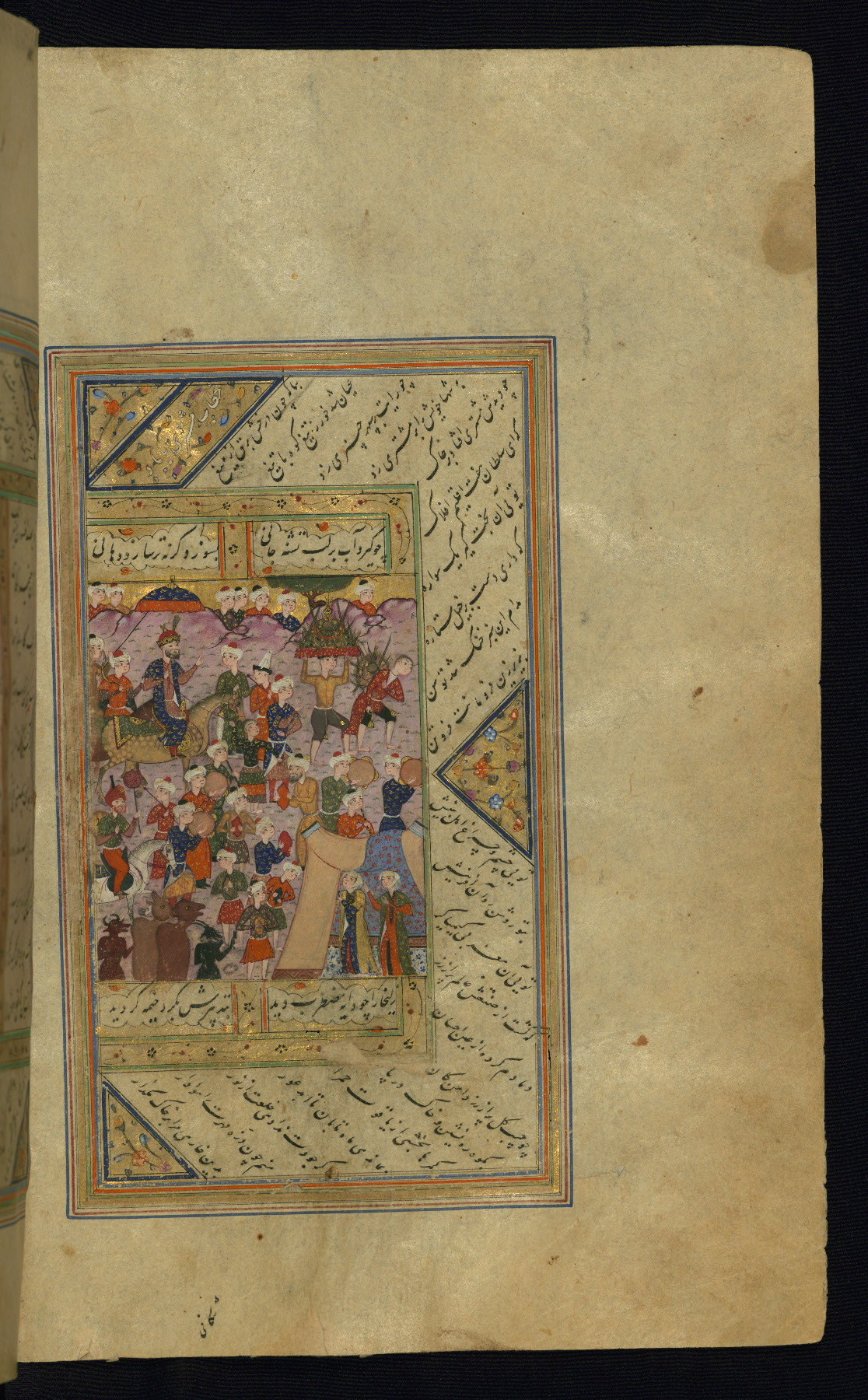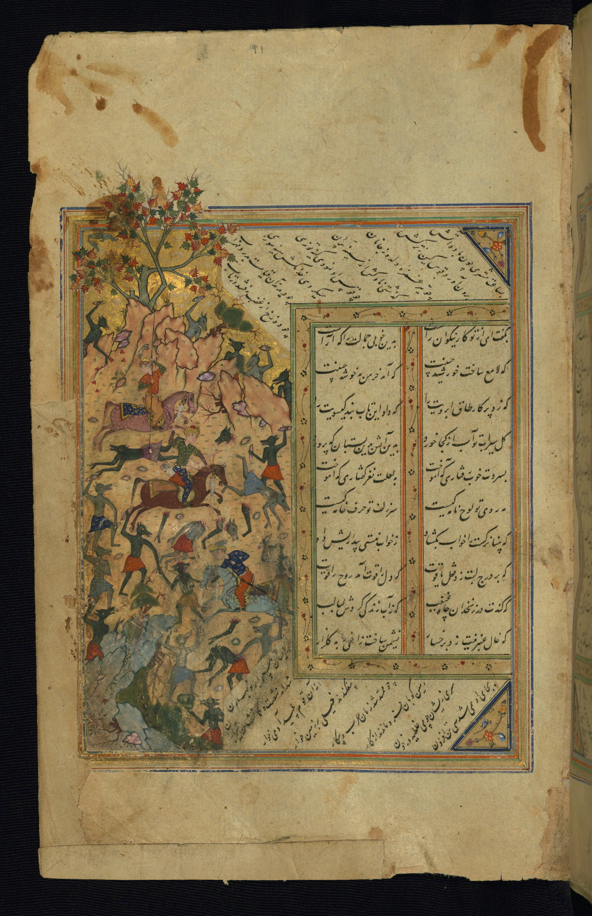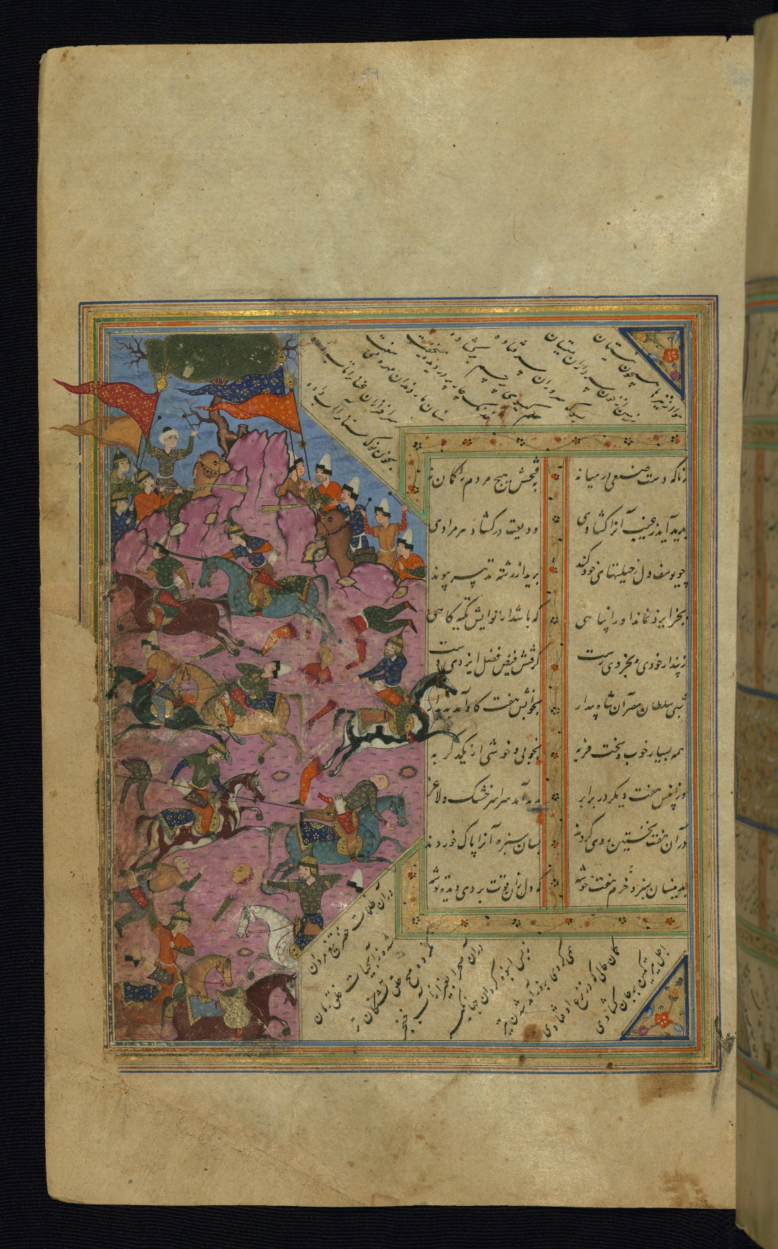 - Label: On the left side of this page Qarā Khān, king of Samarqand, is defeated by Mihr, who fights on the side of King Kayvān, Nāhīd’s father.