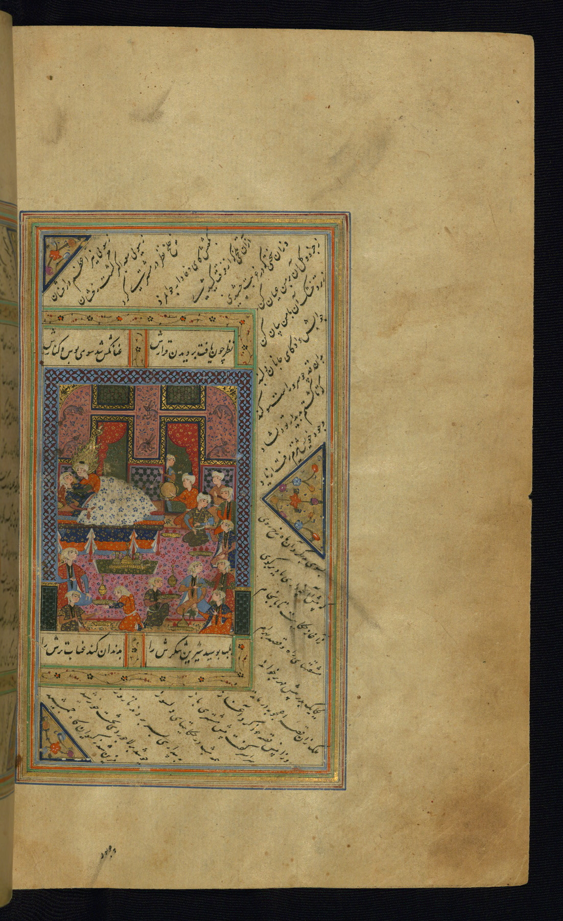 This illuminated and illustrated Safavid manuscript, executed in Safavid Iran in the tenth century AH / sixteenth CE, contains two poetical works: Yūsuf va Zulaykhā by Nūr al-Dīn Jāmī (d. 898 AH / 1492 CE) and Mihr va Mushtarī by Muḥammad ibn Aḥmad ‘Aṣṣār Tabrīzī (d. 784 AH / 1382 CE). The two texts can be read side by side on the same page, either written horizontally or obliquely. There are four paintings illustrating the text (fols. 58b, 91a, 159a, and 180b). The brown leather binding with dentelle-style decoration in multi-colored filigree work may date to the tenth century AH / sixteenth CE, although it is unlikely to be original to the manuscript.