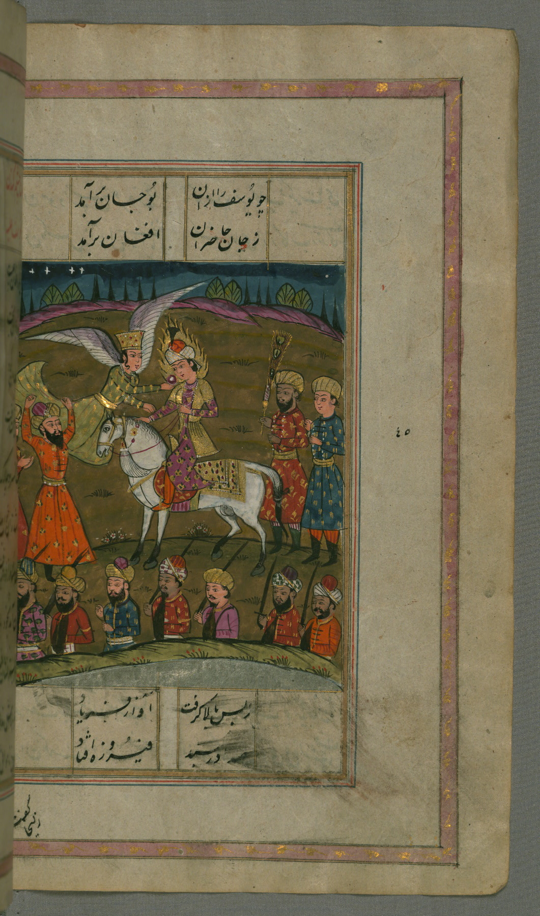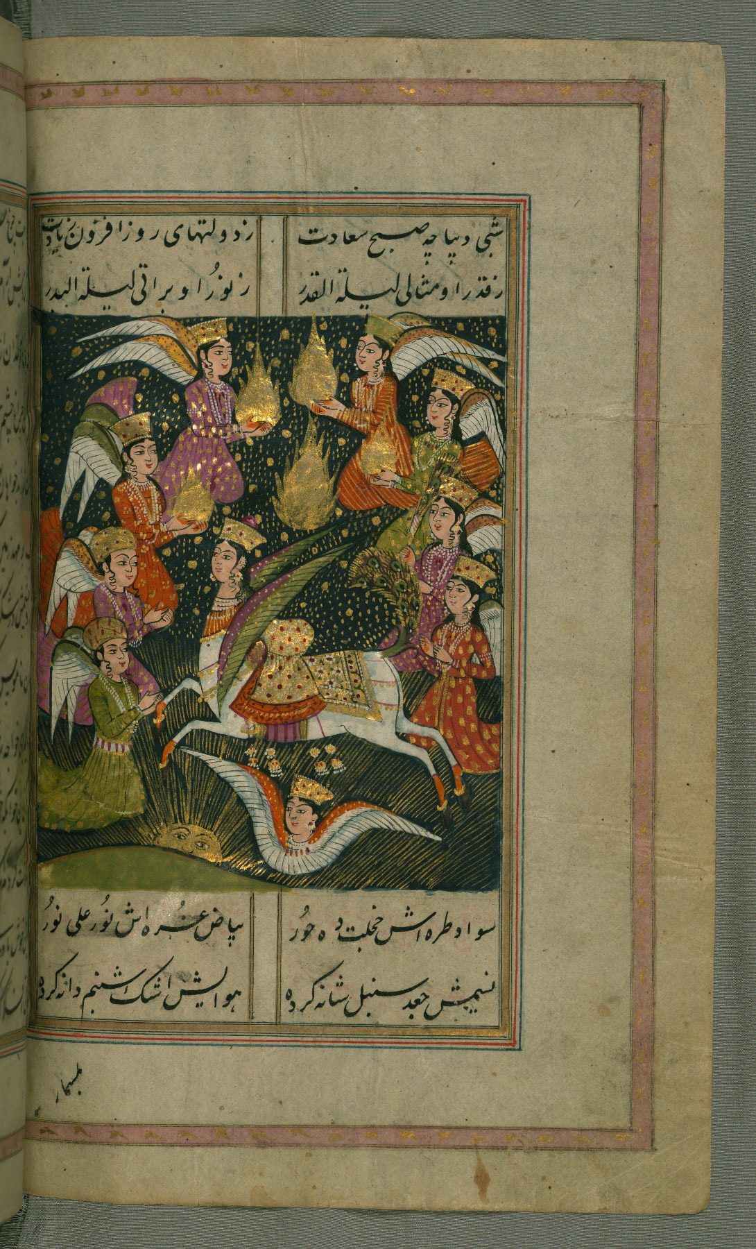 - Decoration note: Forty-seven illustrations; double-page illuminated incipit with headpiece inscribed with the doxological formula (basmalah), cloud-bands, and a border