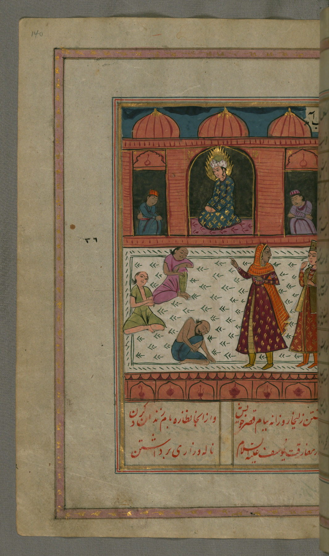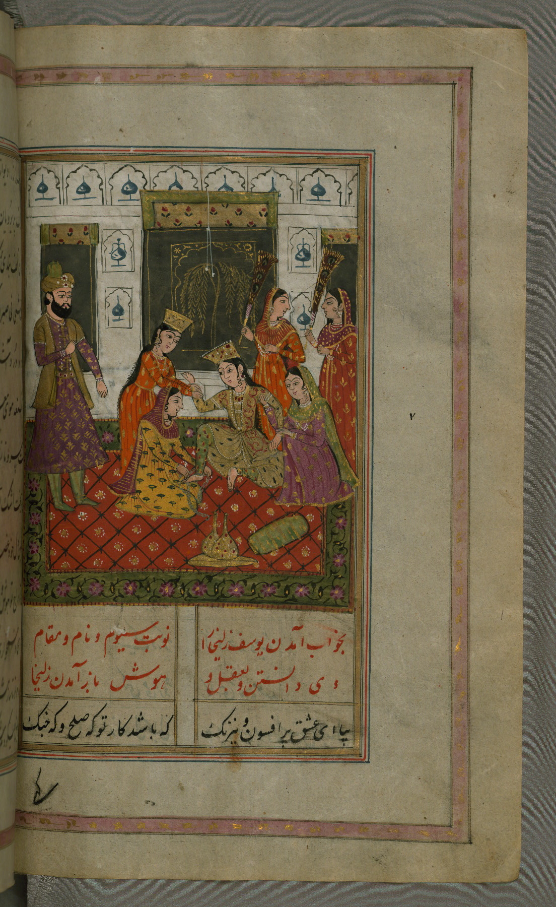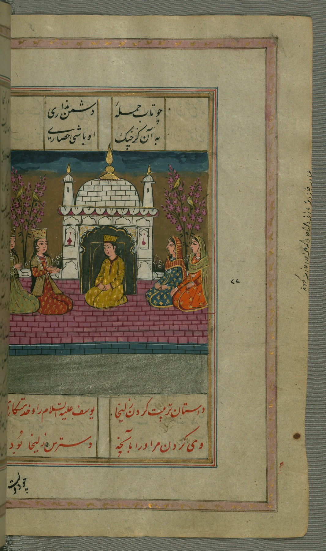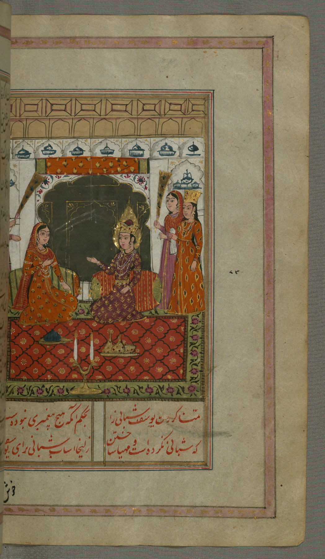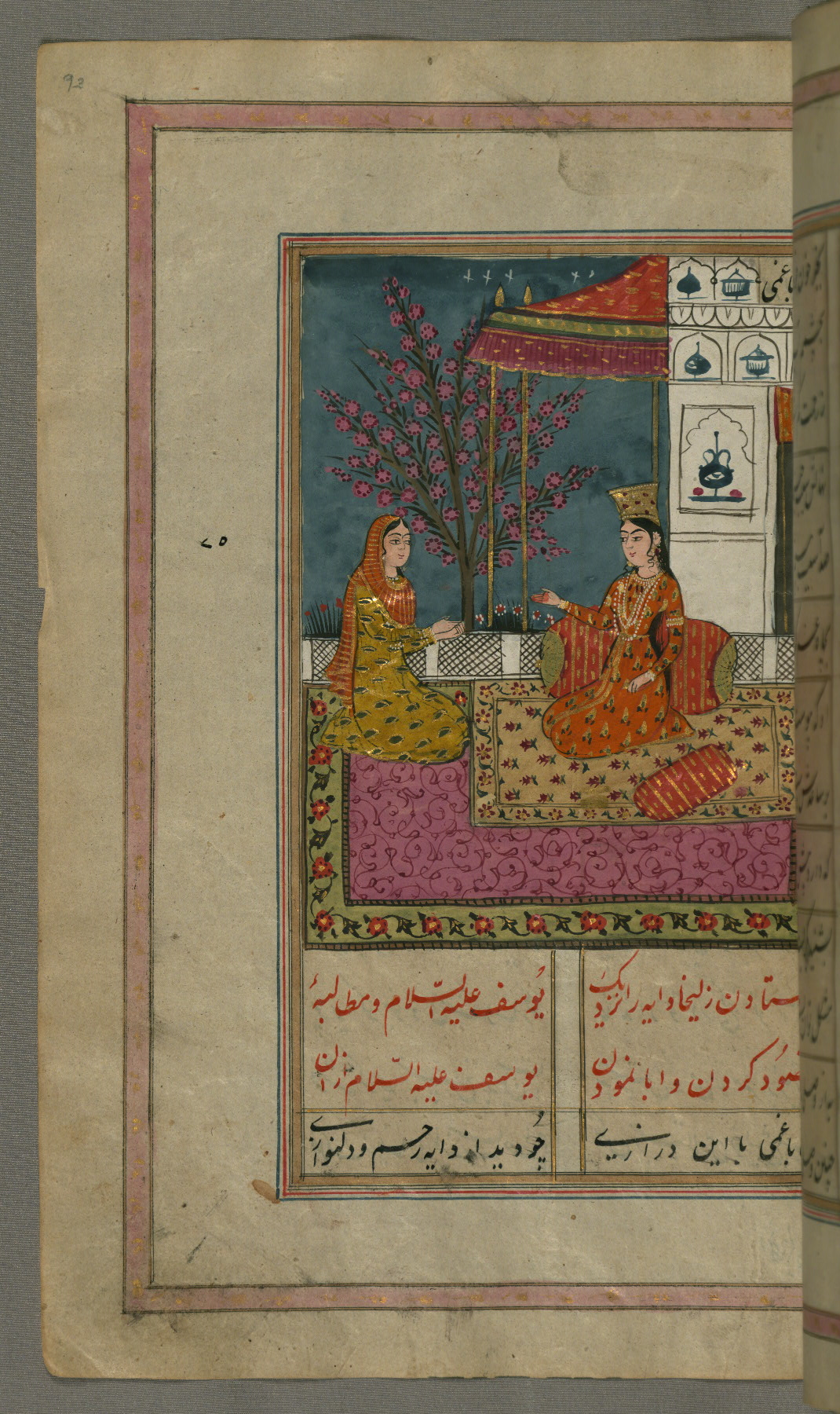 This is an illuminated and illustrated copy of the famous story of Joseph and the Potiphar's wife (Yūsuf va Zulaykhā) by Jāmī (d. 898 AH / 1492 CE). The manuscript was written in India in the late twelfth century AH / eighteenth CE in black nastaʿlīq script. There are forty-seven paintings illustrating the text. The lacquer binding with floral decoration is attributable to the thirteenth century AH / nineteenth CE.