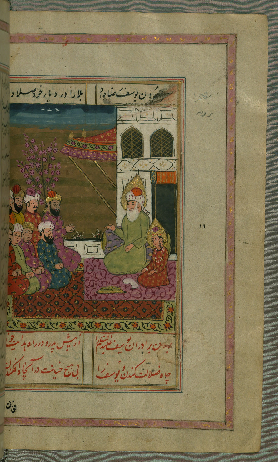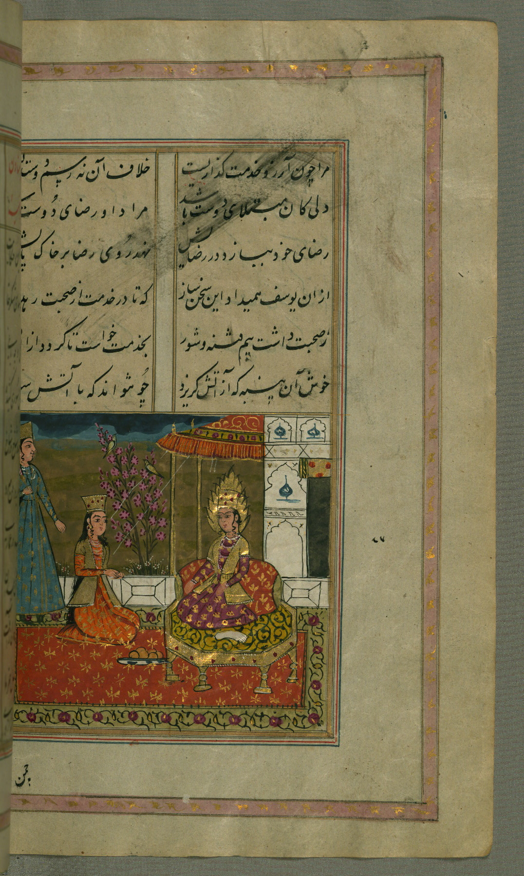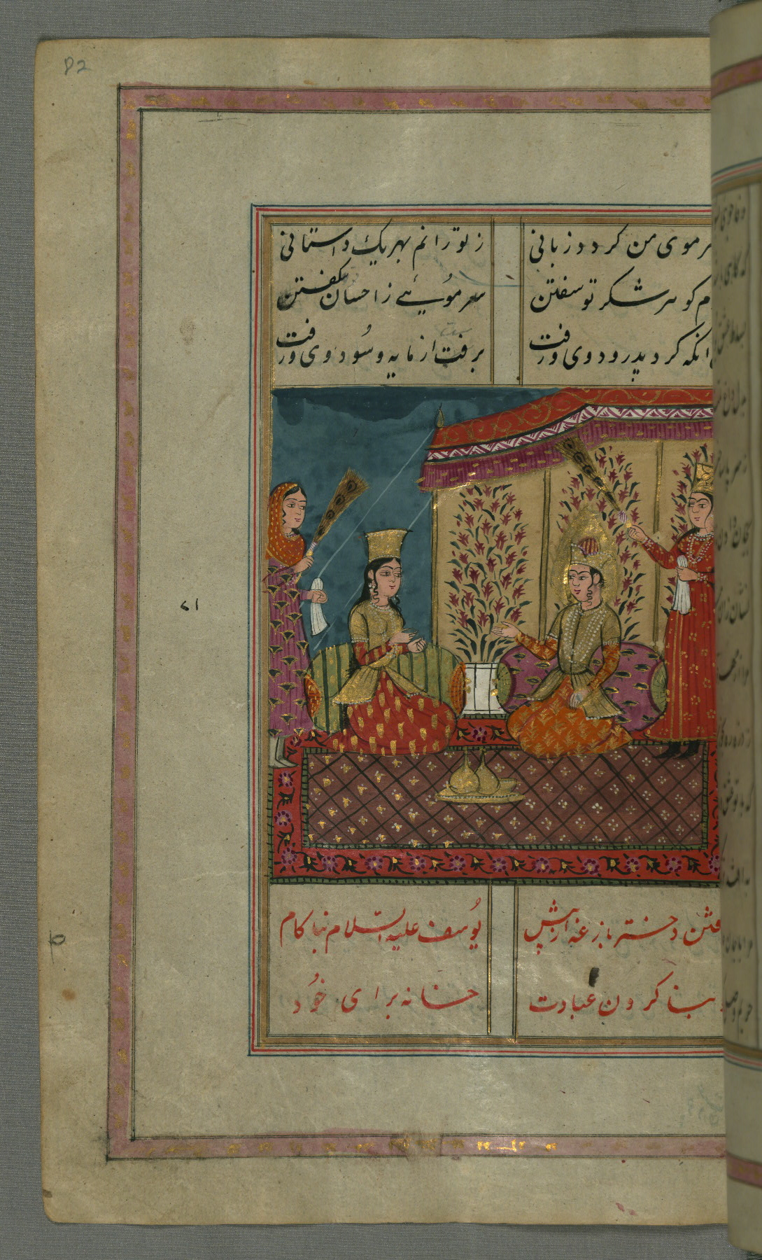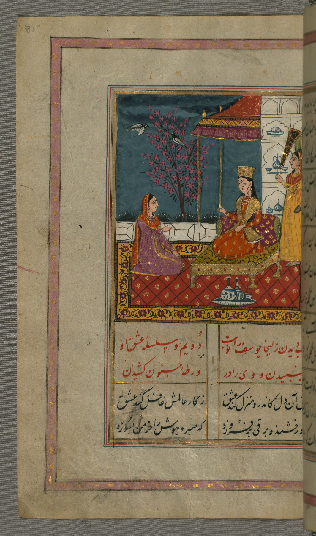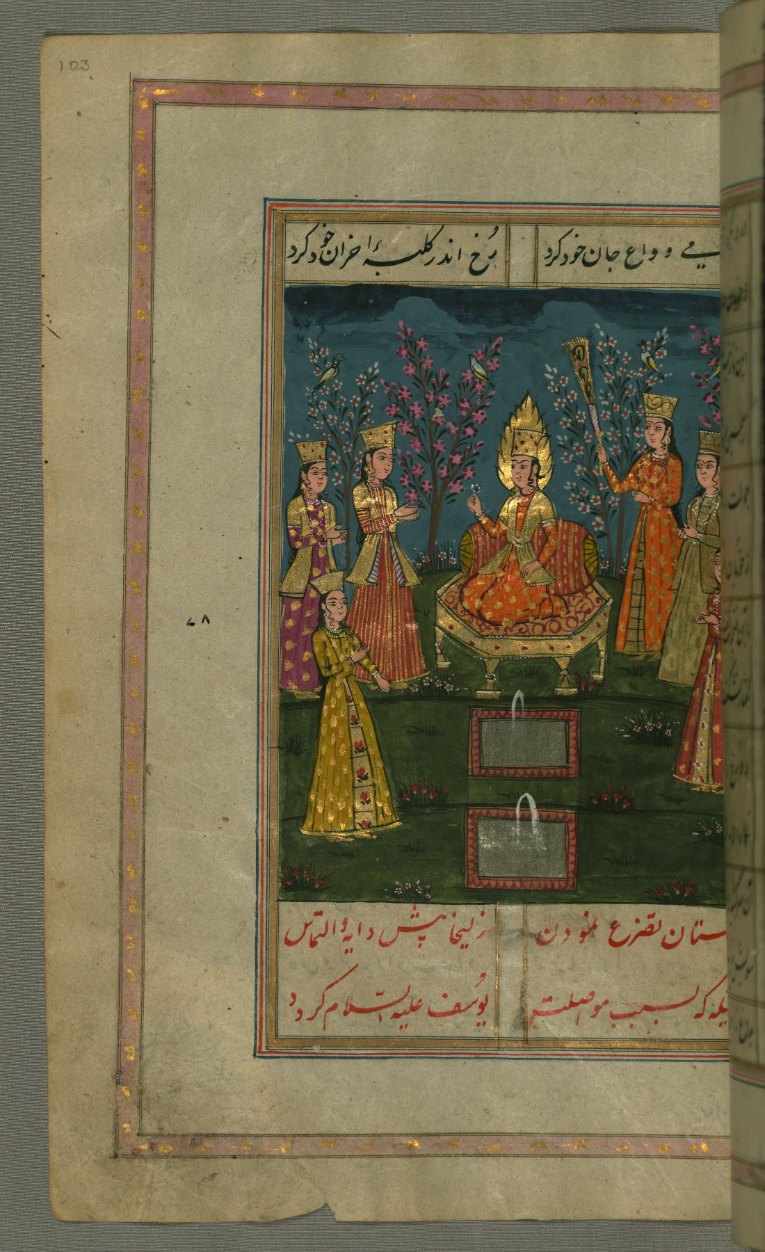This is an illuminated and illustrated copy of the famous story of Joseph and the Potiphar's wife (Yūsuf va Zulaykhā) by Jāmī (d. 898 AH / 1492 CE). The manuscript was written in India in the late twelfth century AH / eighteenth CE in black nastaʿlīq script. There are forty-seven paintings illustrating the text. The lacquer binding with floral decoration is attributable to the thirteenth century AH / nineteenth CE.