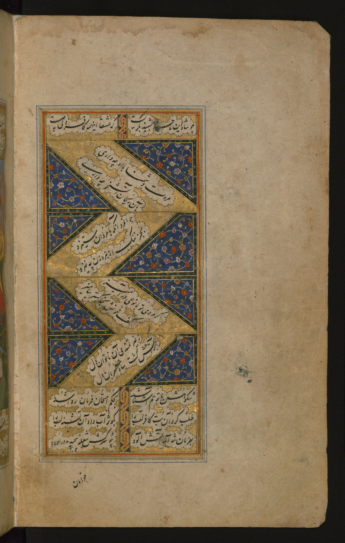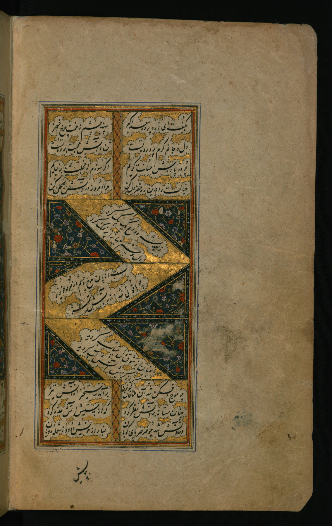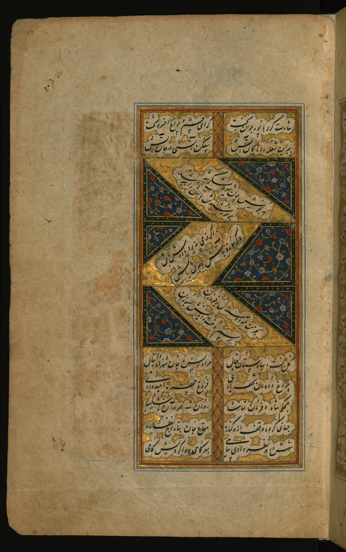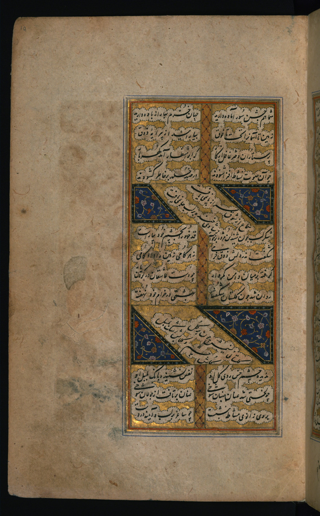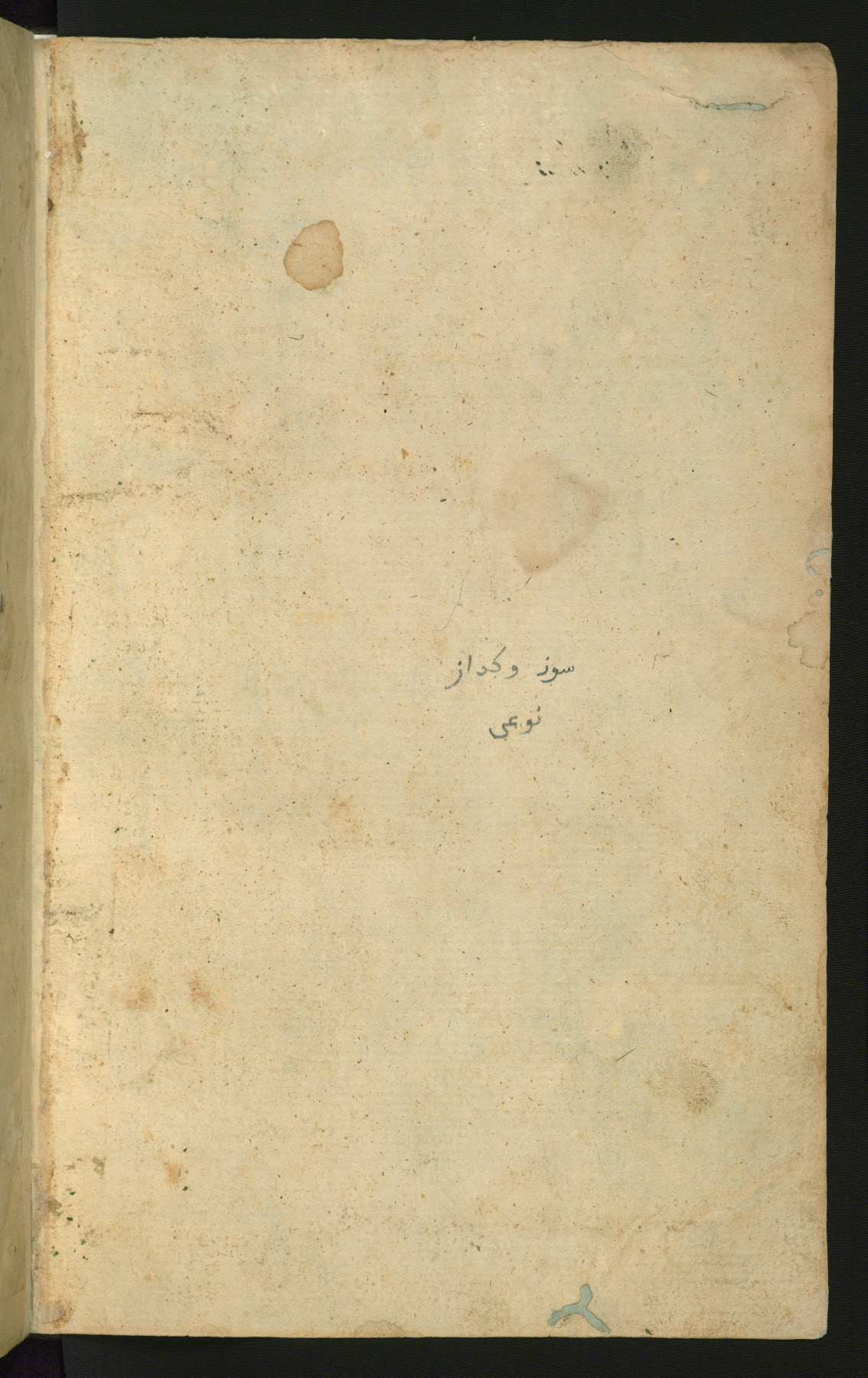 This is an illuminated and illustrated copy of the poem Sūz va gudāz (Burning and melting) by Nawʿī Khabūshānī (d. 1019 AH / 1610 CE), which recounts the love story of a Hindu girl who burns herself on the funeral pyre of her betrothed. The codex was written in nastaʿlīq in black ink by Ibn Sayyid Murād al-Ḥusaynī and illustrated by Muḥammad ʿAlī Mashhadī in 1068 AH / 1657 CE. According to the colophon, Ibn Sayyid Murād al-Ḥusaynī copied the manuscript for the painter Muḥammad ʿAlī, the “Mani of the time,” as a “souvenir.” The fact that the manuscript was produced for one of the most prolific artists of seventeenth-century Iran makes it a highly significant document. It opens with an illuminated incipit with headpiece (fol. 1b) and closes with an illuminated tailpiece with colophon (fol. 21b). Text pages have interlinear illumination and small rectangular and triangular pieces with polychrome floral and scrolling vine motifs. There are eight miniatures in a style associated with the Safavid centers of artistic production of Mashhad and Isfahan (fols. 5a, 9a, 10b, 13a, 14a, 16a, 17b, and 19b).