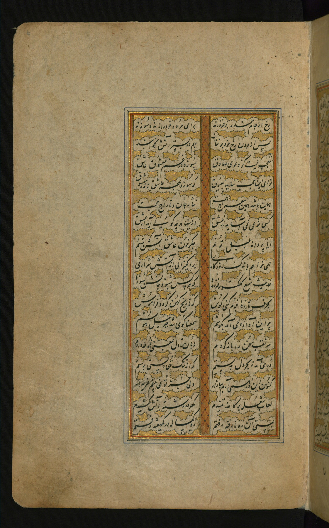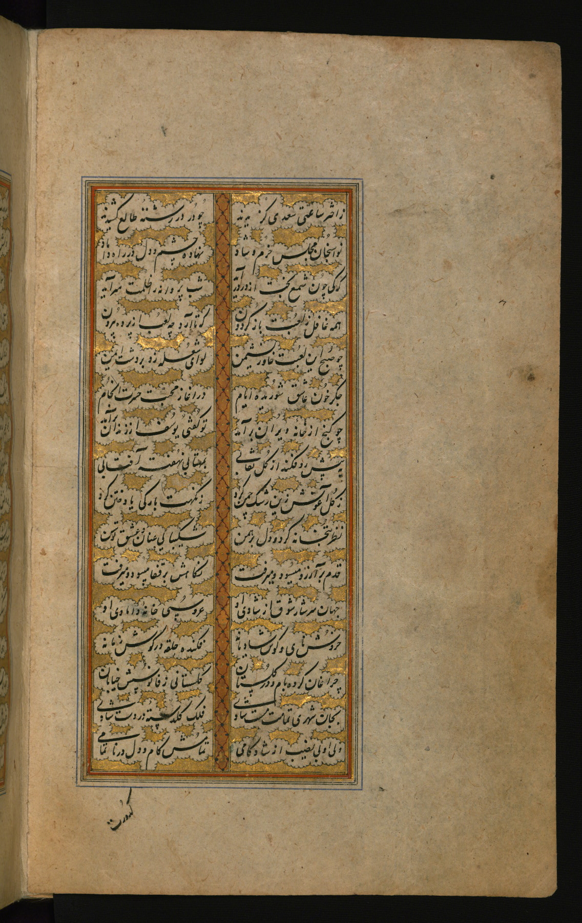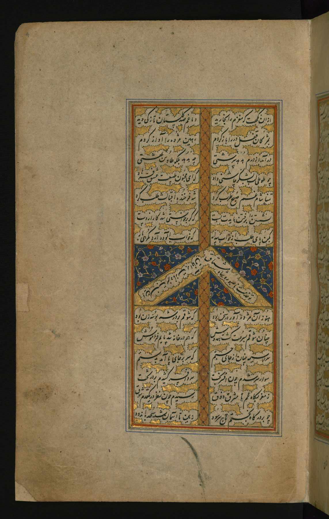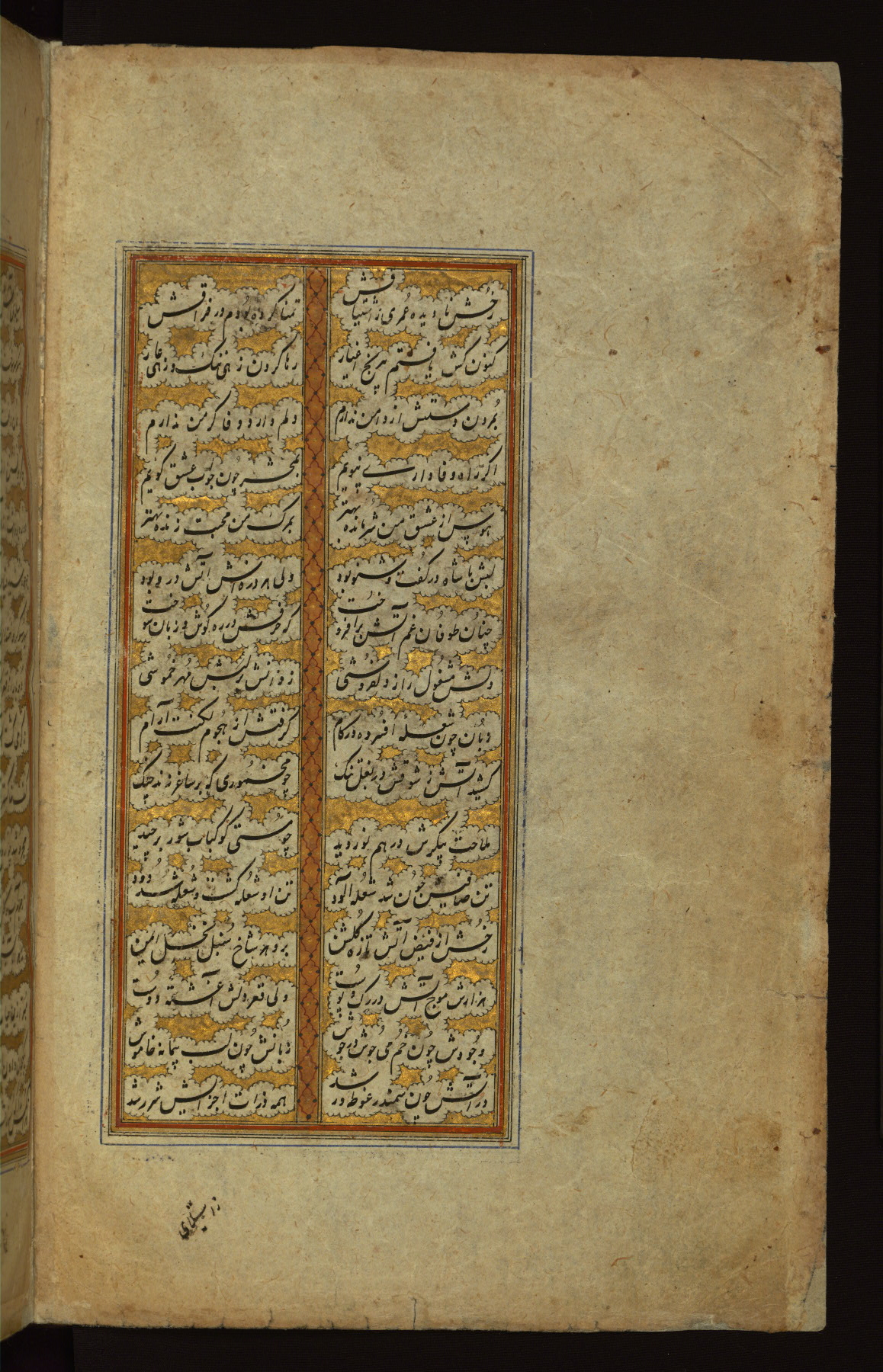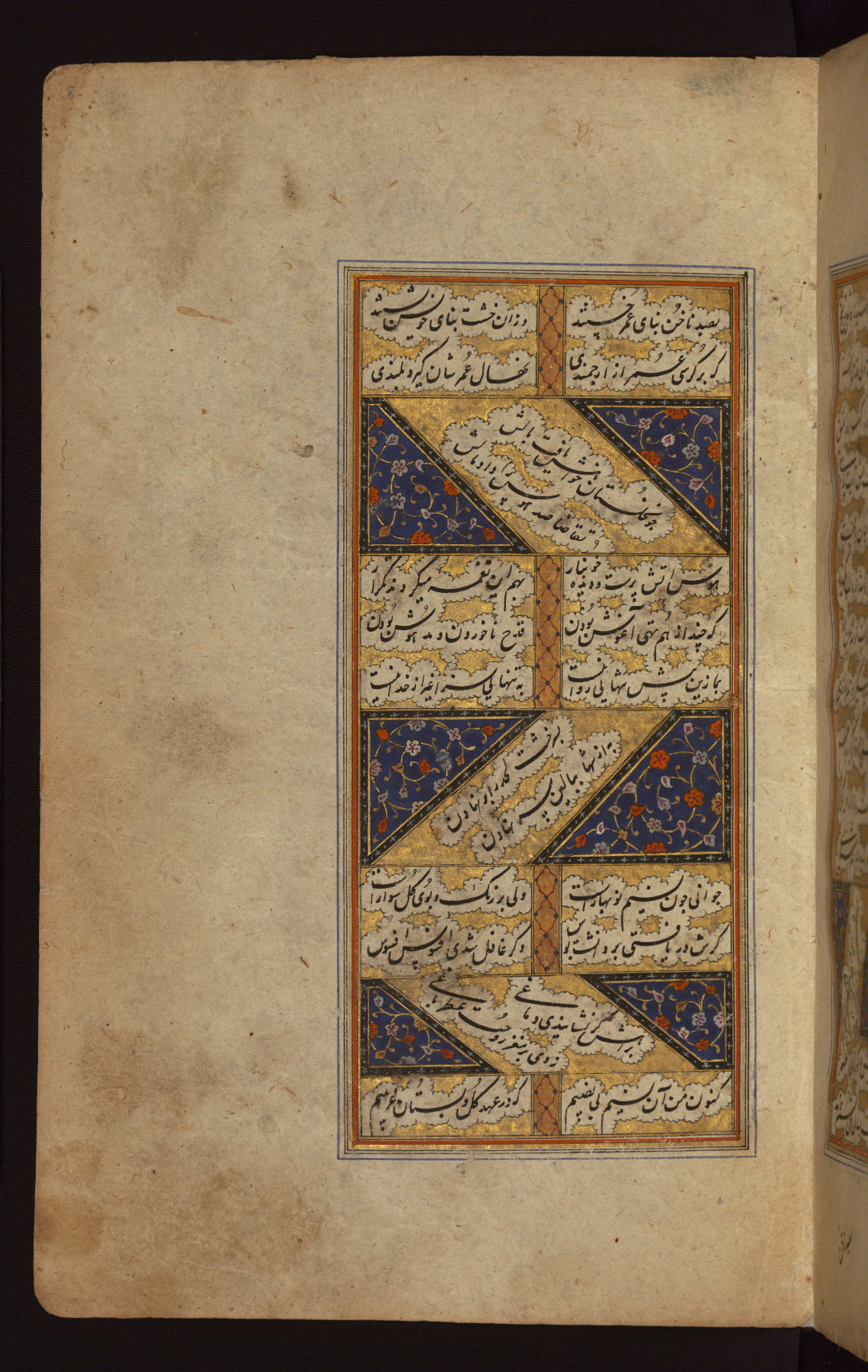 This is an illuminated and illustrated copy of the poem Sūz va gudāz (Burning and melting) by Nawʿī Khabūshānī (d. 1019 AH / 1610 CE), which recounts the love story of a Hindu girl who burns herself on the funeral pyre of her betrothed. The codex was written in nastaʿlīq in black ink by Ibn Sayyid Murād al-Ḥusaynī and illustrated by Muḥammad ʿAlī Mashhadī in 1068 AH / 1657 CE. According to the colophon, Ibn Sayyid Murād al-Ḥusaynī copied the manuscript for the painter Muḥammad ʿAlī, the “Mani of the time,” as a “souvenir.” The fact that the manuscript was produced for one of the most prolific artists of seventeenth-century Iran makes it a highly significant document. It opens with an illuminated incipit with headpiece (fol. 1b) and closes with an illuminated tailpiece with colophon (fol. 21b). Text pages have interlinear illumination and small rectangular and triangular pieces with polychrome floral and scrolling vine motifs. There are eight miniatures in a style associated with the Safavid centers of artistic production of Mashhad and Isfahan (fols. 5a, 9a, 10b, 13a, 14a, 16a, 17b, and 19b).