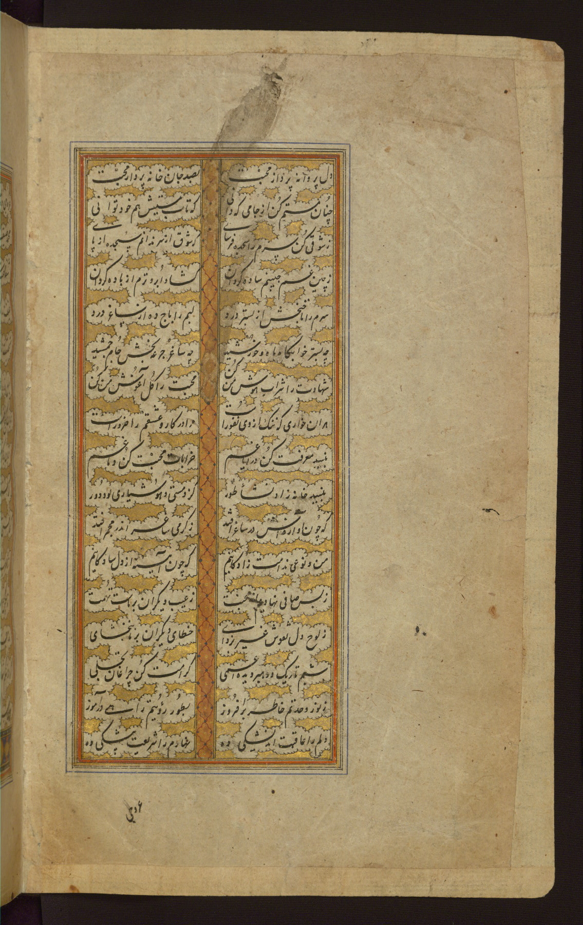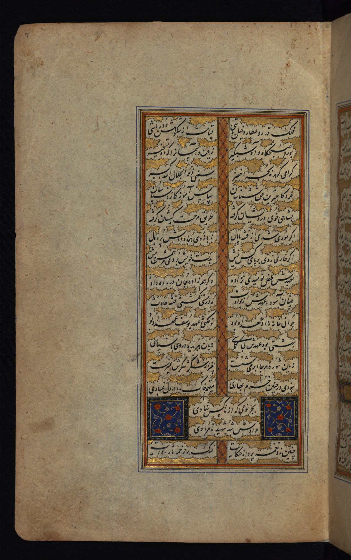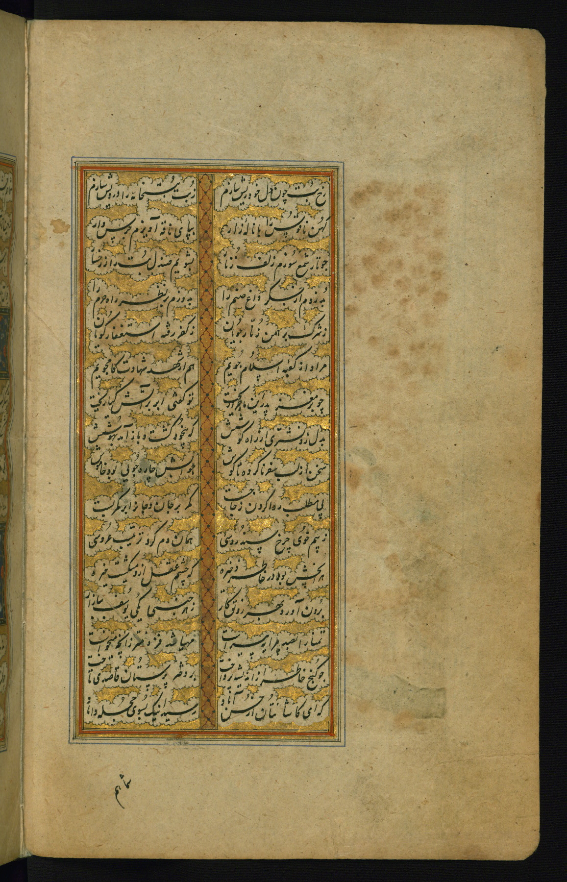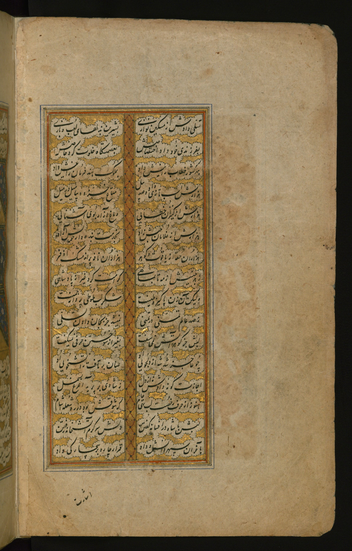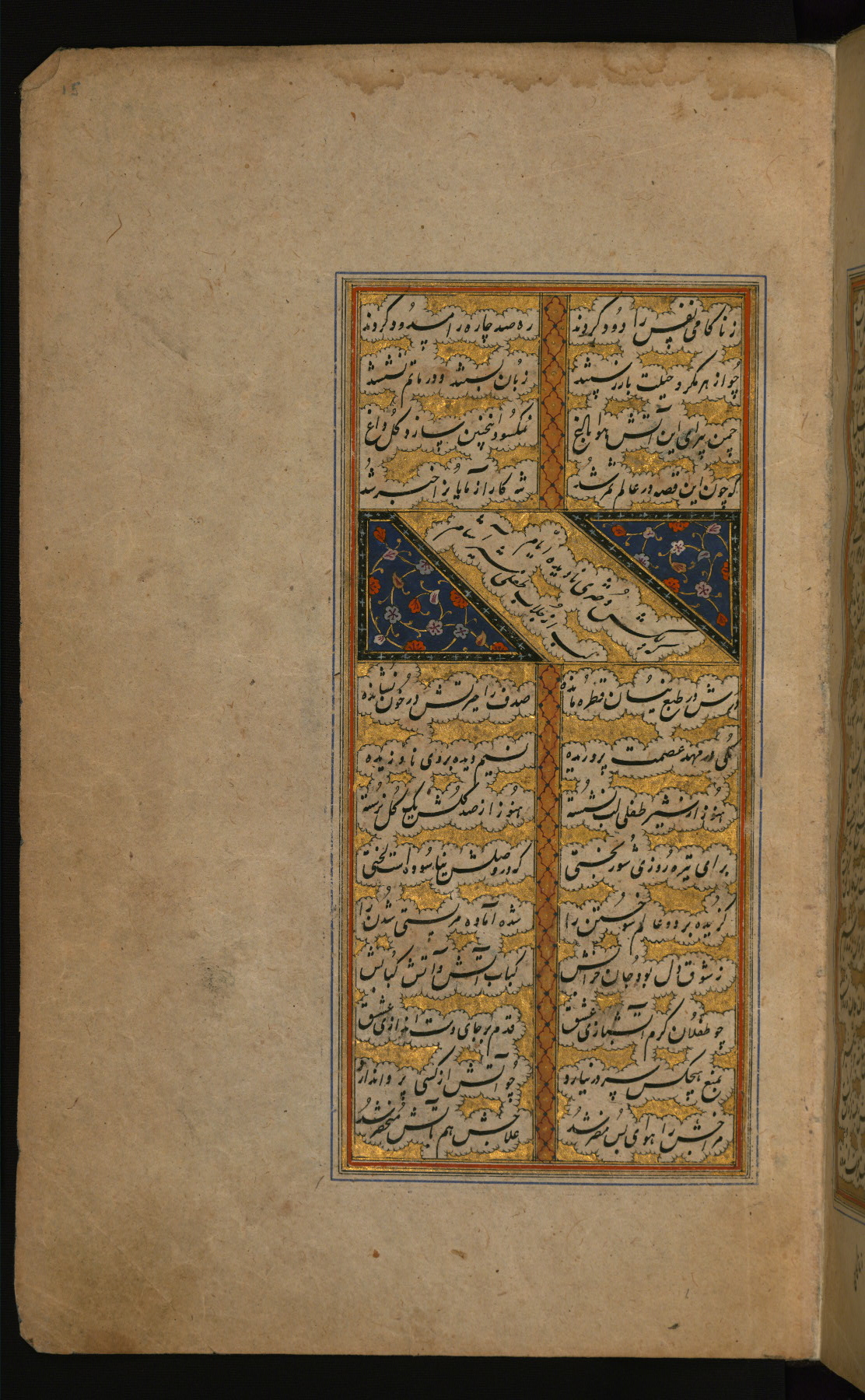 This is an illuminated and illustrated copy of the poem Sūz va gudāz (Burning and melting) by Nawʿī Khabūshānī (d. 1019 AH / 1610 CE), which recounts the love story of a Hindu girl who burns herself on the funeral pyre of her betrothed. The codex was written in nastaʿlīq in black ink by Ibn Sayyid Murād al-Ḥusaynī and illustrated by Muḥammad ʿAlī Mashhadī in 1068 AH / 1657 CE. According to the colophon, Ibn Sayyid Murād al-Ḥusaynī copied the manuscript for the painter Muḥammad ʿAlī, the “Mani of the time,” as a “souvenir.” The fact that the manuscript was produced for one of the most prolific artists of seventeenth-century Iran makes it a highly significant document. It opens with an illuminated incipit with headpiece (fol. 1b) and closes with an illuminated tailpiece with colophon (fol. 21b). Text pages have interlinear illumination and small rectangular and triangular pieces with polychrome floral and scrolling vine motifs. There are eight miniatures in a style associated with the Safavid centers of artistic production of Mashhad and Isfahan (fols. 5a, 9a, 10b, 13a, 14a, 16a, 17b, and 19b).