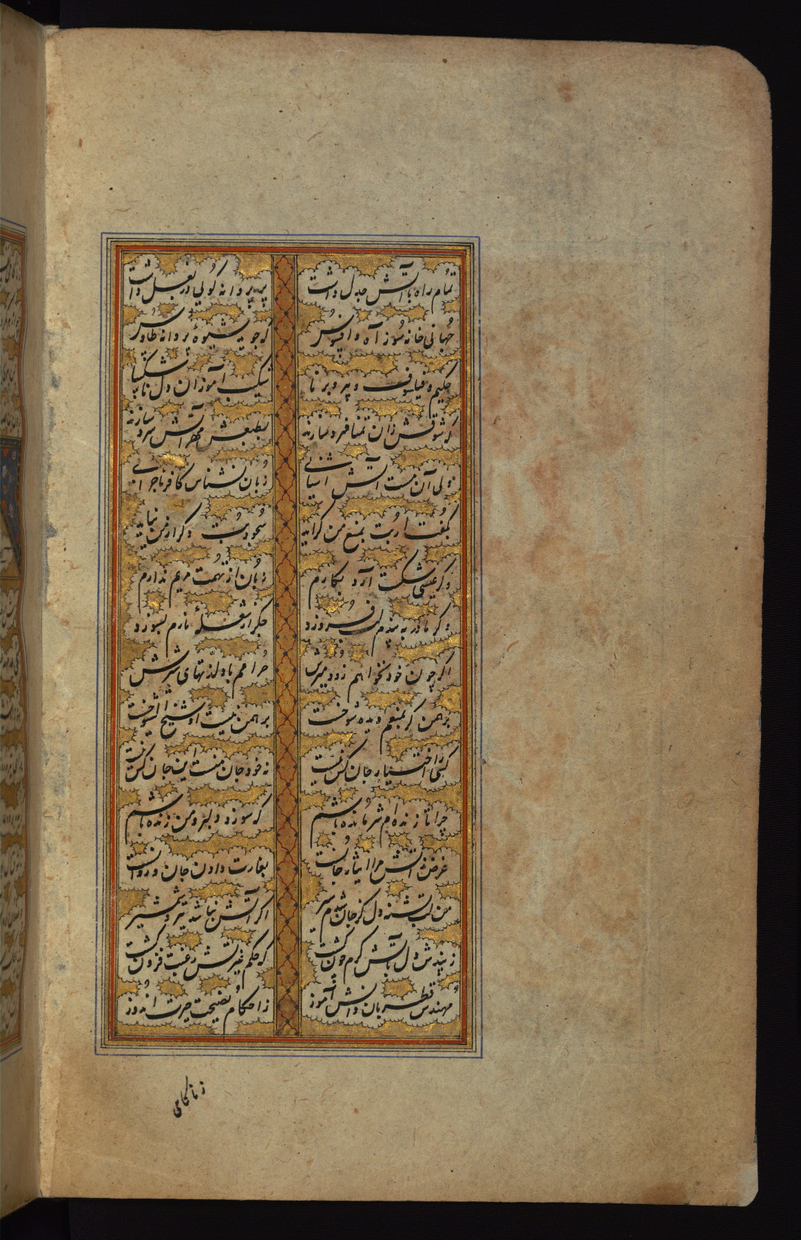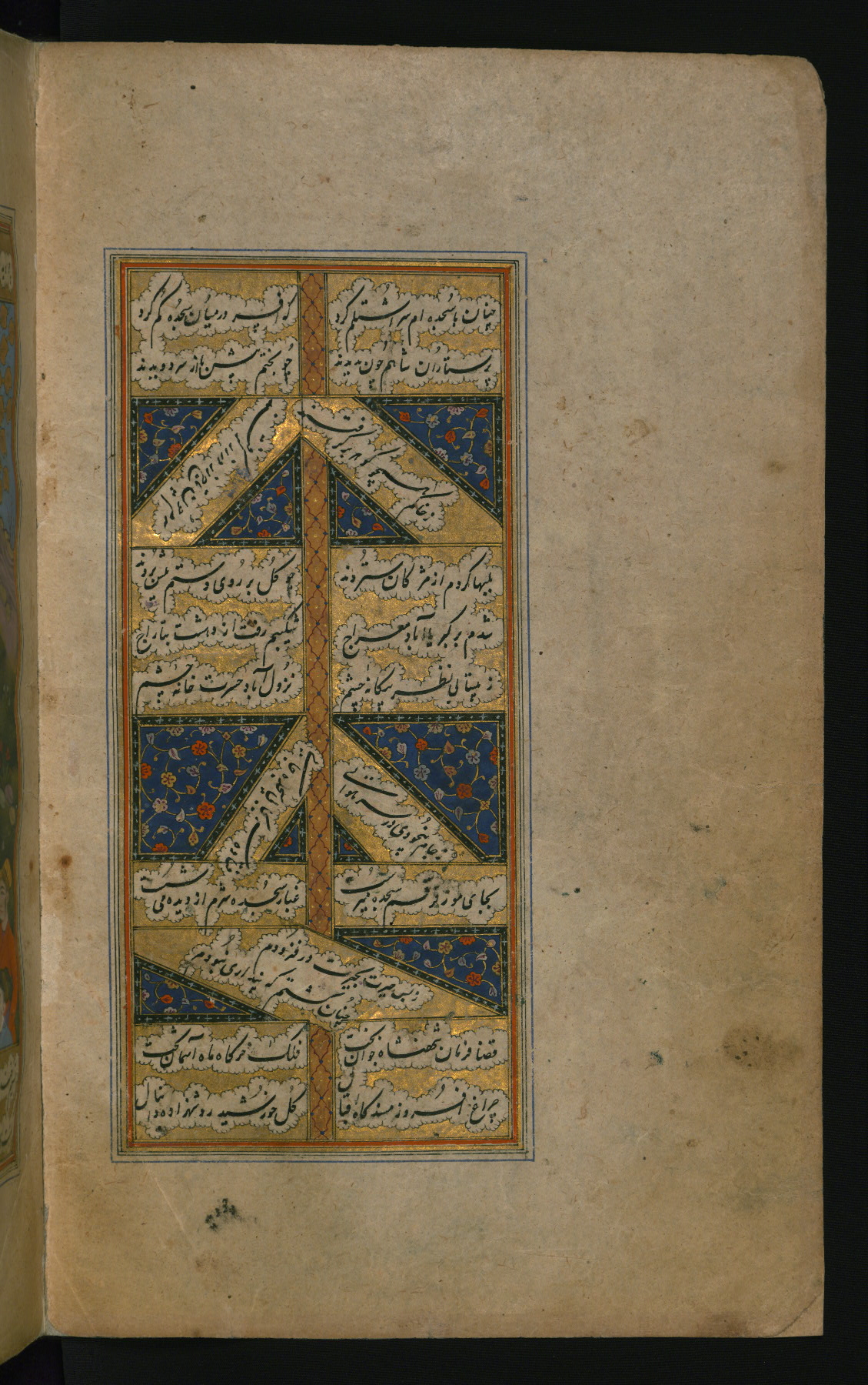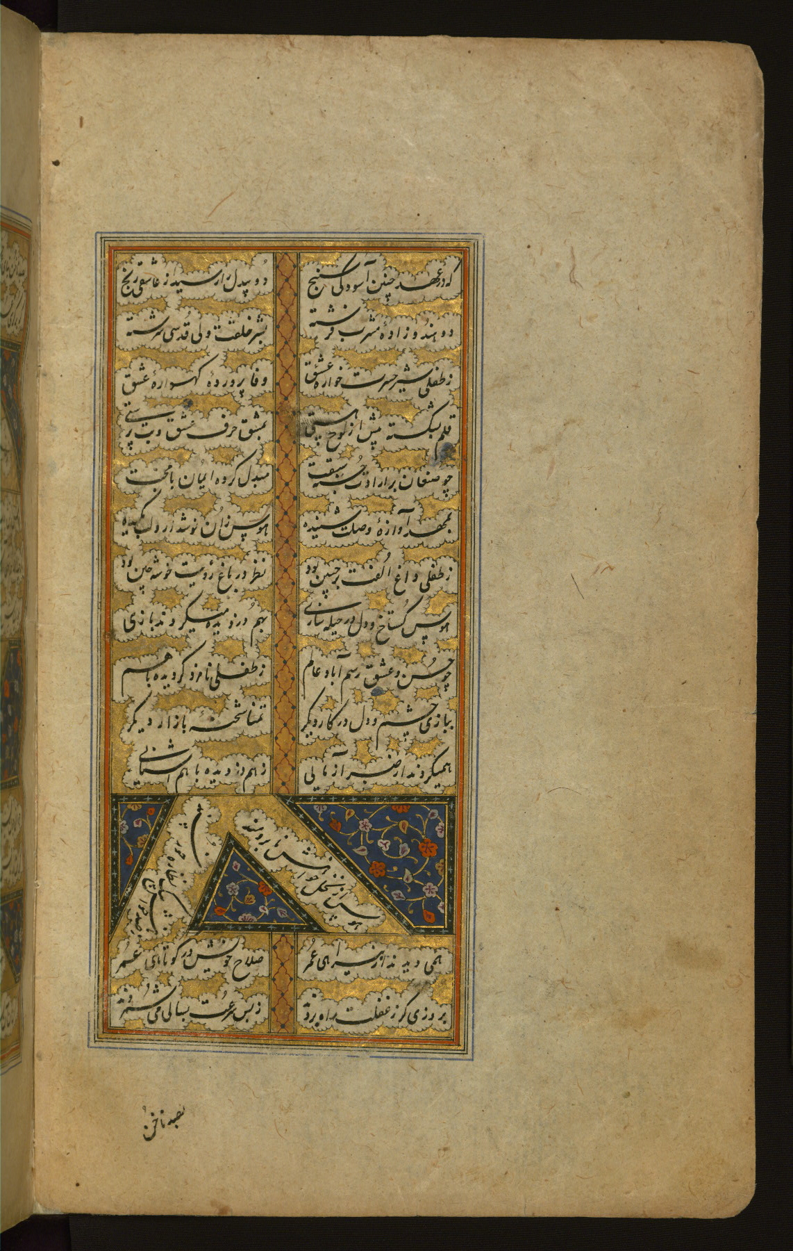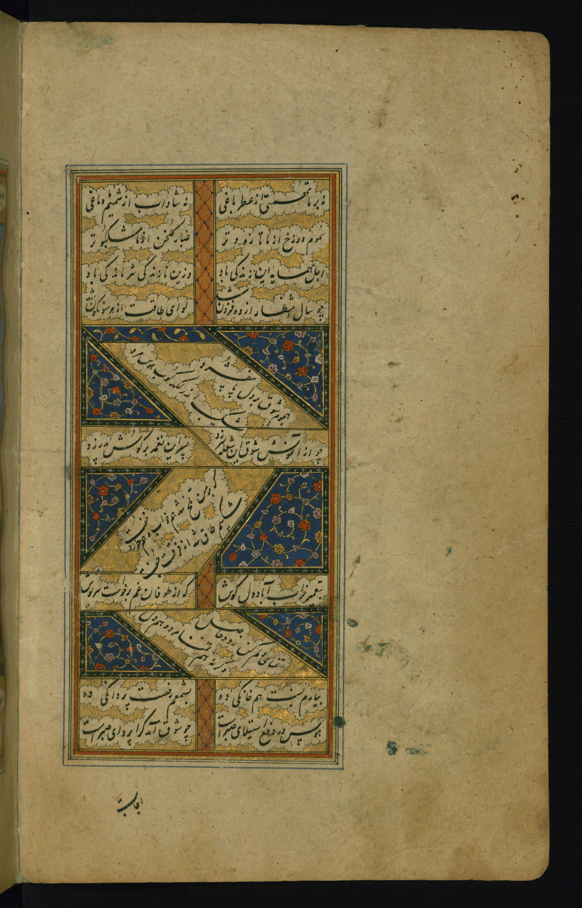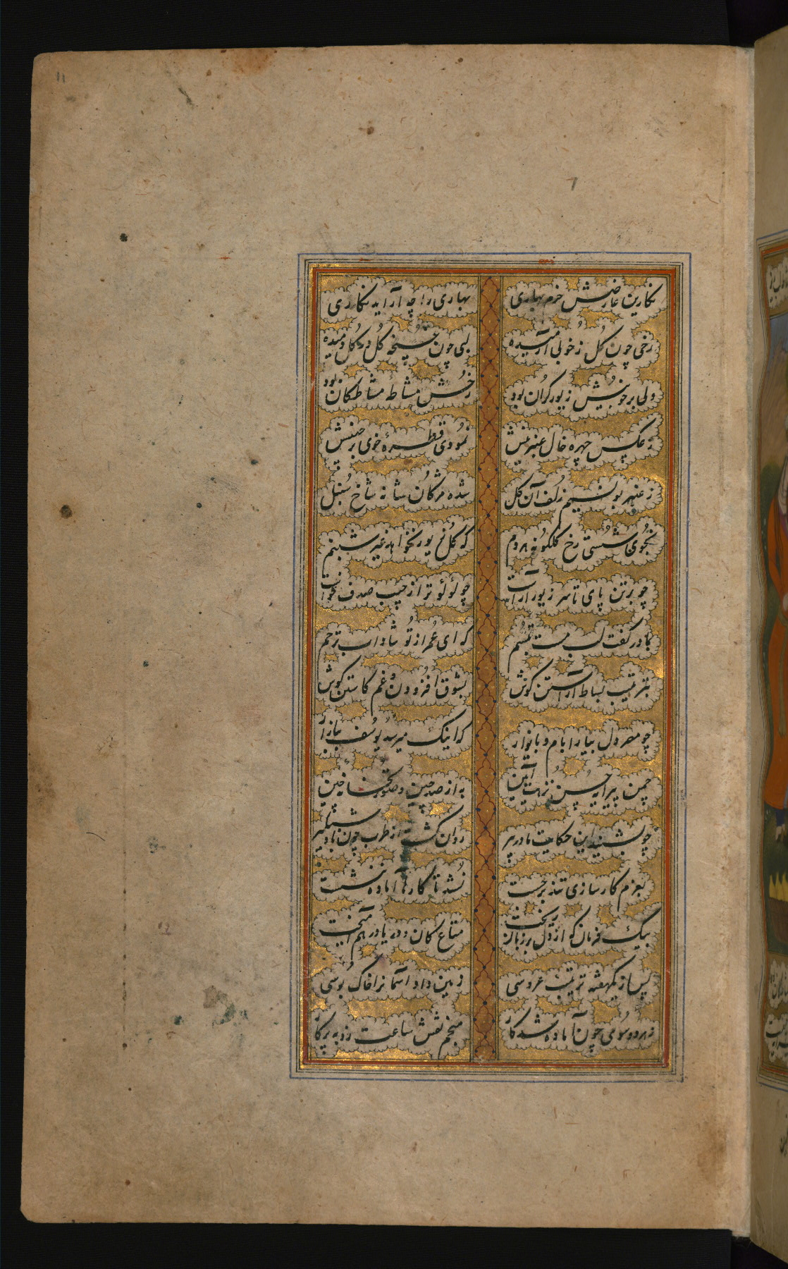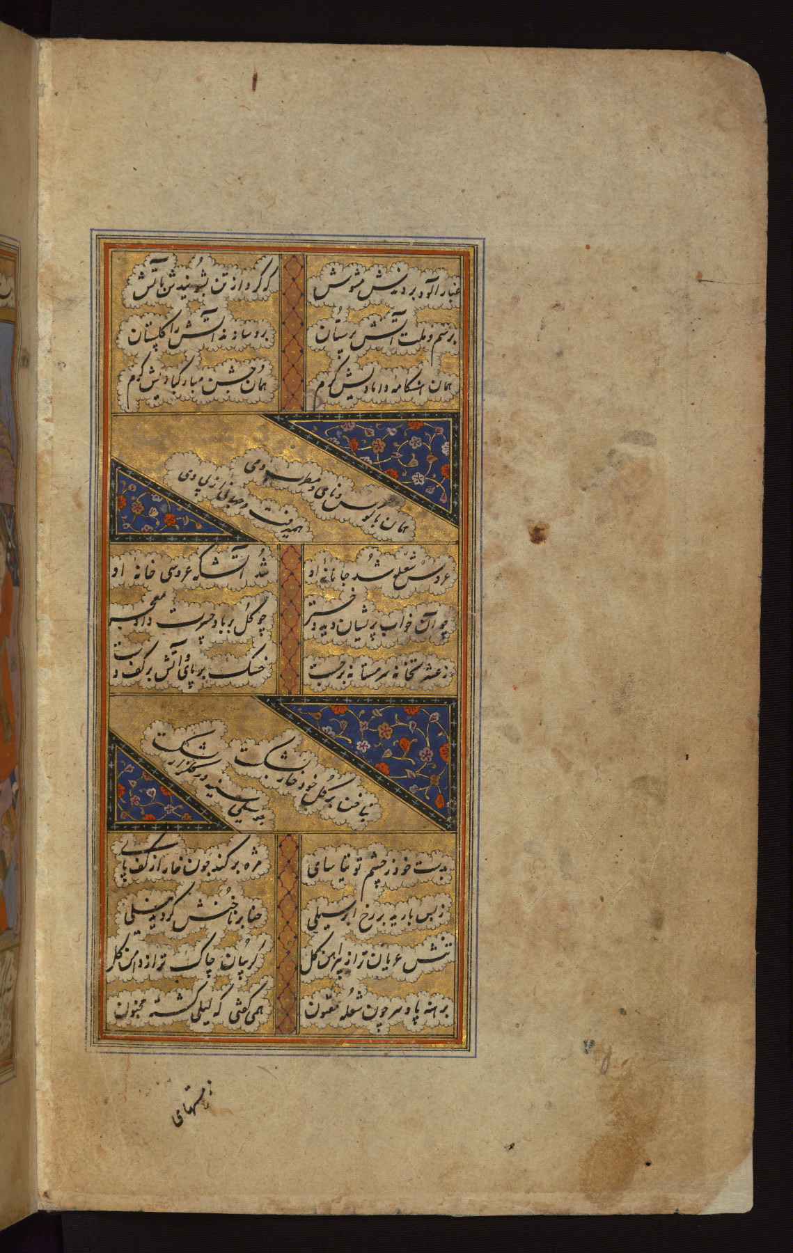 This is an illuminated and illustrated copy of the poem Sūz va gudāz (Burning and melting) by Nawʿī Khabūshānī (d. 1019 AH / 1610 CE), which recounts the love story of a Hindu girl who burns herself on the funeral pyre of her betrothed. The codex was written in nastaʿlīq in black ink by Ibn Sayyid Murād al-Ḥusaynī and illustrated by Muḥammad ʿAlī Mashhadī in 1068 AH / 1657 CE. According to the colophon, Ibn Sayyid Murād al-Ḥusaynī copied the manuscript for the painter Muḥammad ʿAlī, the “Mani of the time,” as a “souvenir.” The fact that the manuscript was produced for one of the most prolific artists of seventeenth-century Iran makes it a highly significant document. It opens with an illuminated incipit with headpiece (fol. 1b) and closes with an illuminated tailpiece with colophon (fol. 21b). Text pages have interlinear illumination and small rectangular and triangular pieces with polychrome floral and scrolling vine motifs. There are eight miniatures in a style associated with the Safavid centers of artistic production of Mashhad and Isfahan (fols. 5a, 9a, 10b, 13a, 14a, 16a, 17b, and 19b).