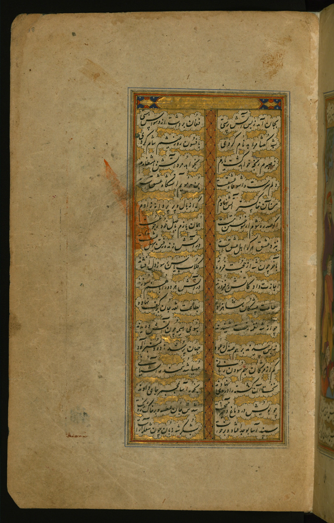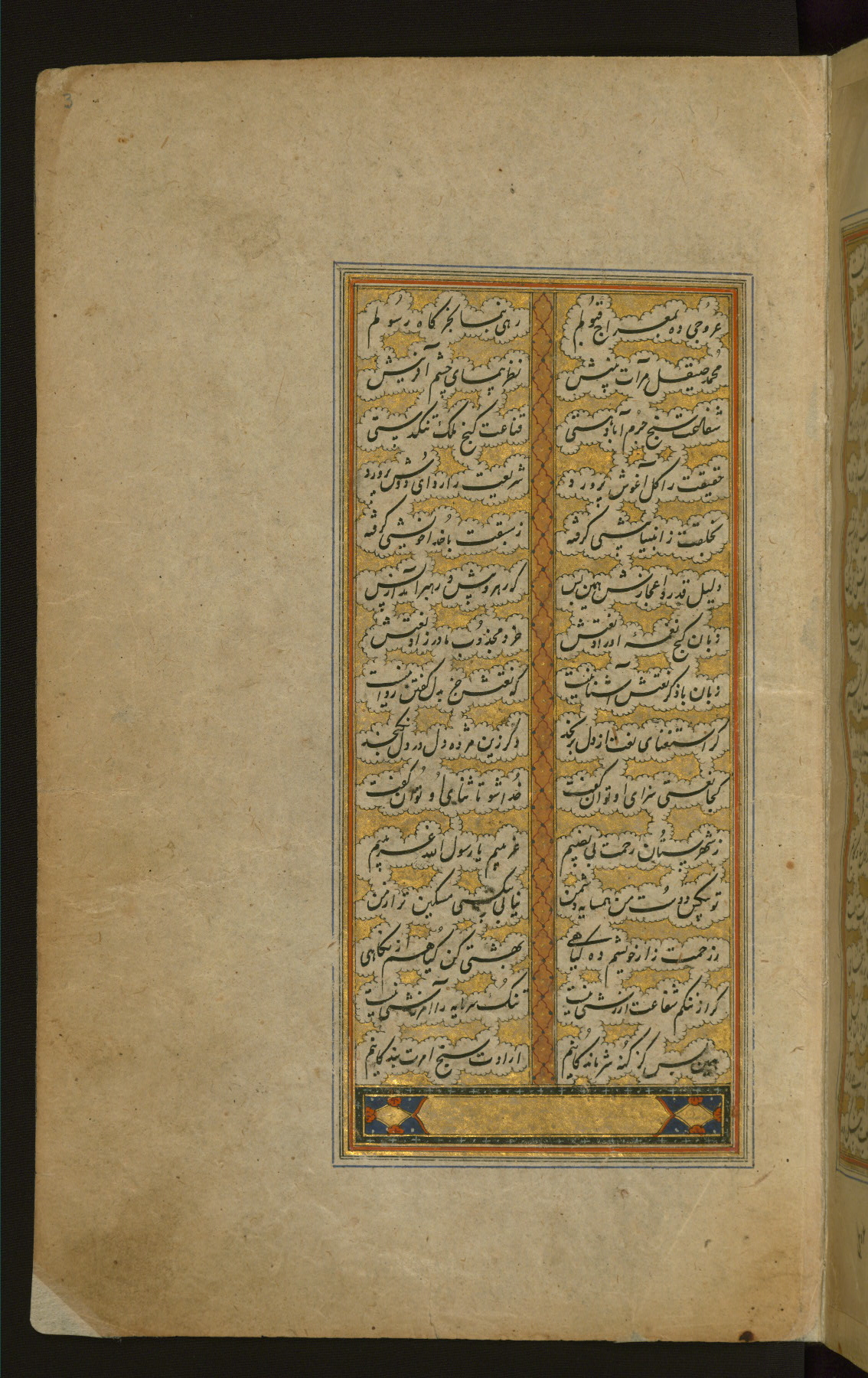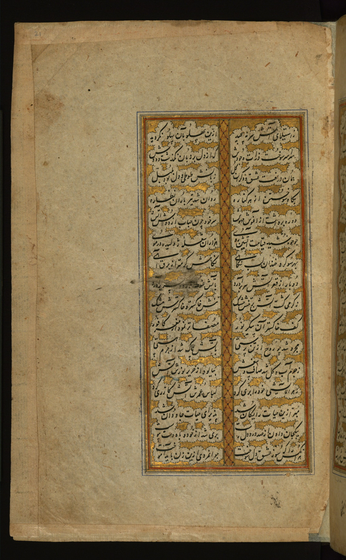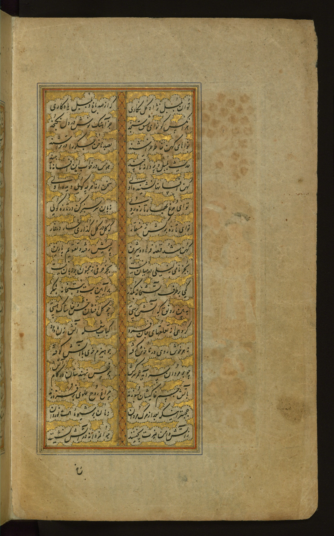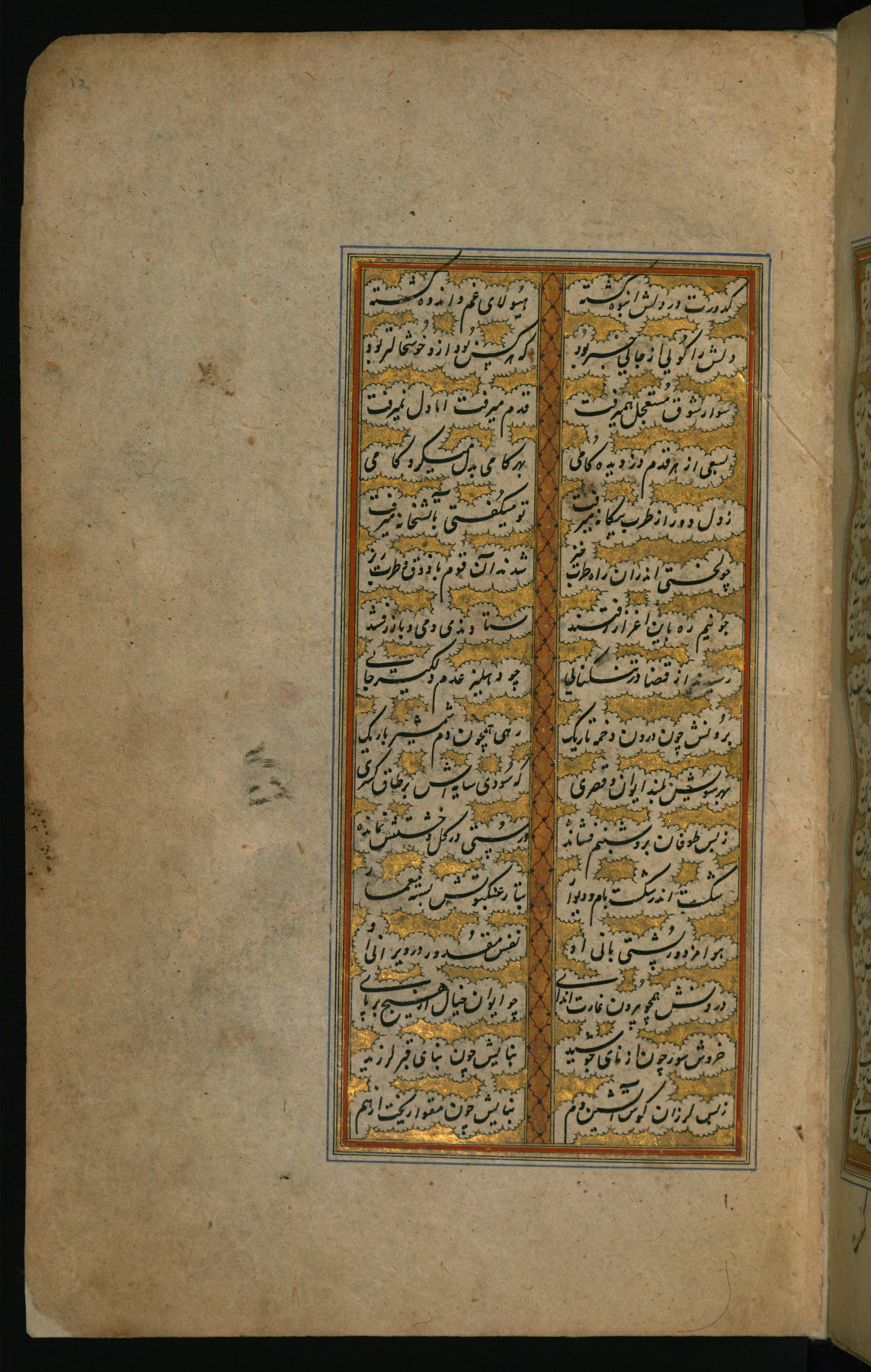 This is an illuminated and illustrated copy of the poem Sūz va gudāz (Burning and melting) by Nawʿī Khabūshānī (d. 1019 AH / 1610 CE), which recounts the love story of a Hindu girl who burns herself on the funeral pyre of her betrothed. The codex was written in nastaʿlīq in black ink by Ibn Sayyid Murād al-Ḥusaynī and illustrated by Muḥammad ʿAlī Mashhadī in 1068 AH / 1657 CE. According to the colophon, Ibn Sayyid Murād al-Ḥusaynī copied the manuscript for the painter Muḥammad ʿAlī, the “Mani of the time,” as a “souvenir.” The fact that the manuscript was produced for one of the most prolific artists of seventeenth-century Iran makes it a highly significant document. It opens with an illuminated incipit with headpiece (fol. 1b) and closes with an illuminated tailpiece with colophon (fol. 21b). Text pages have interlinear illumination and small rectangular and triangular pieces with polychrome floral and scrolling vine motifs. There are eight miniatures in a style associated with the Safavid centers of artistic production of Mashhad and Isfahan (fols. 5a, 9a, 10b, 13a, 14a, 16a, 17b, and 19b).