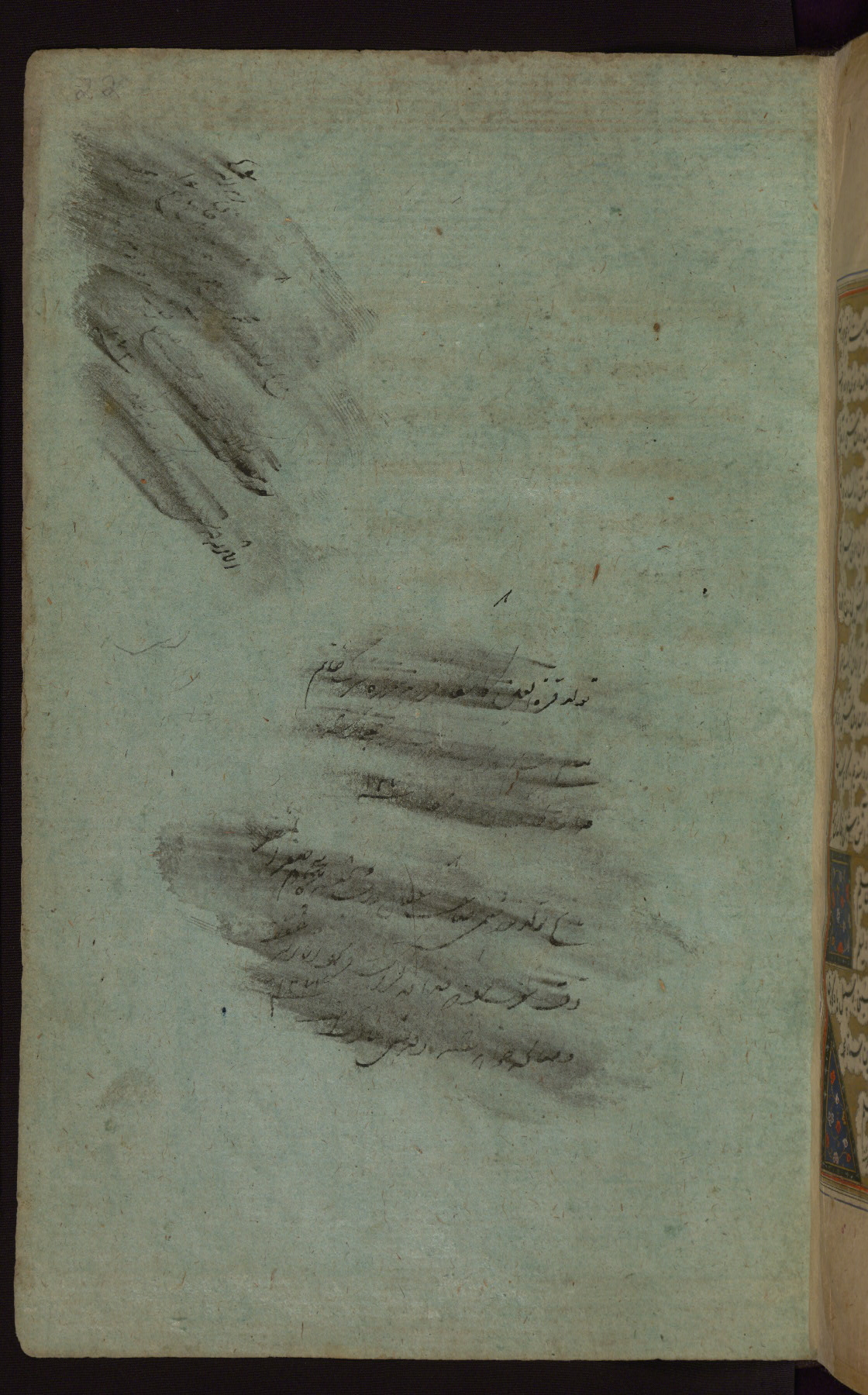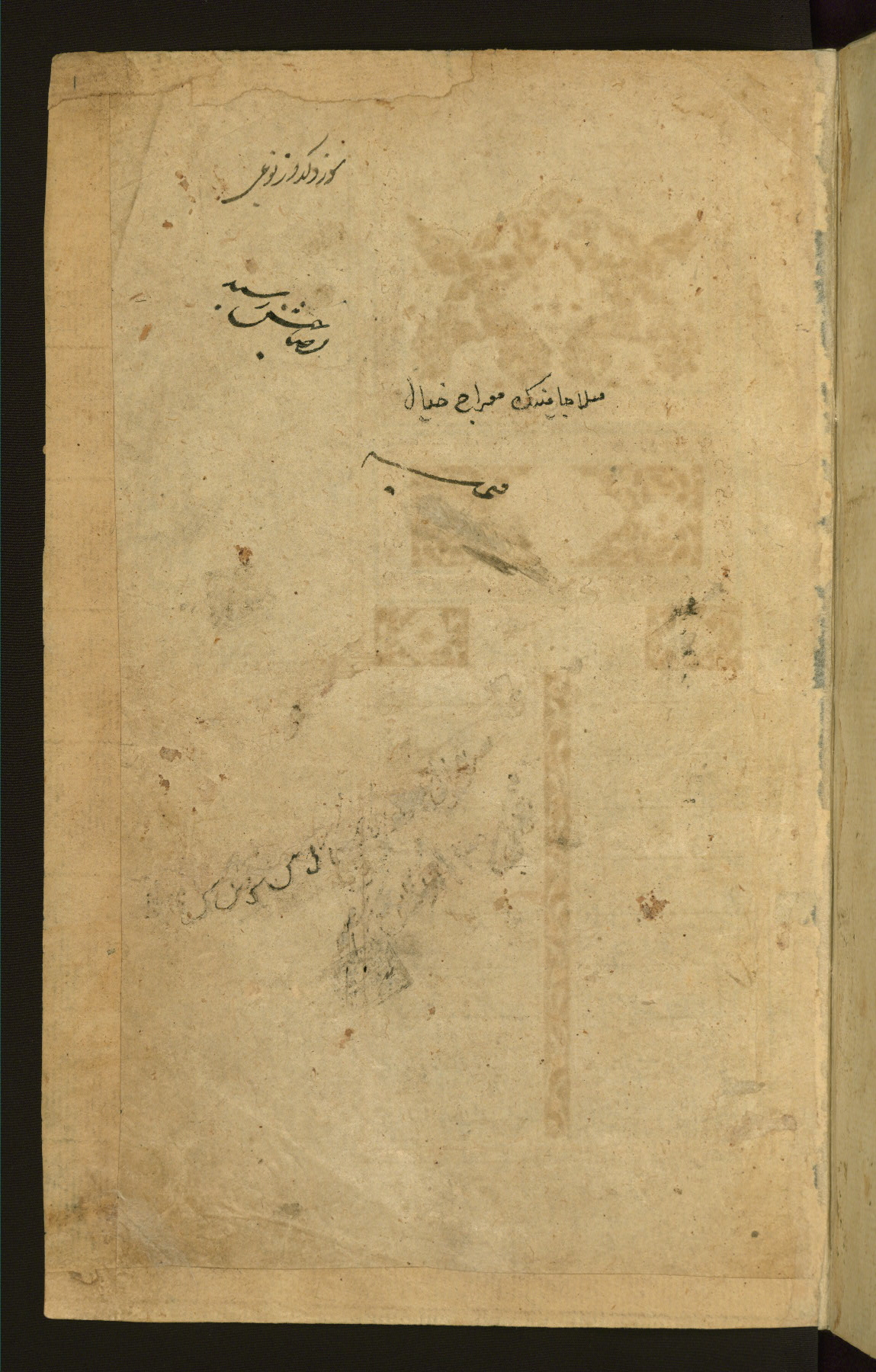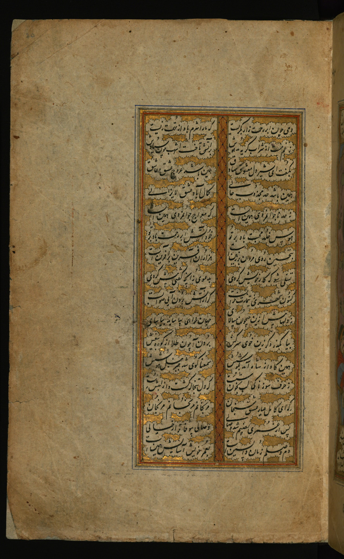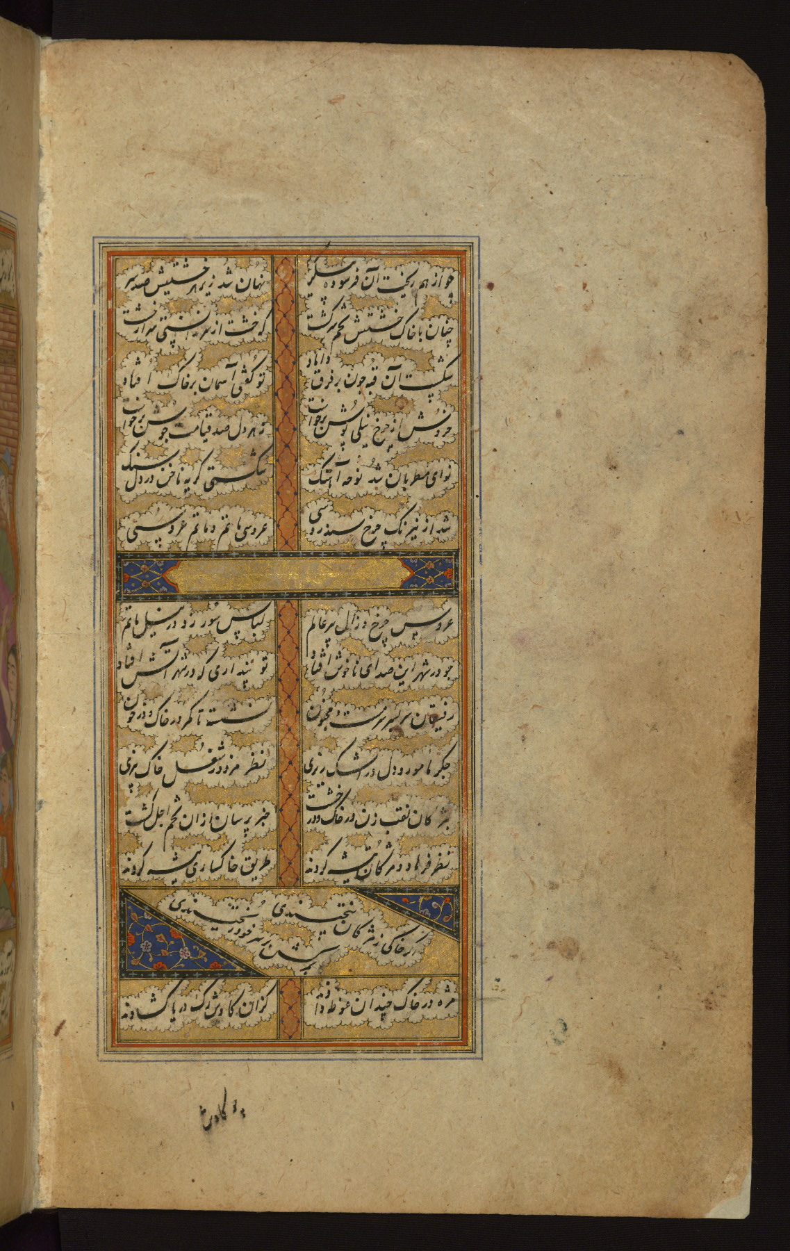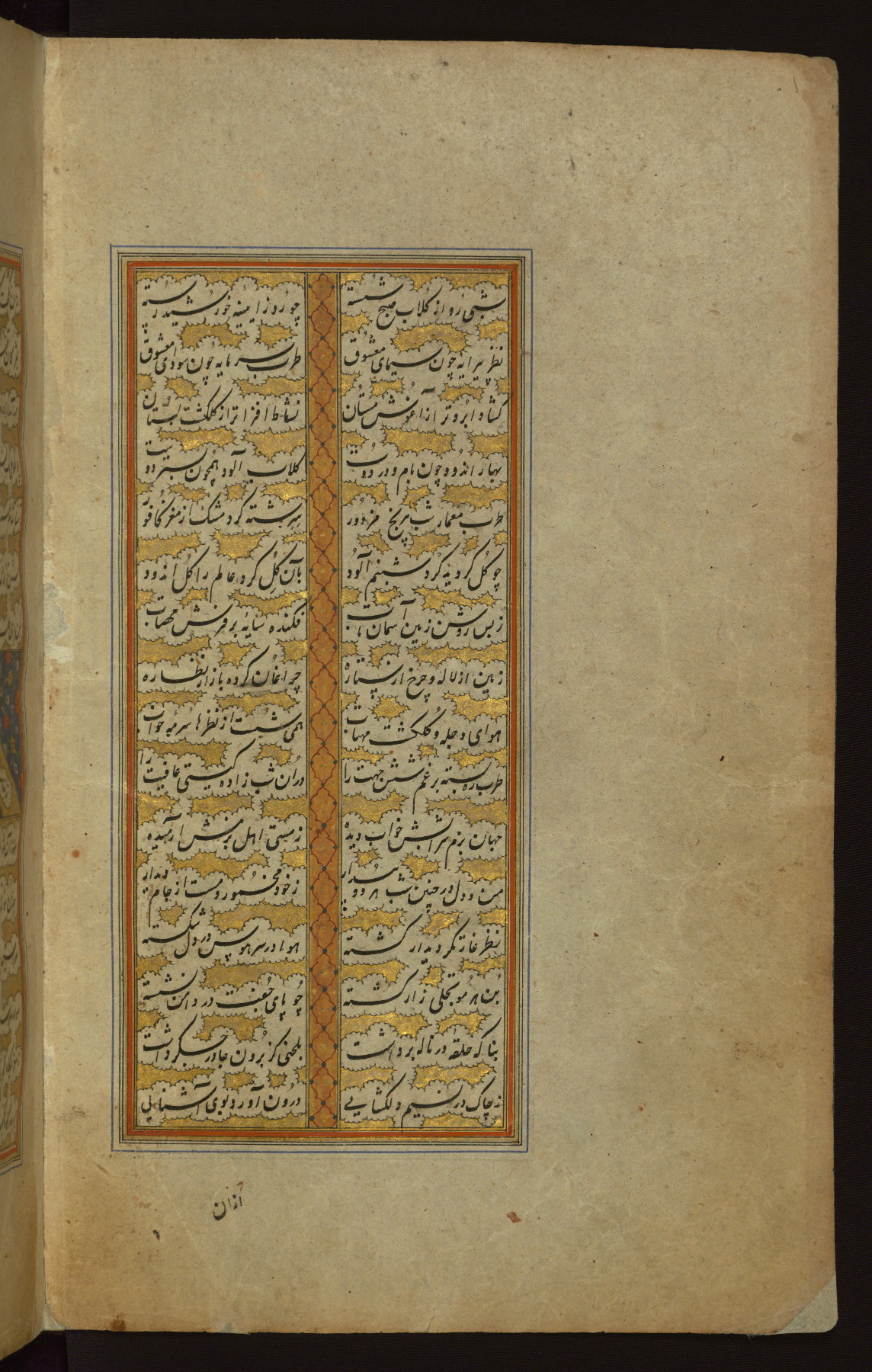 This is an illuminated and illustrated copy of the poem Sūz va gudāz (Burning and melting) by Nawʿī Khabūshānī (d. 1019 AH / 1610 CE), which recounts the love story of a Hindu girl who burns herself on the funeral pyre of her betrothed. The codex was written in nastaʿlīq in black ink by Ibn Sayyid Murād al-Ḥusaynī and illustrated by Muḥammad ʿAlī Mashhadī in 1068 AH / 1657 CE. According to the colophon, Ibn Sayyid Murād al-Ḥusaynī copied the manuscript for the painter Muḥammad ʿAlī, the “Mani of the time,” as a “souvenir.” The fact that the manuscript was produced for one of the most prolific artists of seventeenth-century Iran makes it a highly significant document. It opens with an illuminated incipit with headpiece (fol. 1b) and closes with an illuminated tailpiece with colophon (fol. 21b). Text pages have interlinear illumination and small rectangular and triangular pieces with polychrome floral and scrolling vine motifs. There are eight miniatures in a style associated with the Safavid centers of artistic production of Mashhad and Isfahan (fols. 5a, 9a, 10b, 13a, 14a, 16a, 17b, and 19b).