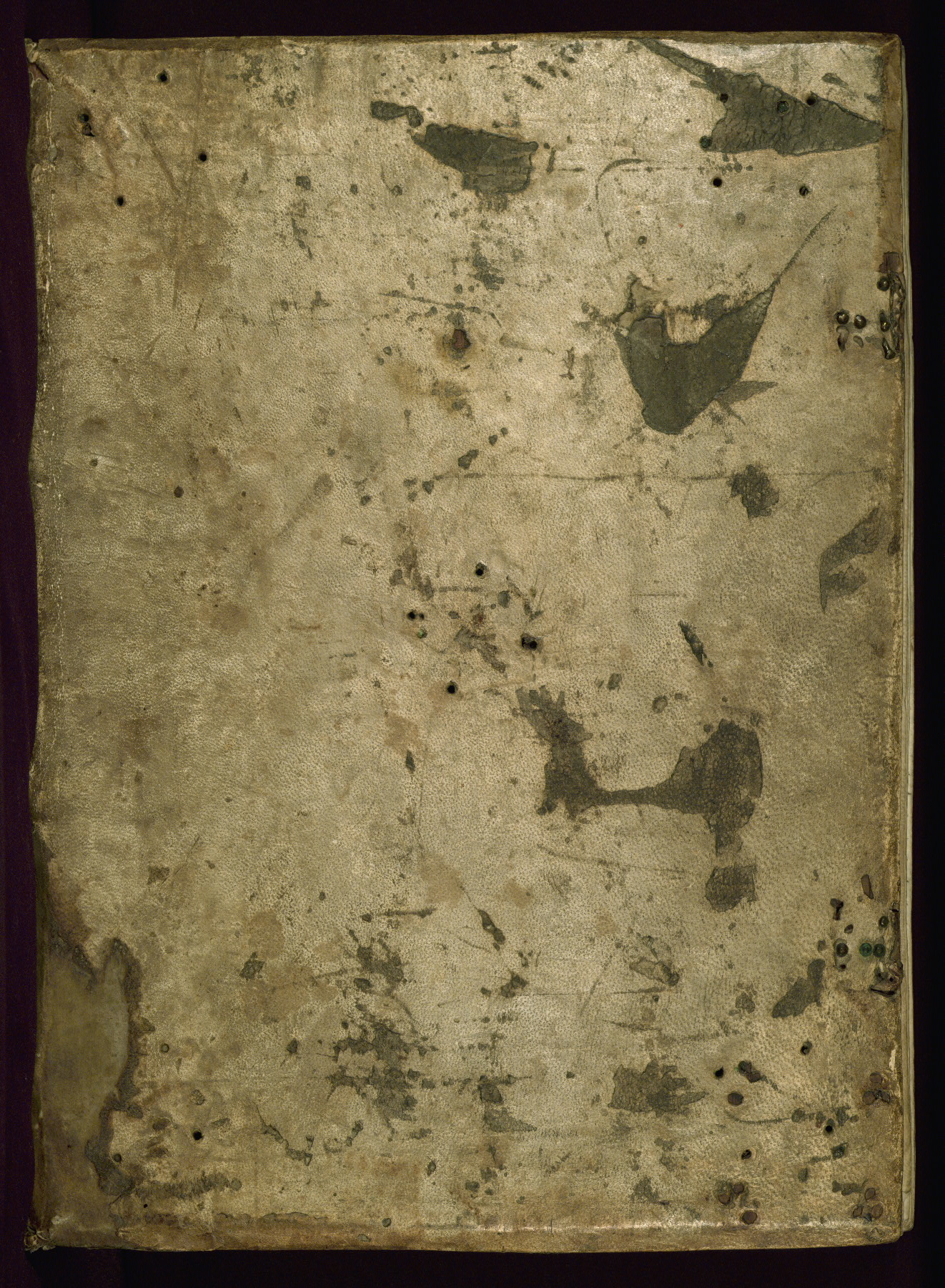 Contemporary binding; tawed skin, perhaps sheepskin, over thick oak boards with beveled outer edges; naturally rounded spine with abrasions and tears; pattern of holes at center and corners of upper and lower boards is evidence of metal furnishings; original fastenings for two straps and side-pins missing; book box: second half of the twentieth century
