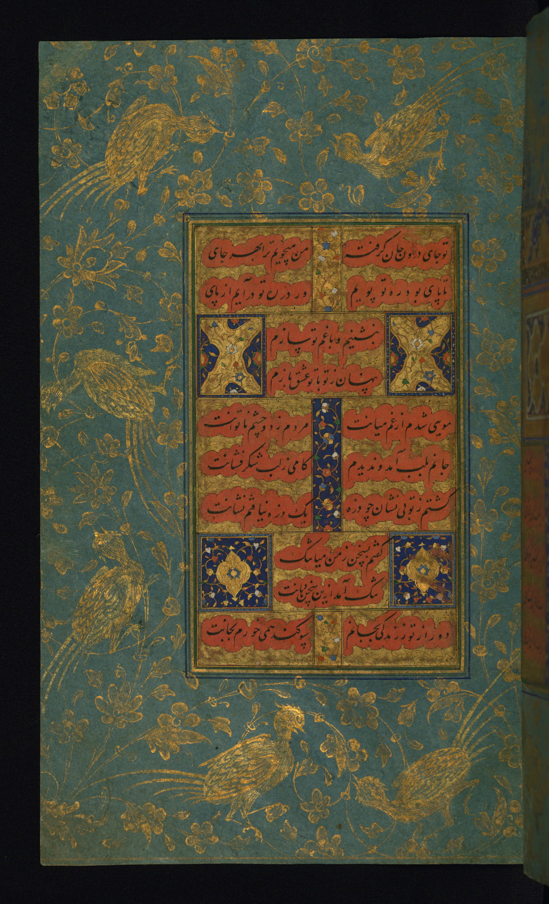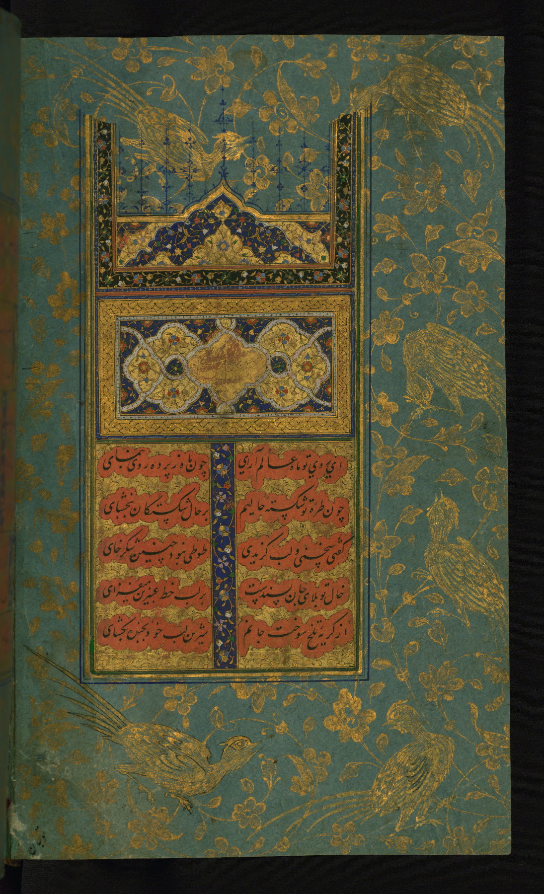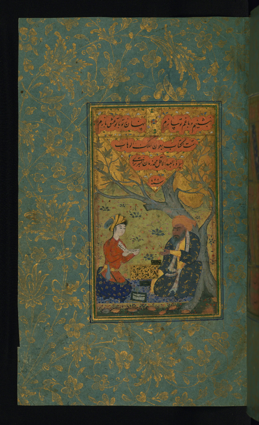 - Label: This text page is written in nasta‘līq script on orange-tinted paper by the calligrapher Muḥammad Zamān al-Tabrīzī in 998 AH / 1589-90 CE in Safavid Iran. The bluish-green borders are illuminated in an early Safavid style.