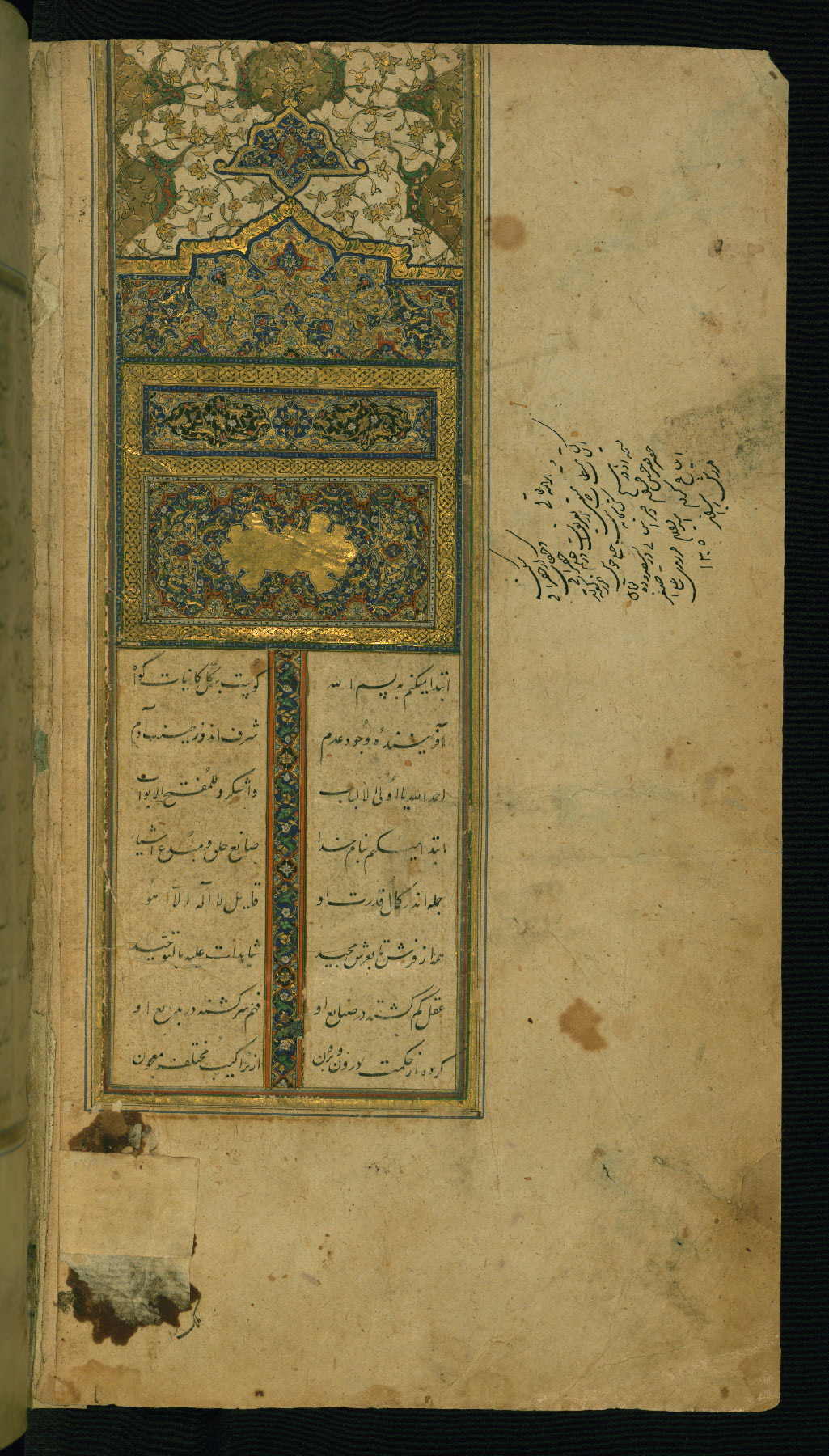 - Label: This incipit page with illuminated headpiece has a purchase note in the right margin dated 1305 AH / 1887-8 CE.
