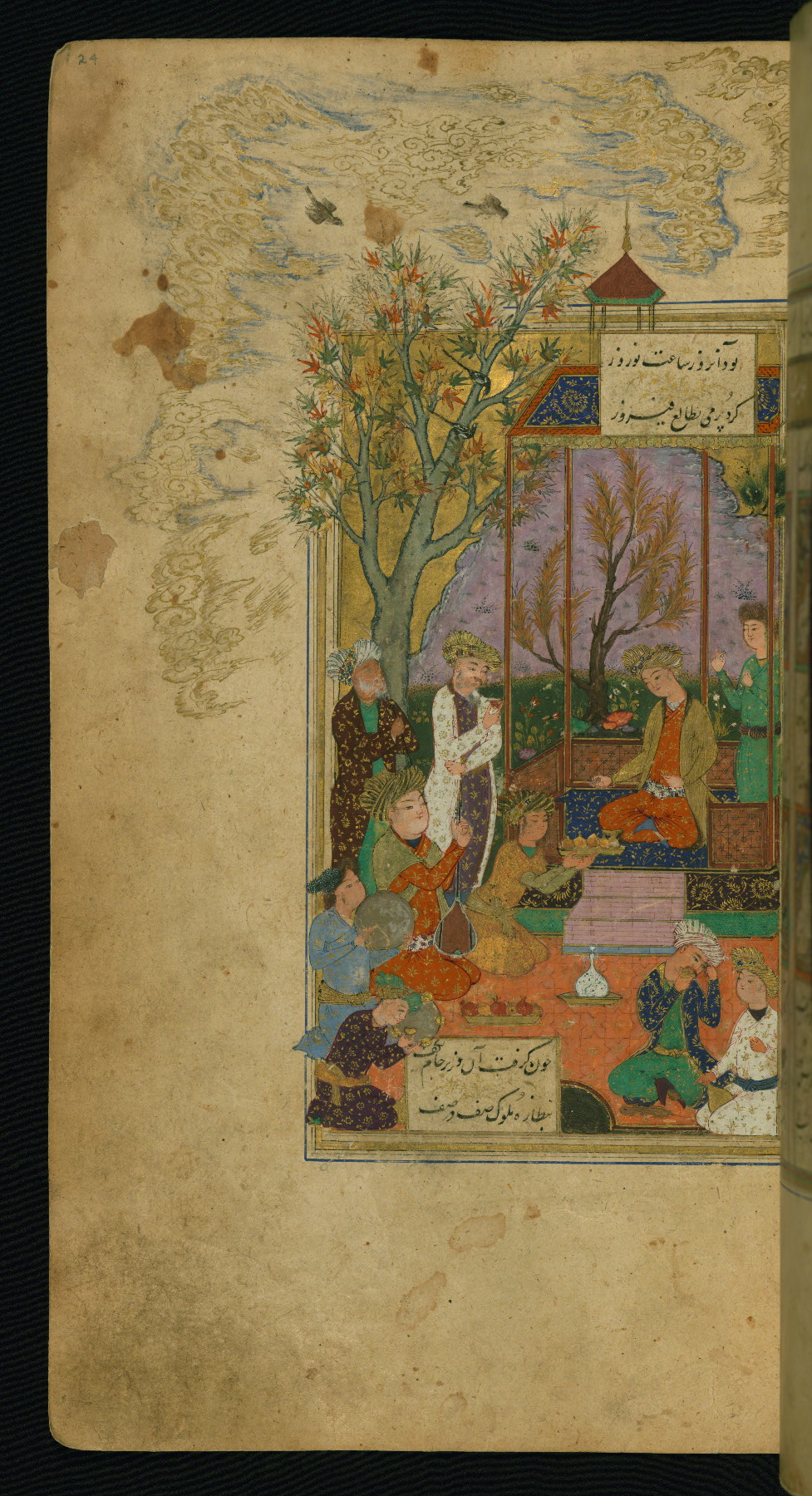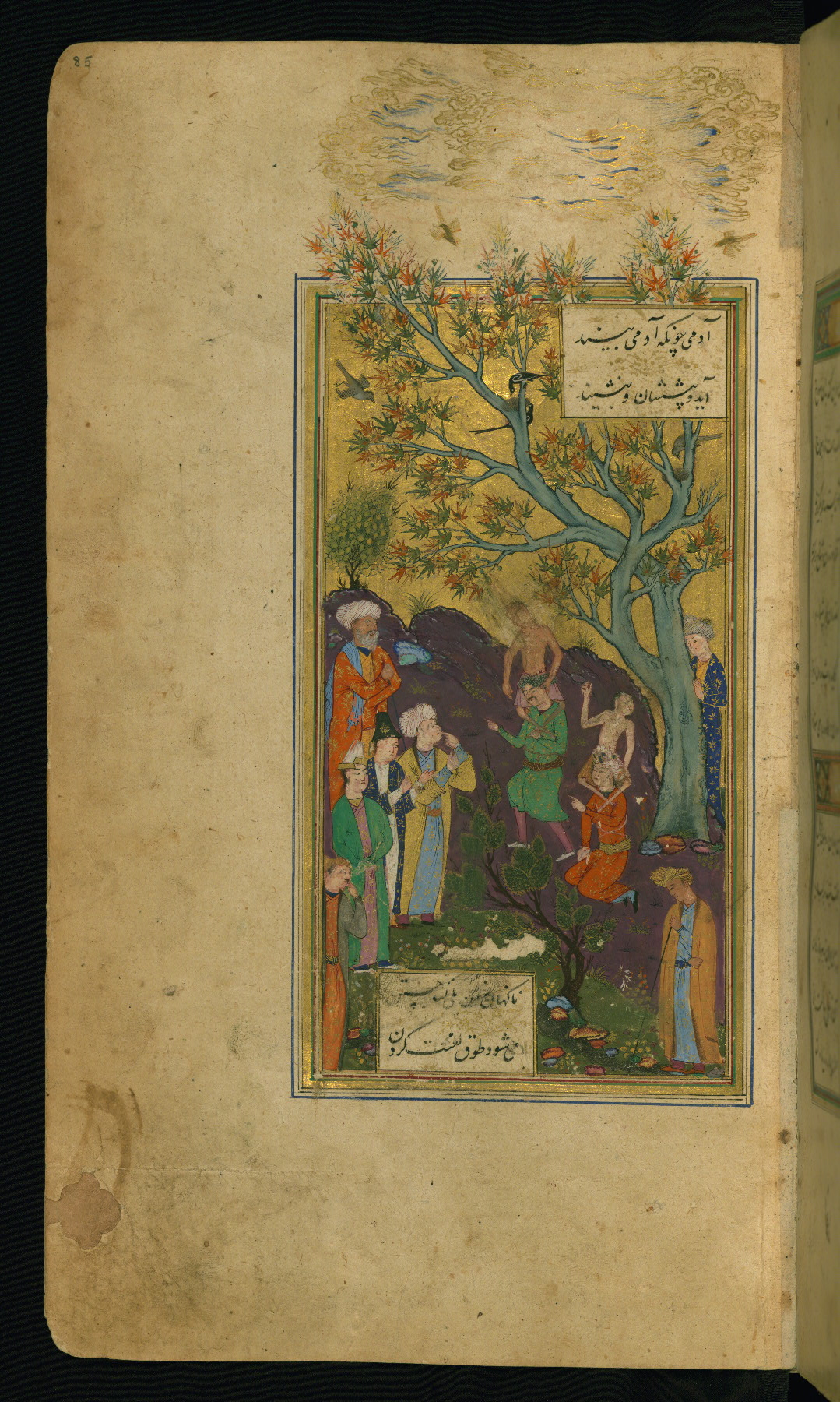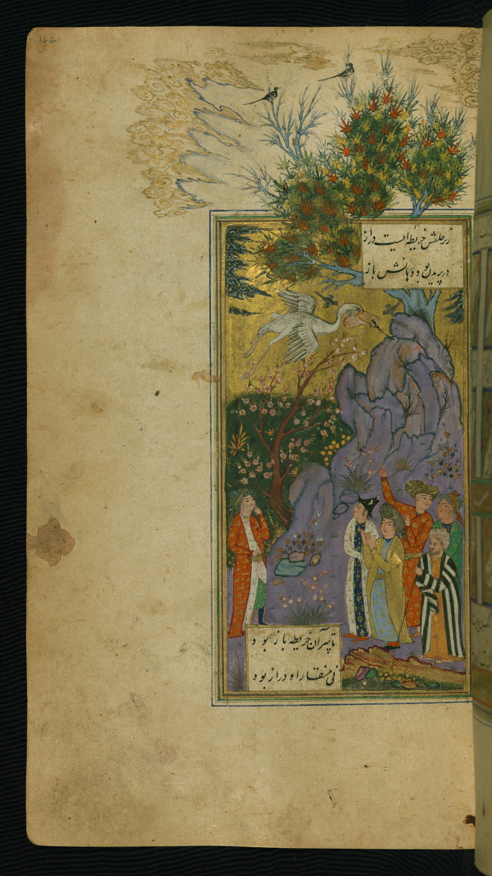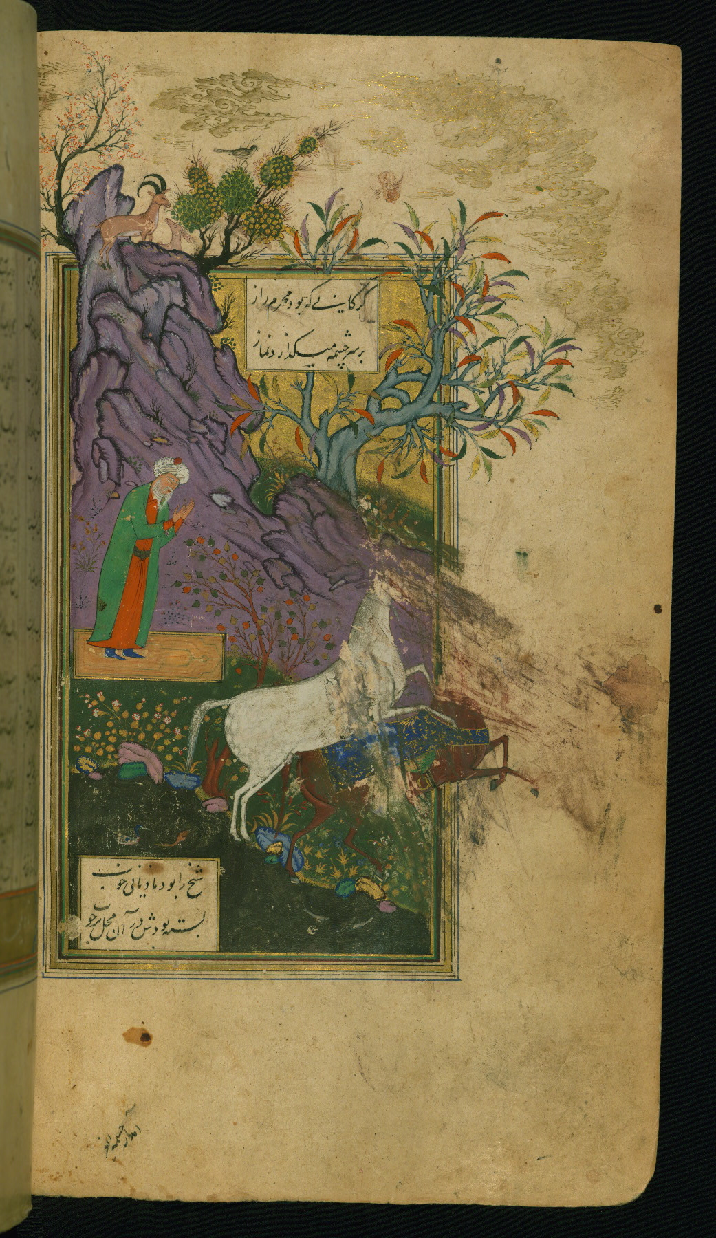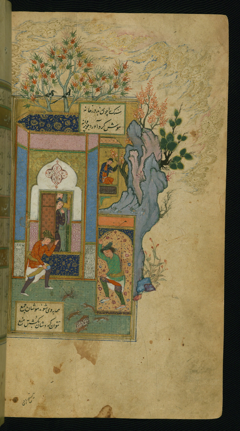 This is an abridged metrical paraphrase of the second maqālah of ʿAjāʾib al-makhlūqāt (The wonders of creation) by Zakariyāʾ al-Qazwīnī (d. 682 AH / 1283 CE) with additions from other sources by Fakhr al-Dīn Ḥamzah ibn ʿAlī Āẕarī (d. 866 AH / 1461-2 CE). The text was copied in Herat (in present-day Afghanistan) in 1022 AH / 1613 CE in the library of the governor of Khurasan Ḥusayn Khān Shāmlū-yi Bīklirbīkī (Beglerbegi). The manuscript is illustrated with fourteen paintings in an early Safavid style from the eleventh century AH / seventeenth CE. The present binding is not original to the manuscript.