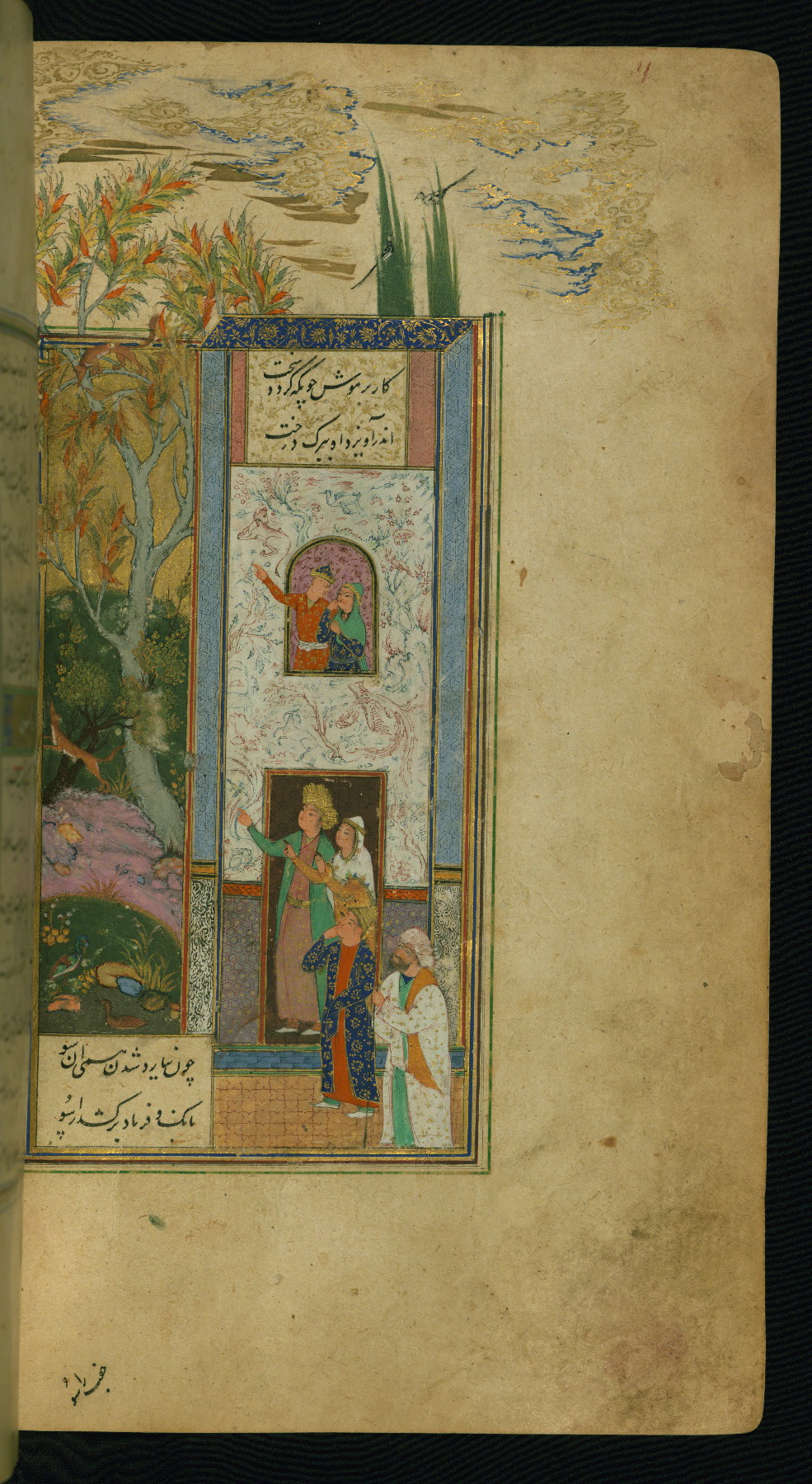 - Hand note: Written in nastaʿlīq script in black with chapter headings in white