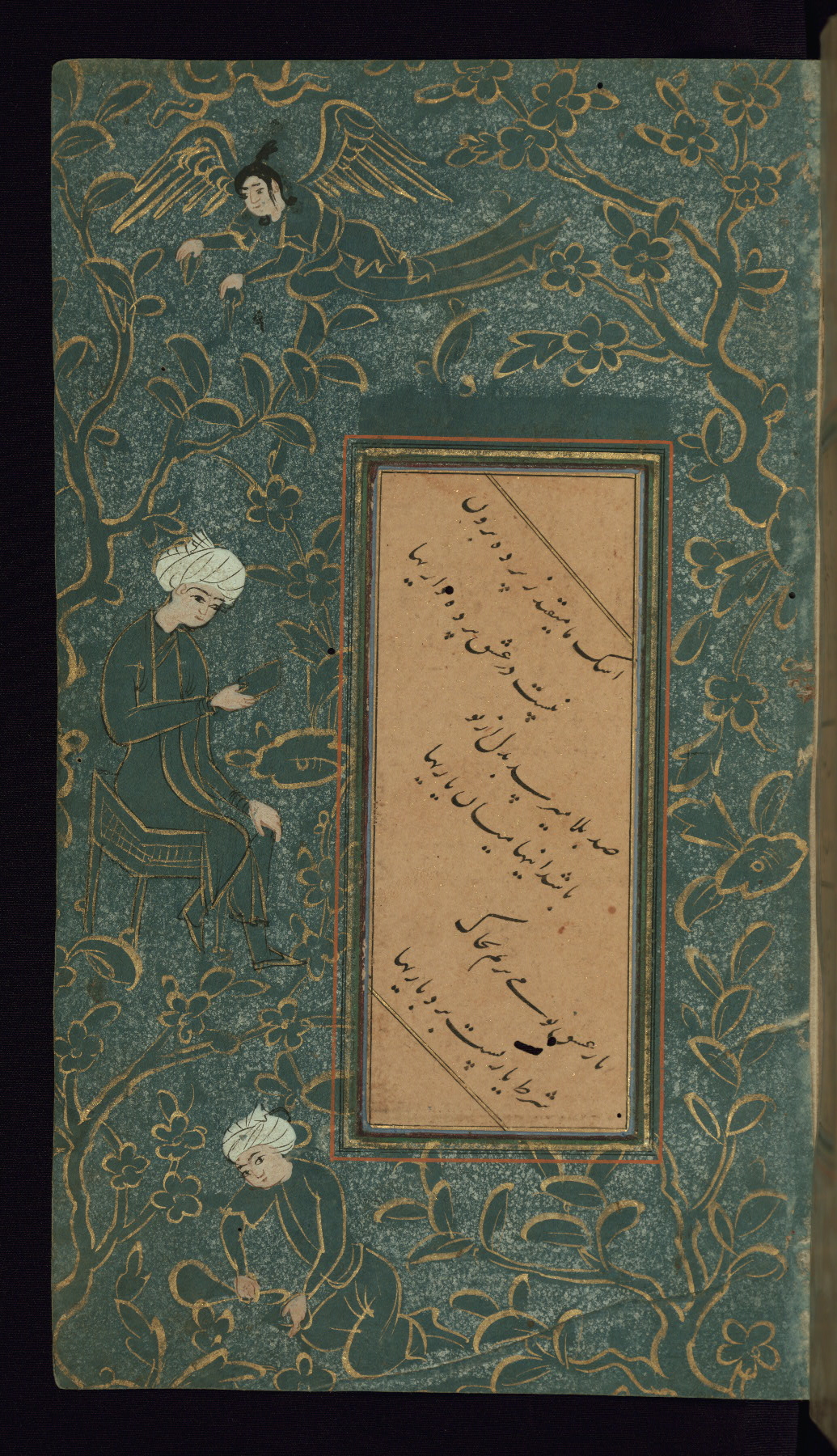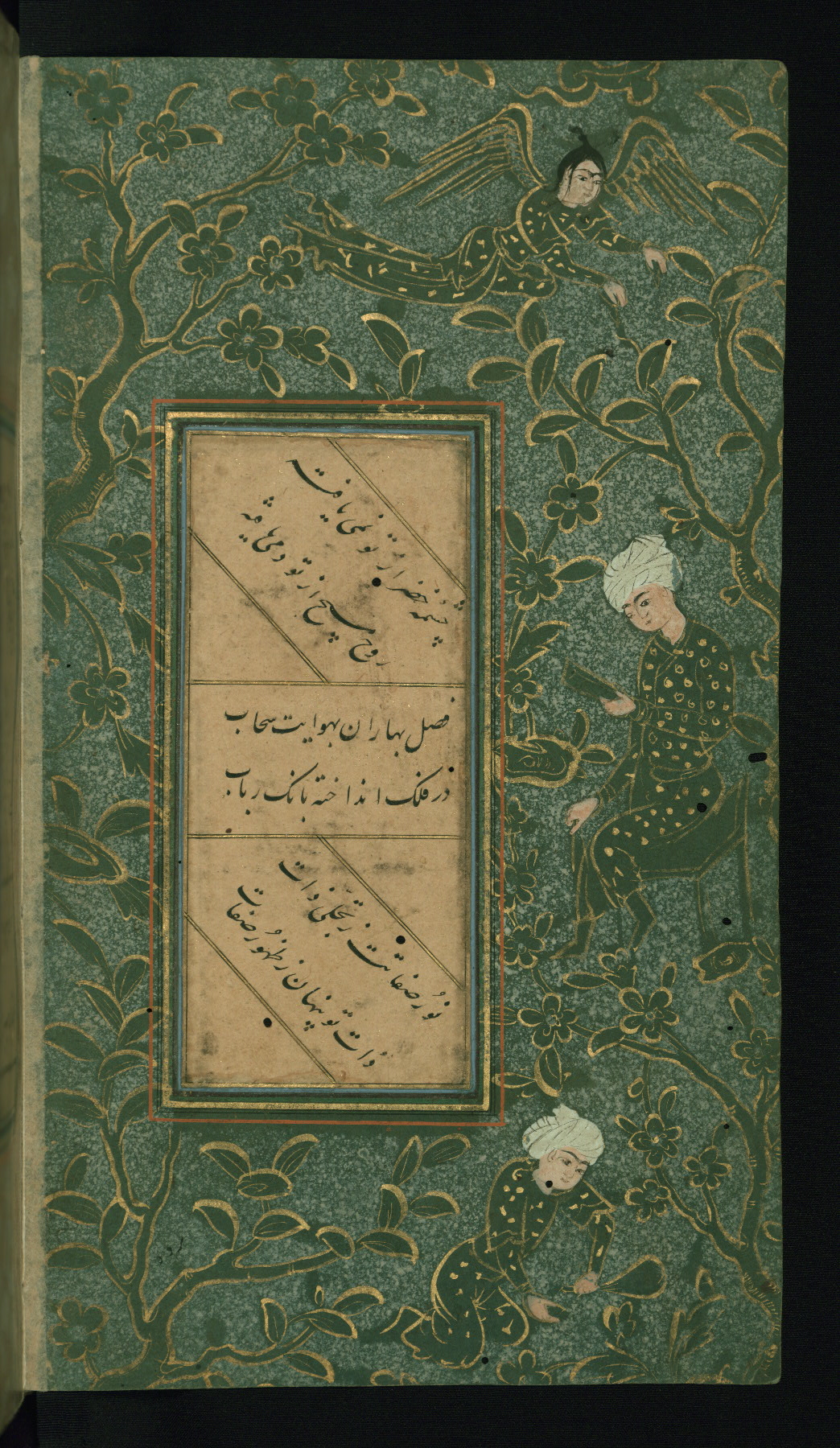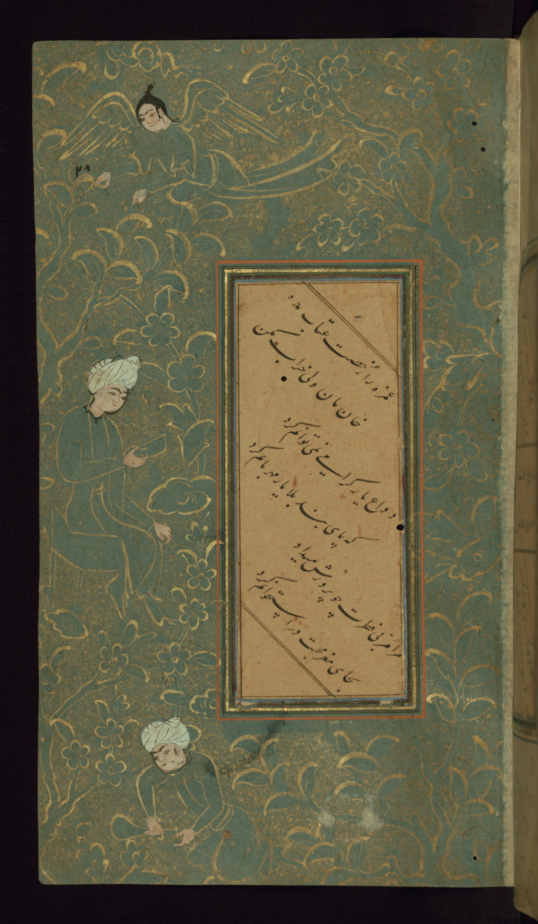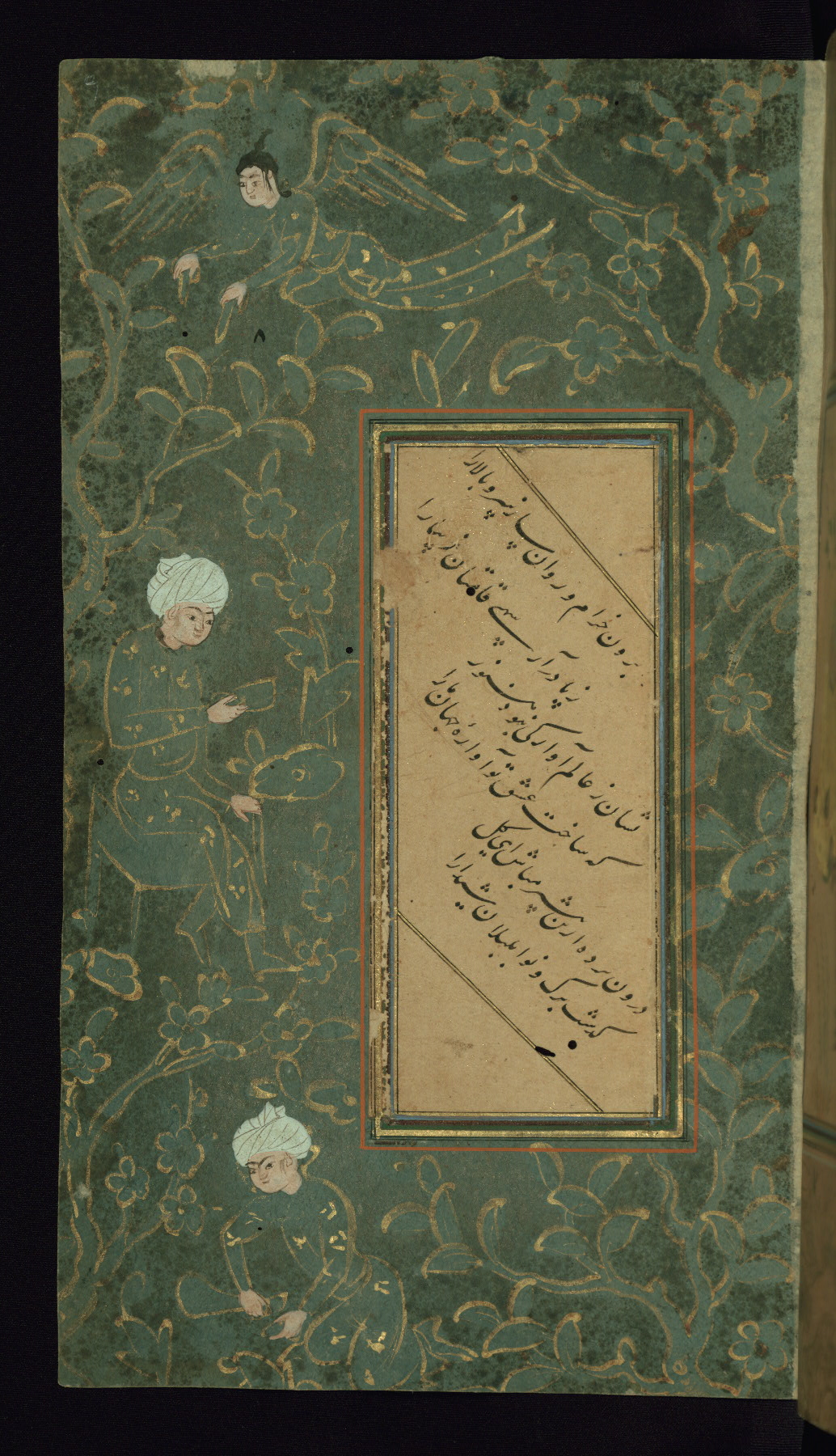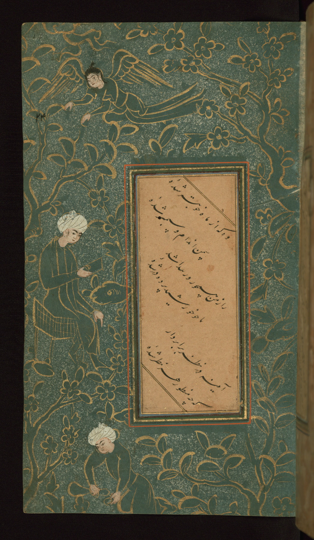 This illuminated and illustrated anthology was compiled in 1105 AH / 1693 CE in Safavid Iran. The manuscript includes works by such poets as Jāmī, Azārī, Fayz̤ī, Navāʾī, and Saʿdī. The margins of colored and marbled paper are decorated with stenciled, illuminated, and painted motifs, including an angel, a young man reading a book, a youth pouring wine, and various animals. There are five paintings in the codex (fols. 8b, 16b, 17a, 19b, and 24b). The green leather binding is not original to the codex and probably dates to the thirteenth century AH / nineteenth CE.