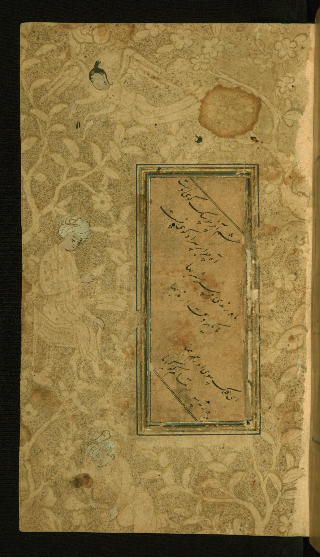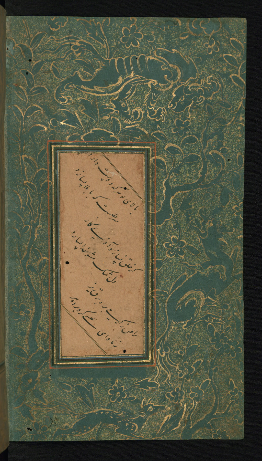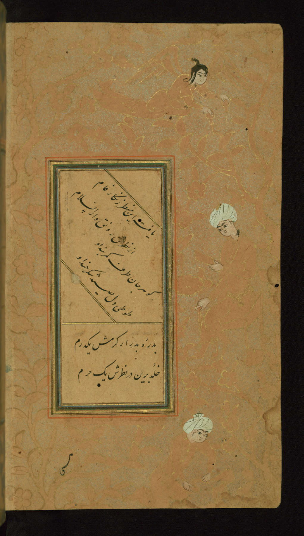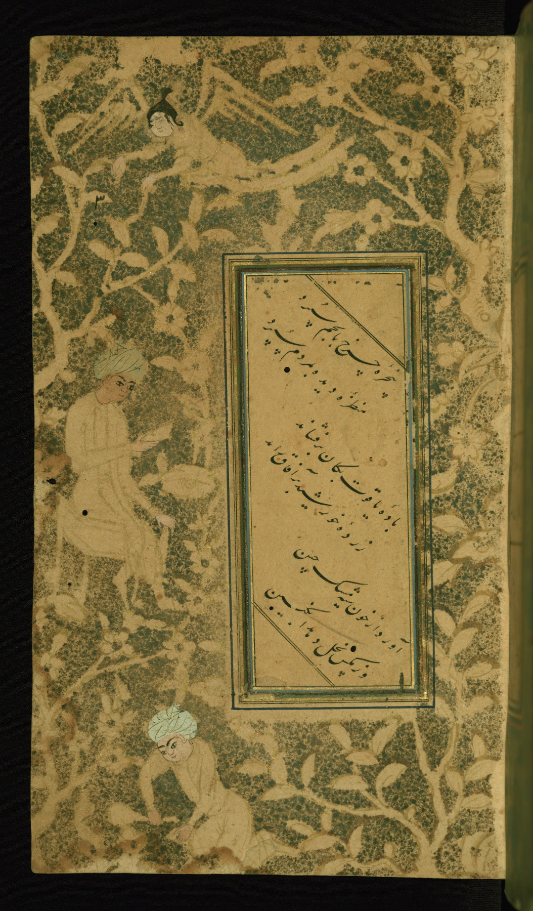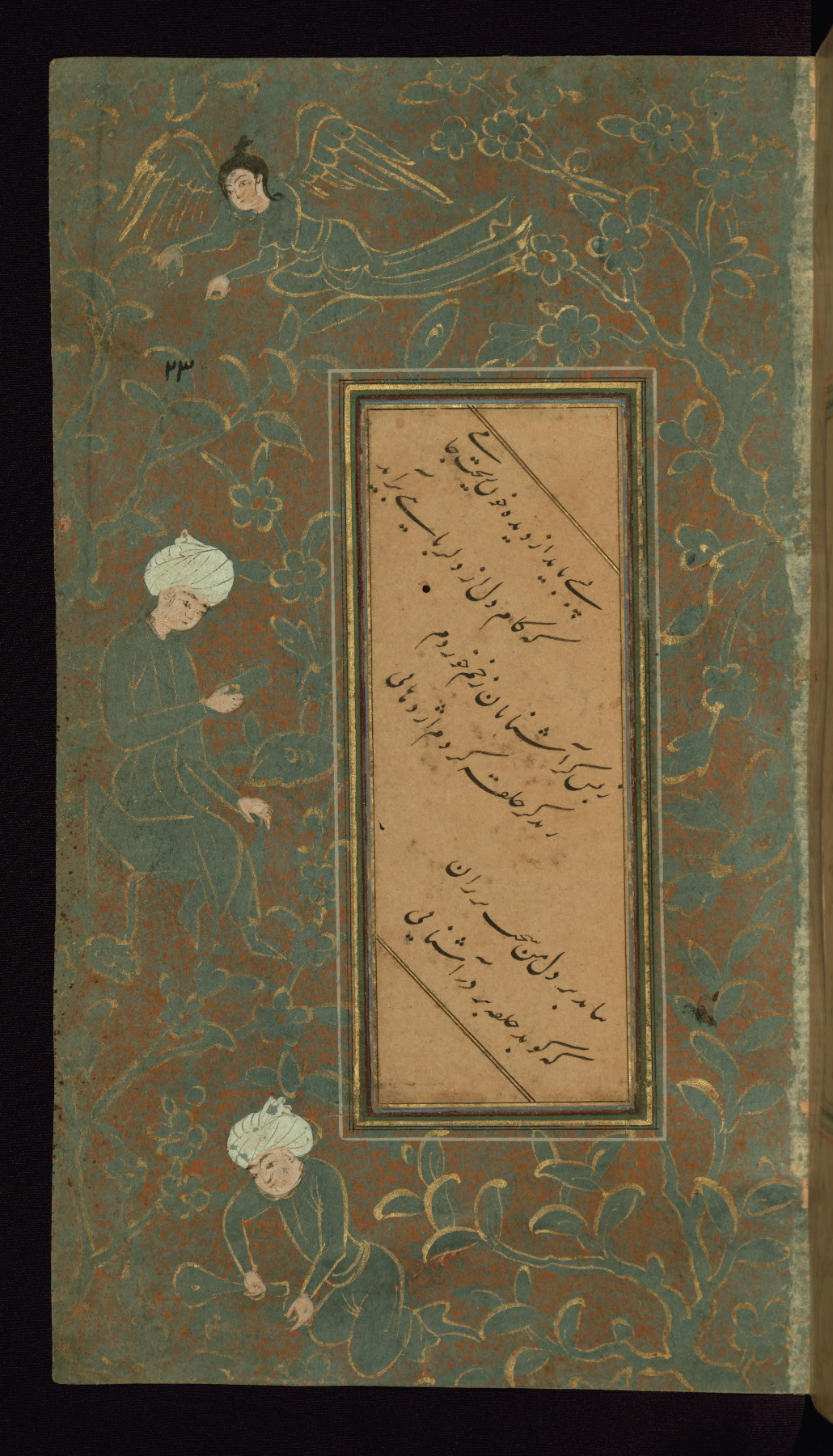 This illuminated and illustrated anthology was compiled in 1105 AH / 1693 CE in Safavid Iran. The manuscript includes works by such poets as Jāmī, Azārī, Fayz̤ī, Navāʾī, and Saʿdī. The margins of colored and marbled paper are decorated with stenciled, illuminated, and painted motifs, including an angel, a young man reading a book, a youth pouring wine, and various animals. There are five paintings in the codex (fols. 8b, 16b, 17a, 19b, and 24b). The green leather binding is not original to the codex and probably dates to the thirteenth century AH / nineteenth CE.