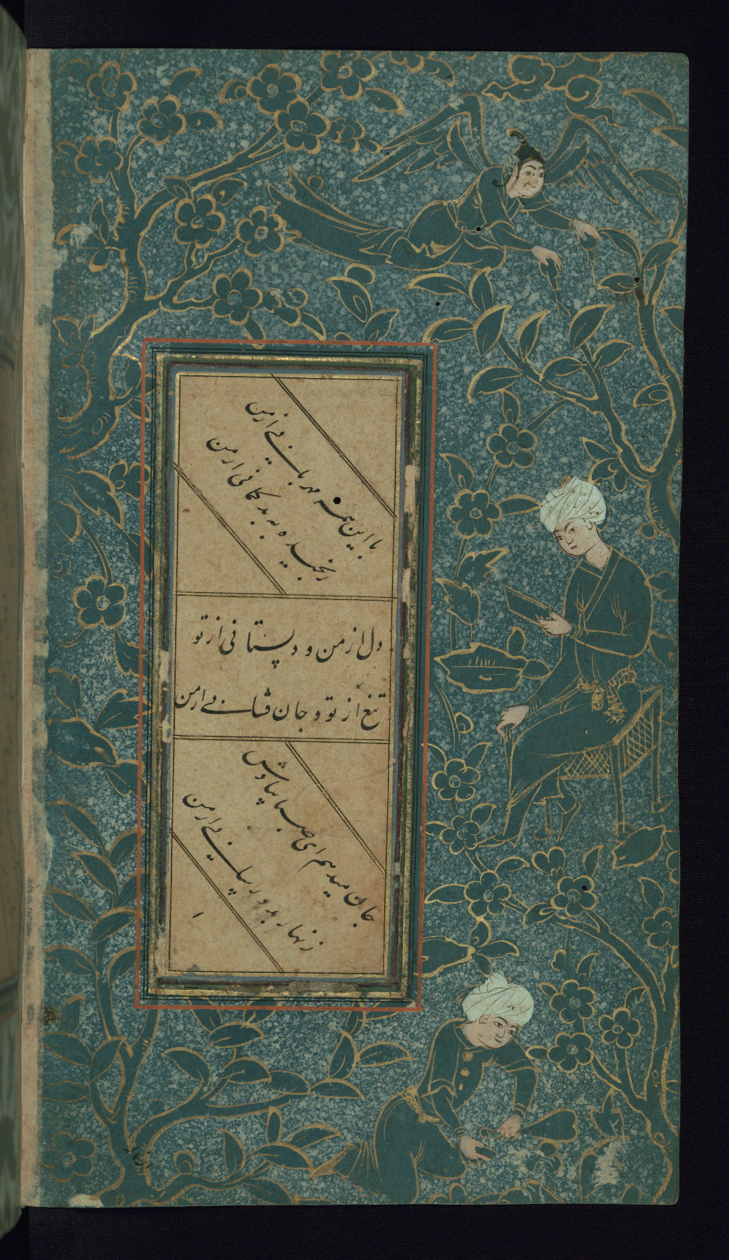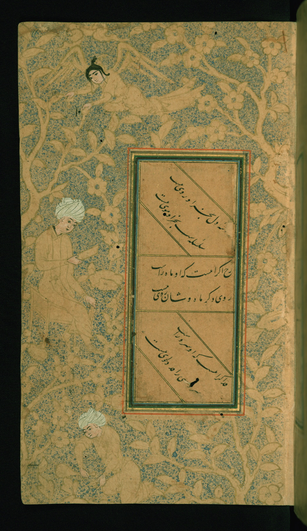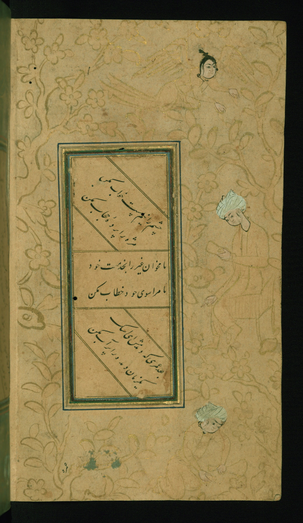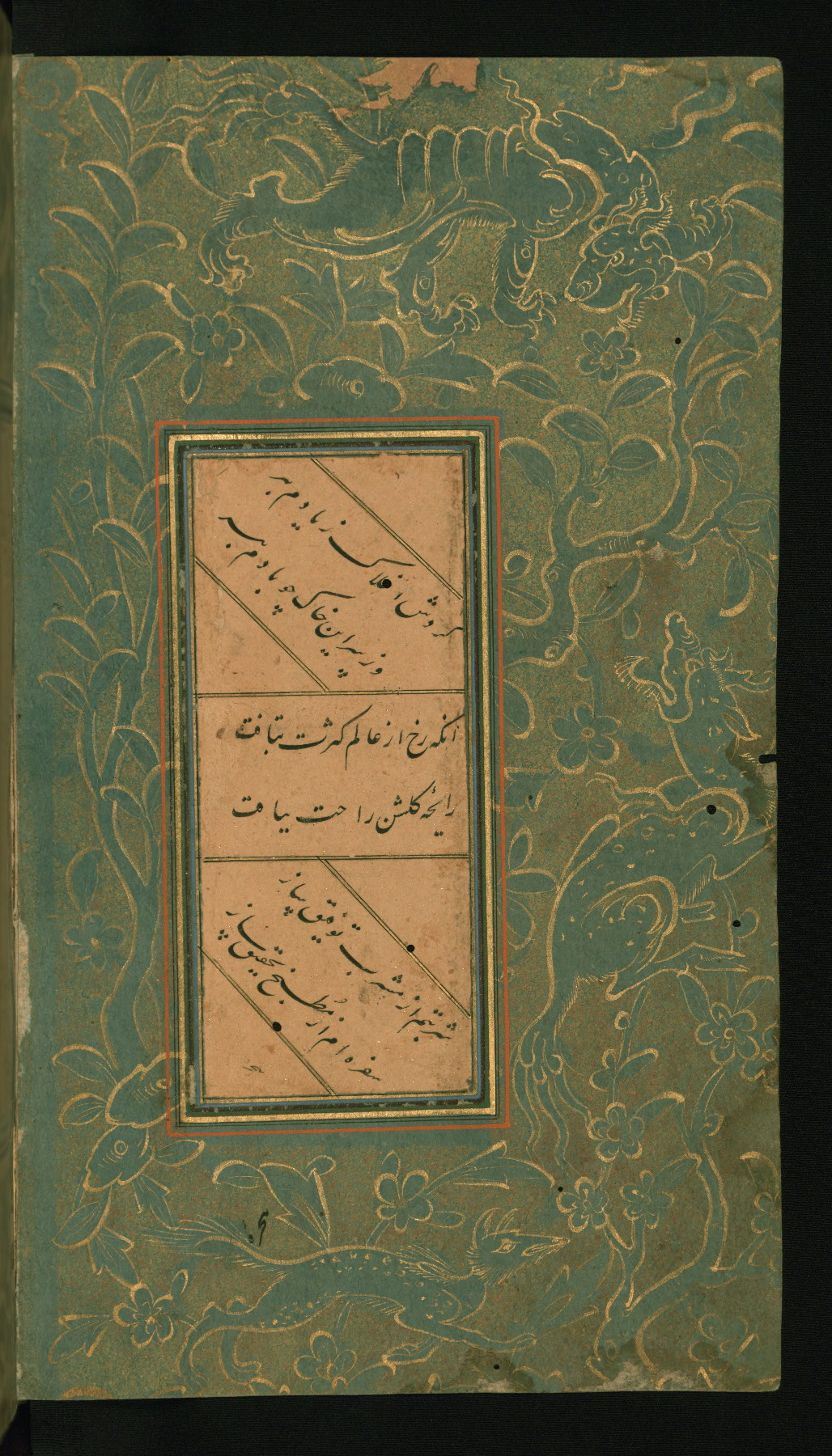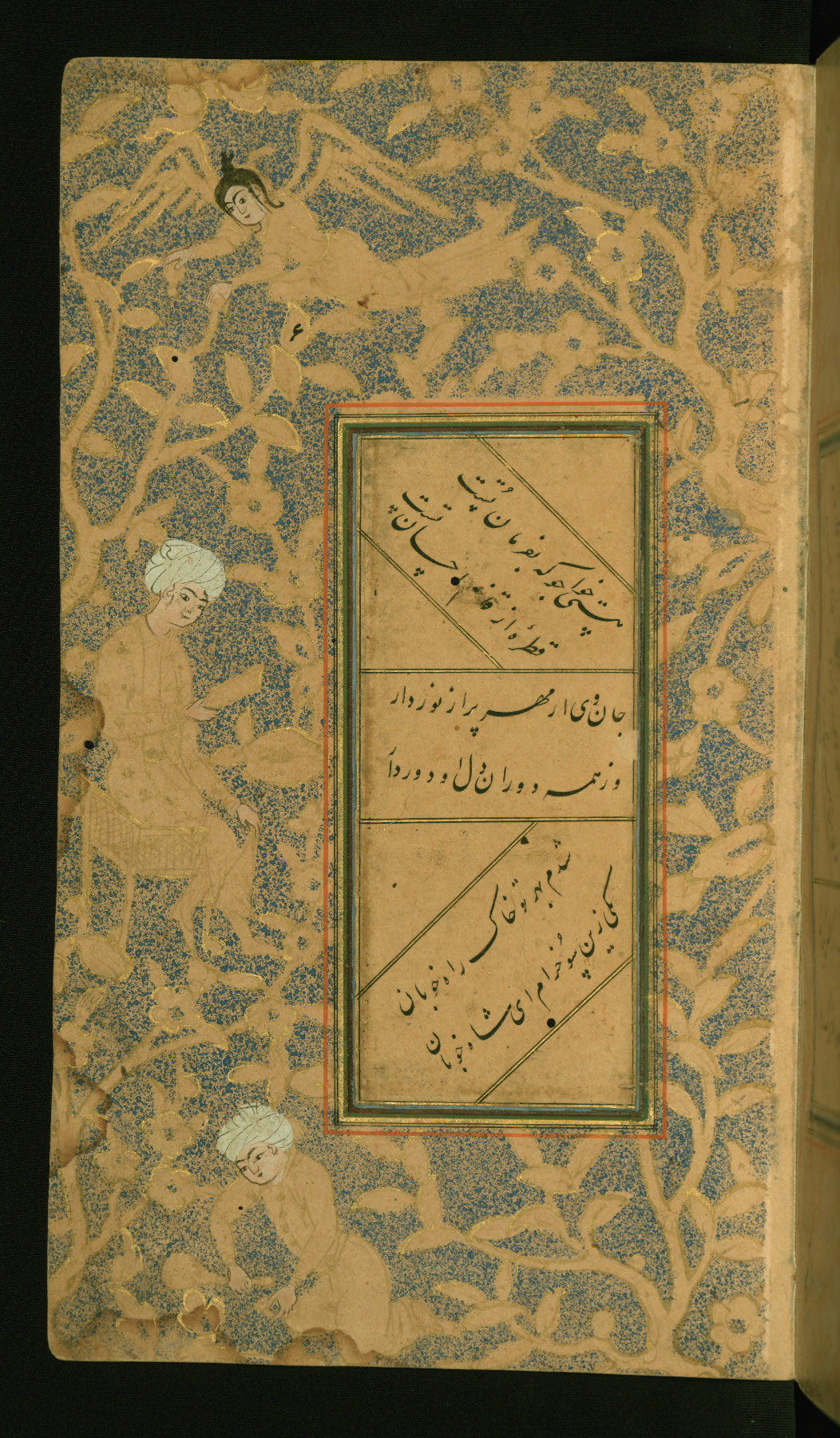 This illuminated and illustrated anthology was compiled in 1105 AH / 1693 CE in Safavid Iran. The manuscript includes works by such poets as Jāmī, Azārī, Fayz̤ī, Navāʾī, and Saʿdī. The margins of colored and marbled paper are decorated with stenciled, illuminated, and painted motifs, including an angel, a young man reading a book, a youth pouring wine, and various animals. There are five paintings in the codex (fols. 8b, 16b, 17a, 19b, and 24b). The green leather binding is not original to the codex and probably dates to the thirteenth century AH / nineteenth CE.