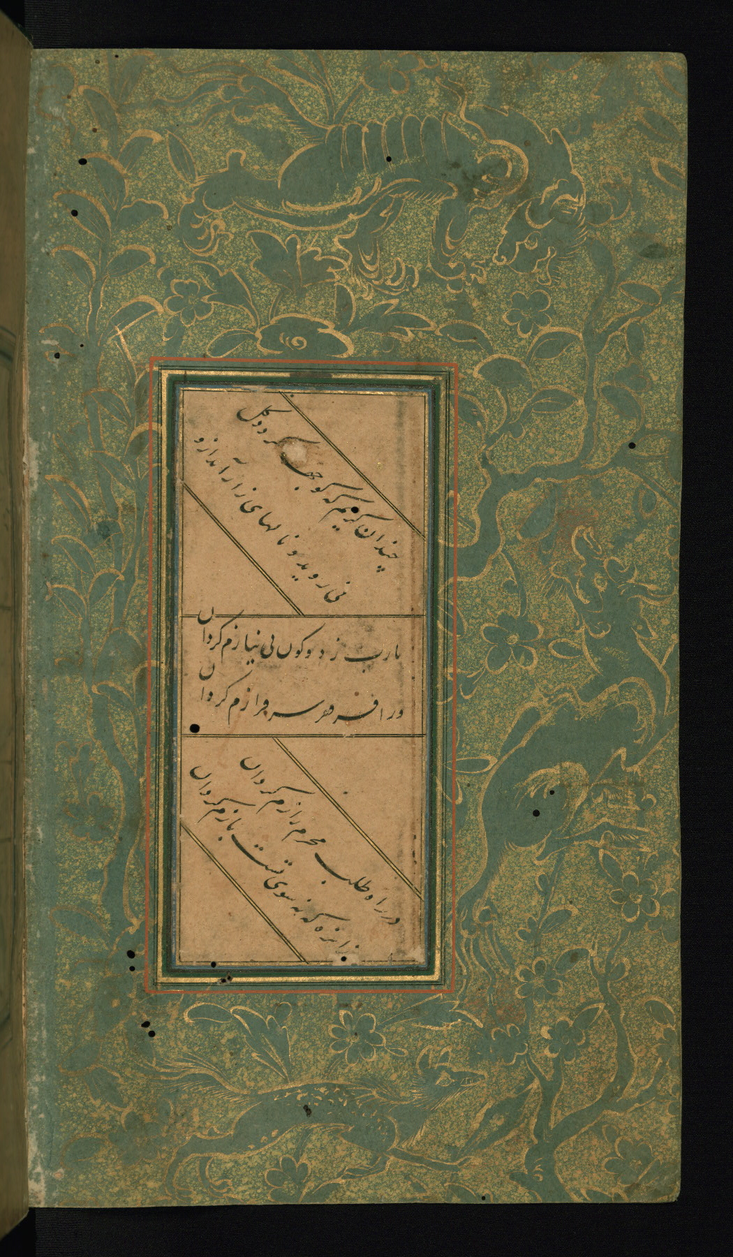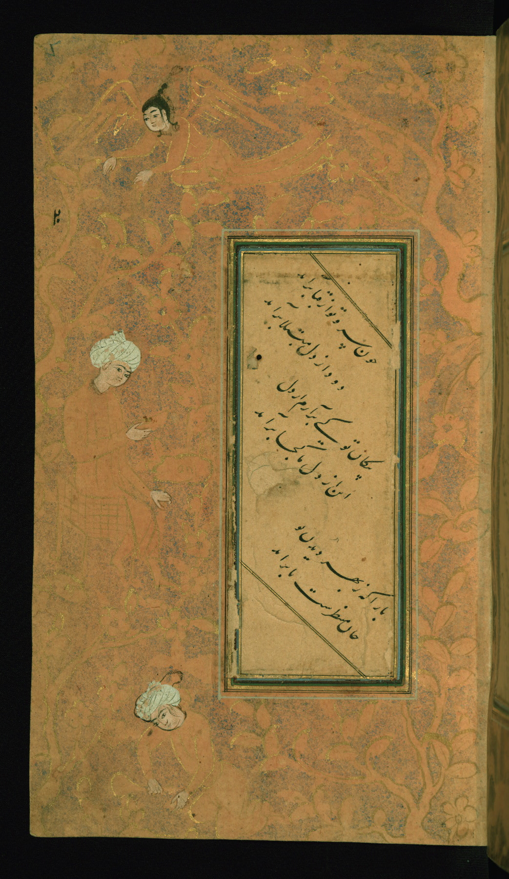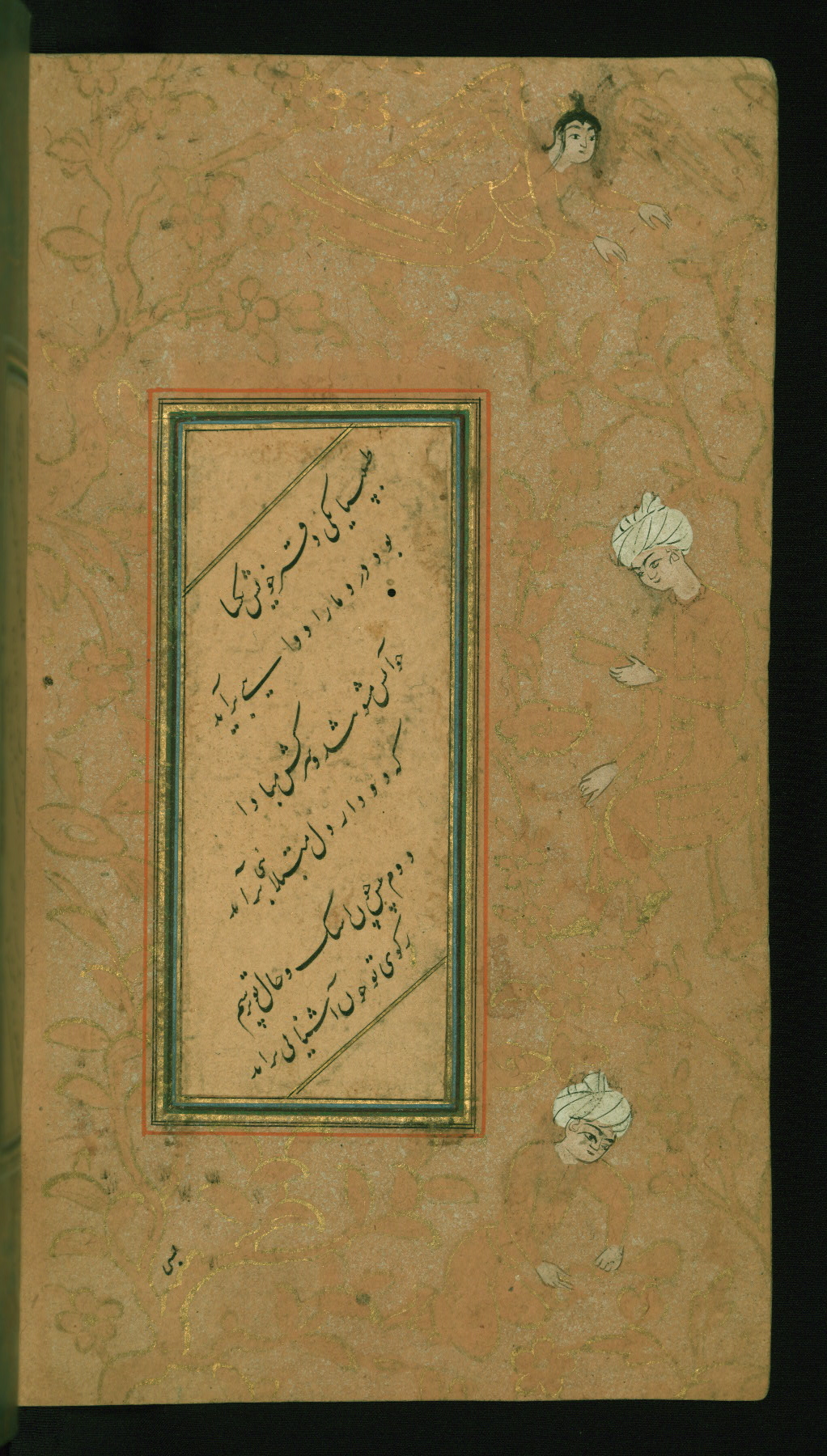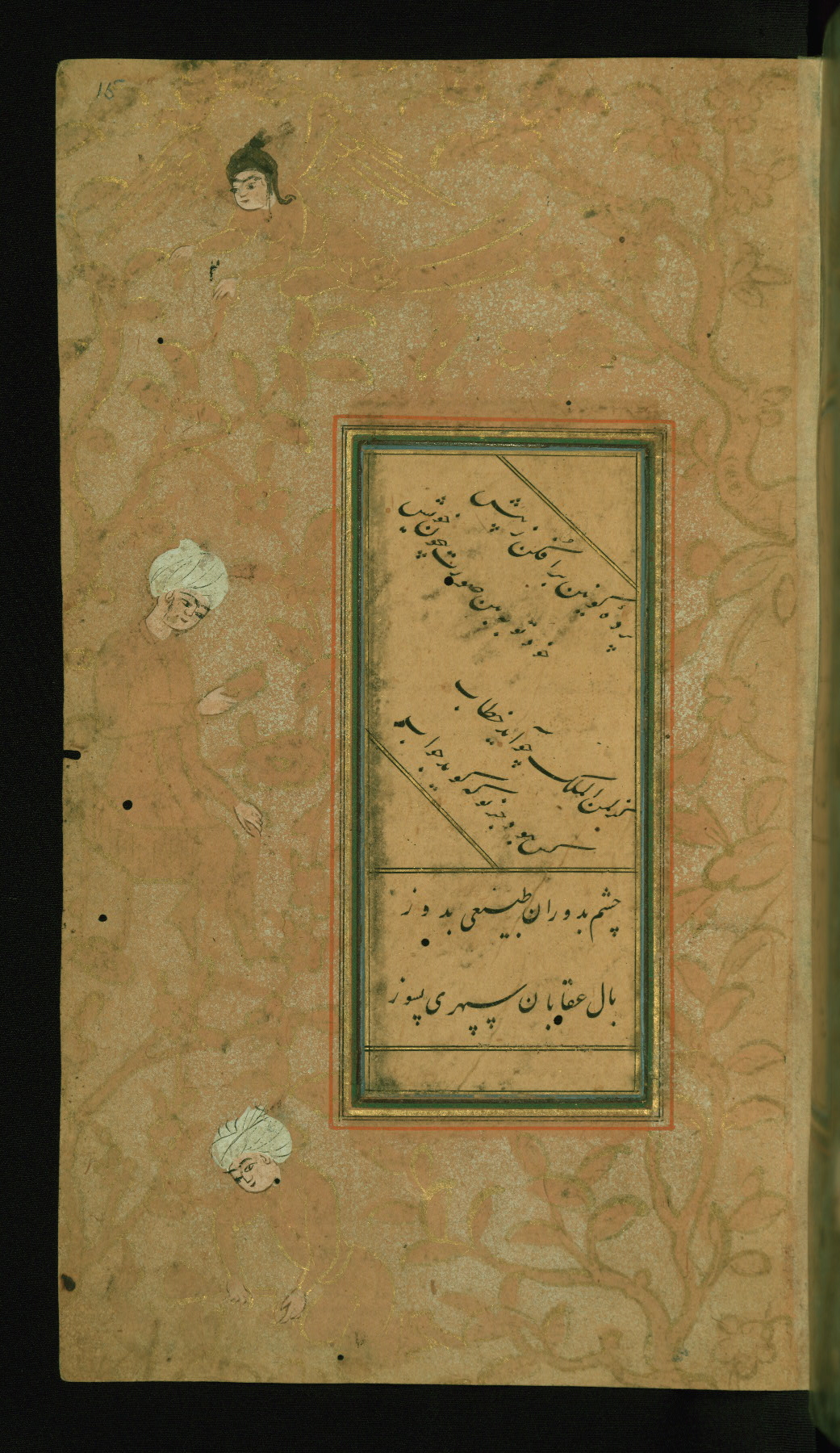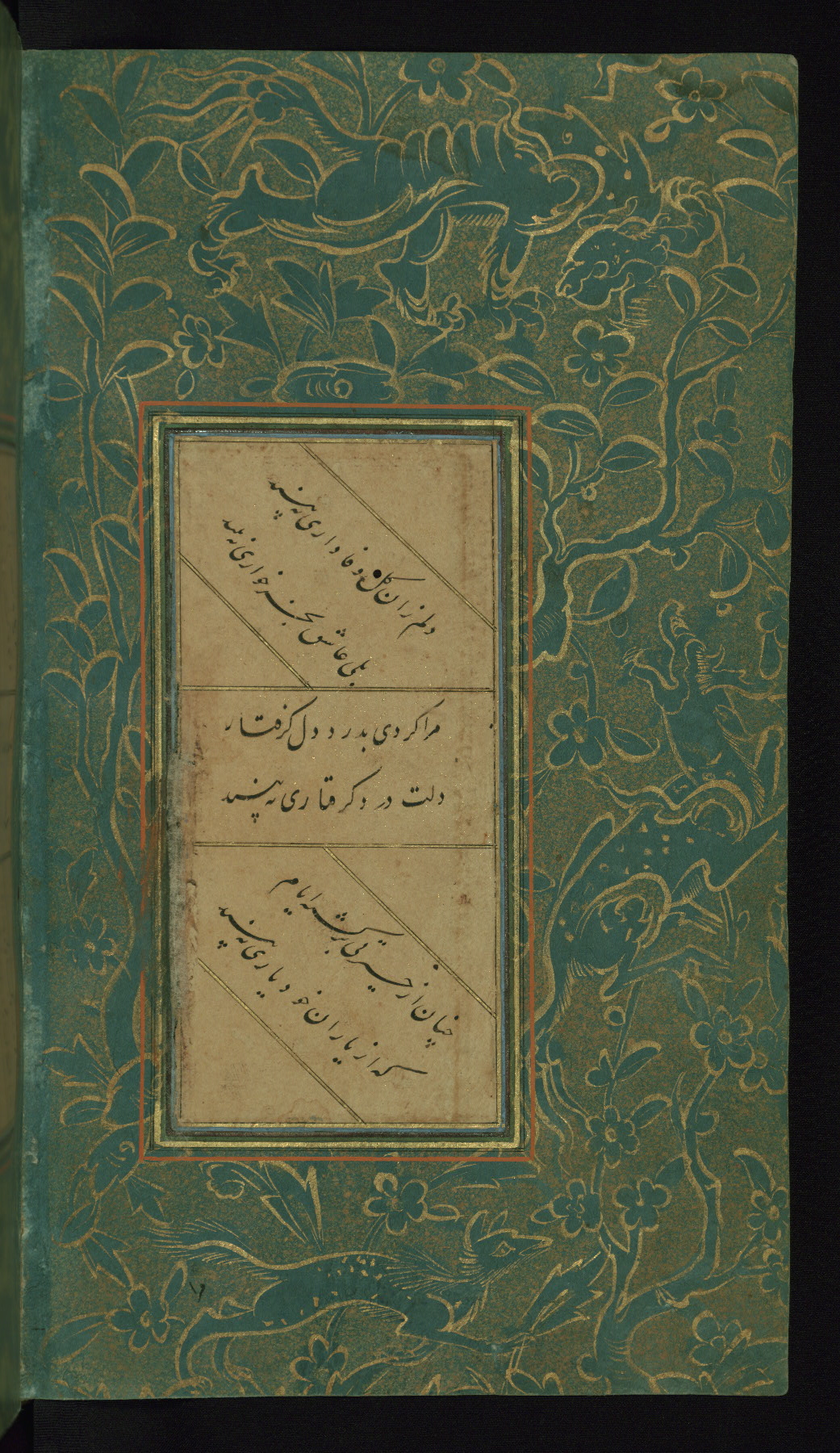 This illuminated and illustrated anthology was compiled in 1105 AH / 1693 CE in Safavid Iran. The manuscript includes works by such poets as Jāmī, Azārī, Fayz̤ī, Navāʾī, and Saʿdī. The margins of colored and marbled paper are decorated with stenciled, illuminated, and painted motifs, including an angel, a young man reading a book, a youth pouring wine, and various animals. There are five paintings in the codex (fols. 8b, 16b, 17a, 19b, and 24b). The green leather binding is not original to the codex and probably dates to the thirteenth century AH / nineteenth CE.