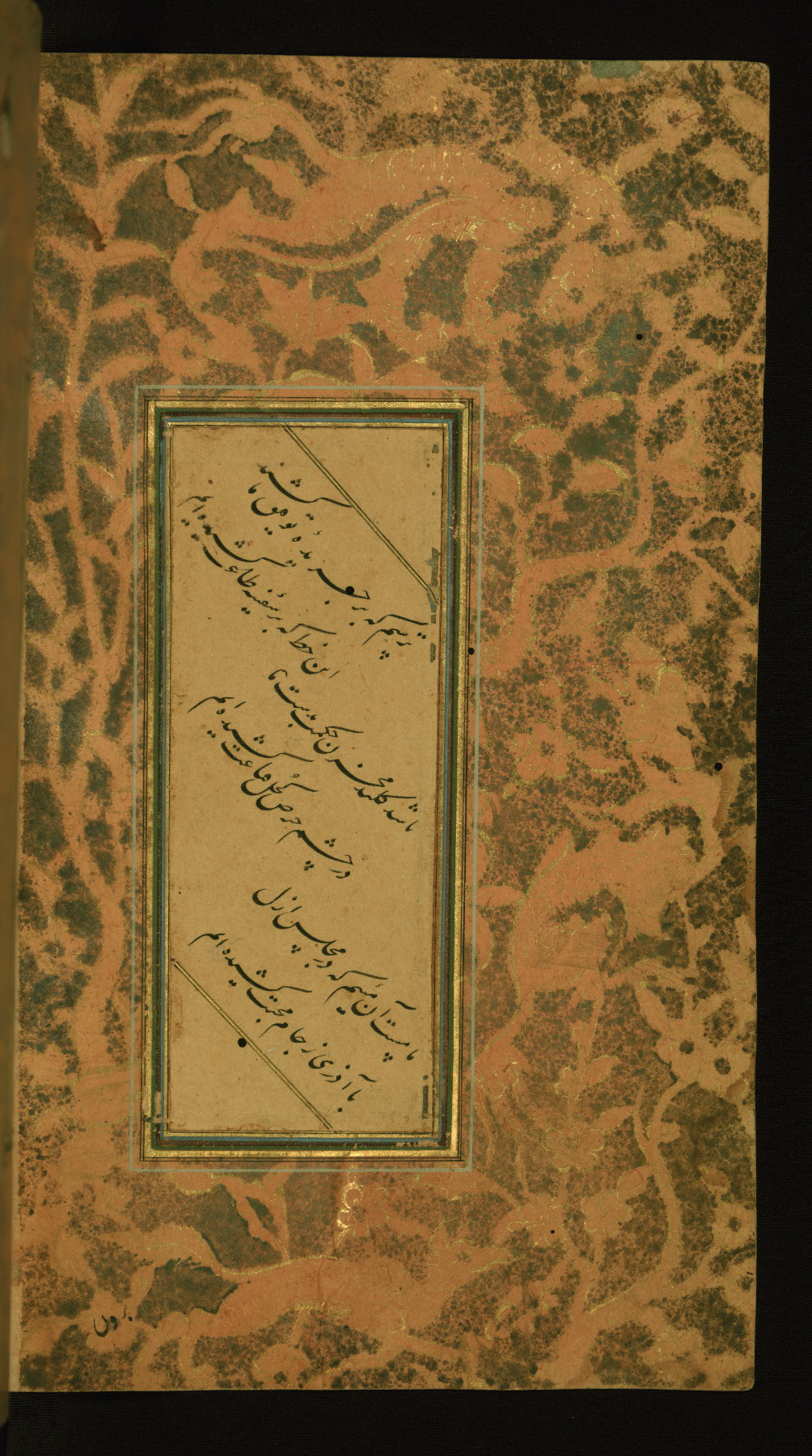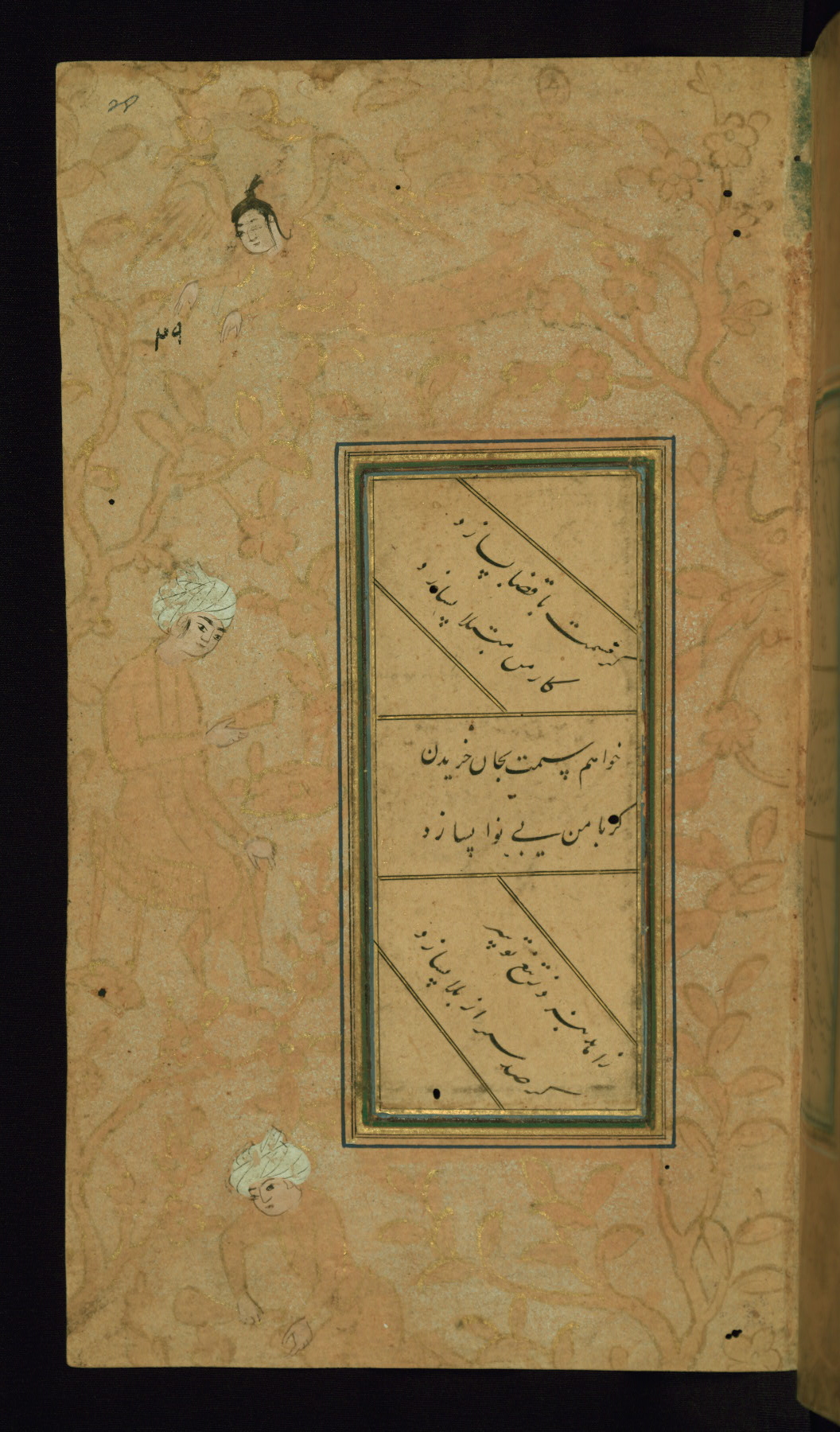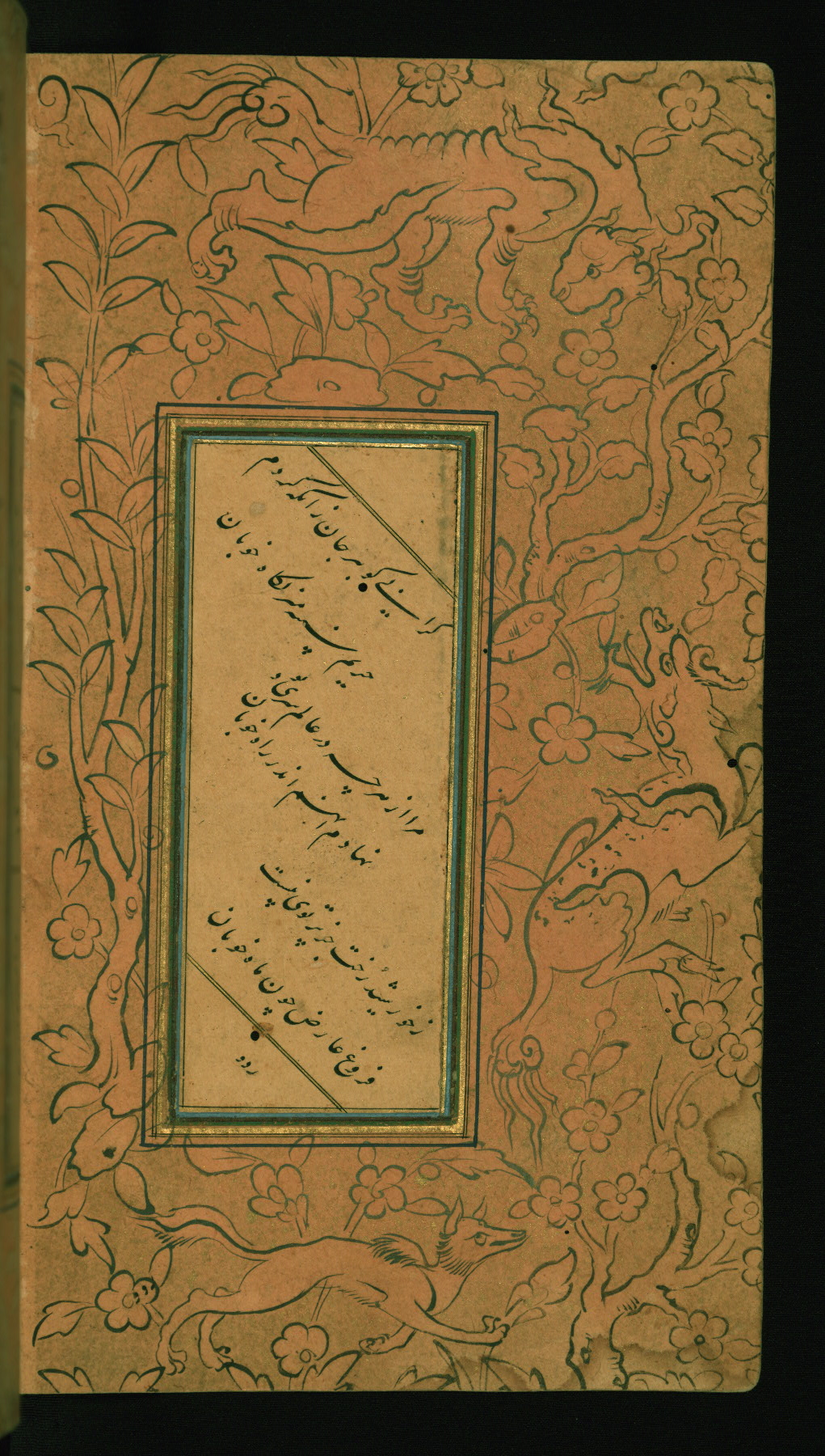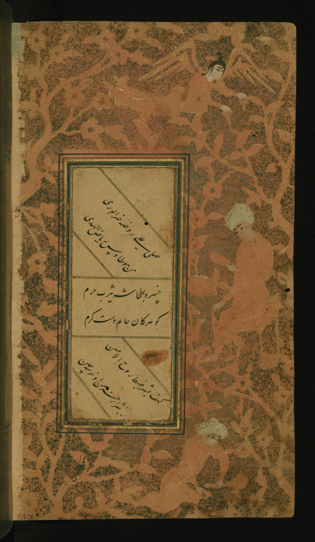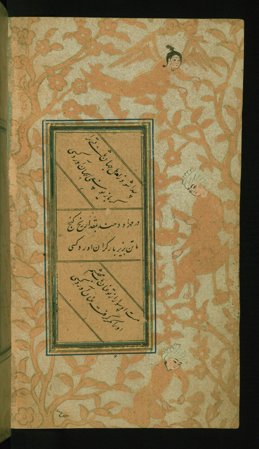 This illuminated and illustrated anthology was compiled in 1105 AH / 1693 CE in Safavid Iran. The manuscript includes works by such poets as Jāmī, Azārī, Fayz̤ī, Navāʾī, and Saʿdī. The margins of colored and marbled paper are decorated with stenciled, illuminated, and painted motifs, including an angel, a young man reading a book, a youth pouring wine, and various animals. There are five paintings in the codex (fols. 8b, 16b, 17a, 19b, and 24b). The green leather binding is not original to the codex and probably dates to the thirteenth century AH / nineteenth CE.
