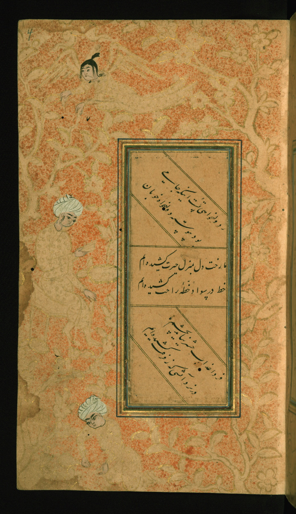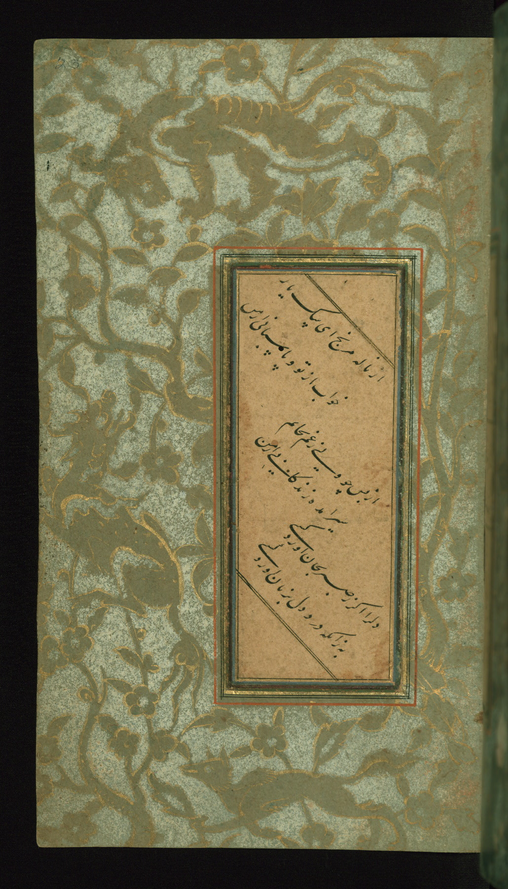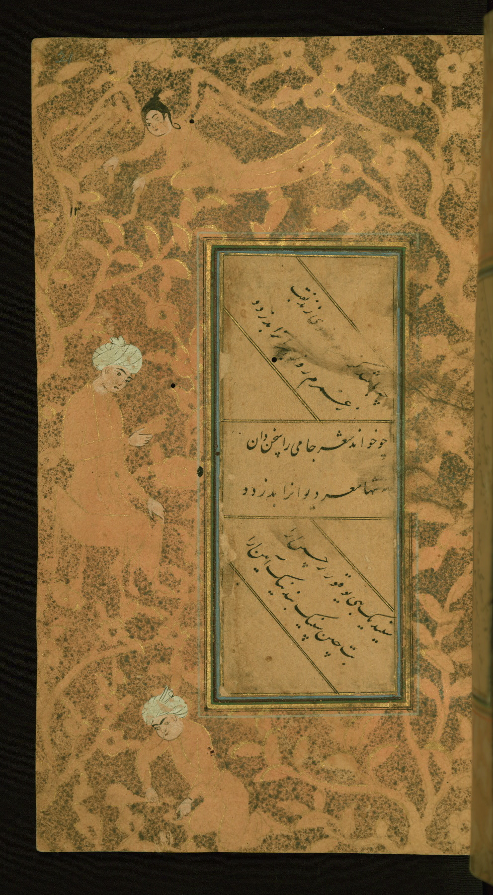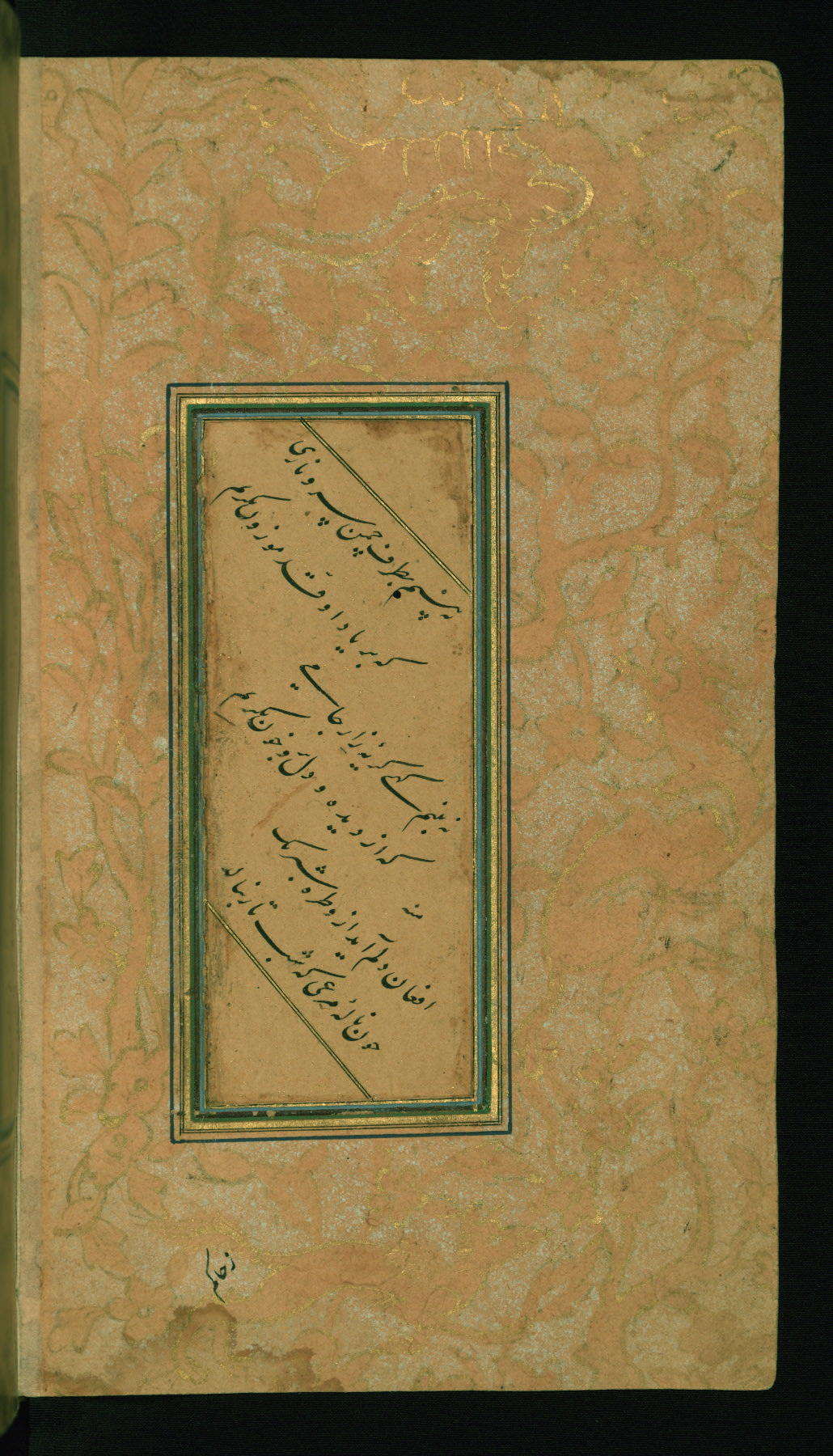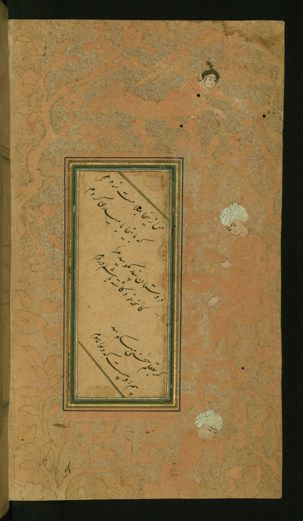 This illuminated and illustrated anthology was compiled in 1105 AH / 1693 CE in Safavid Iran. The manuscript includes works by such poets as Jāmī, Azārī, Fayz̤ī, Navāʾī, and Saʿdī. The margins of colored and marbled paper are decorated with stenciled, illuminated, and painted motifs, including an angel, a young man reading a book, a youth pouring wine, and various animals. There are five paintings in the codex (fols. 8b, 16b, 17a, 19b, and 24b). The green leather binding is not original to the codex and probably dates to the thirteenth century AH / nineteenth CE.