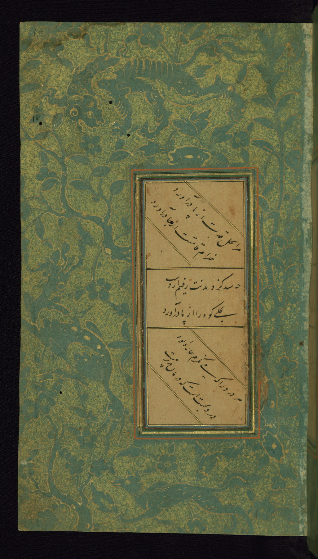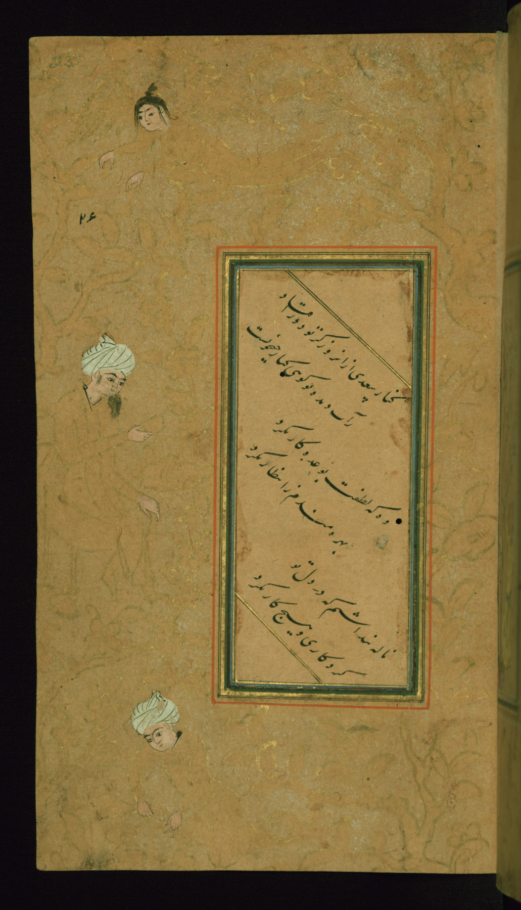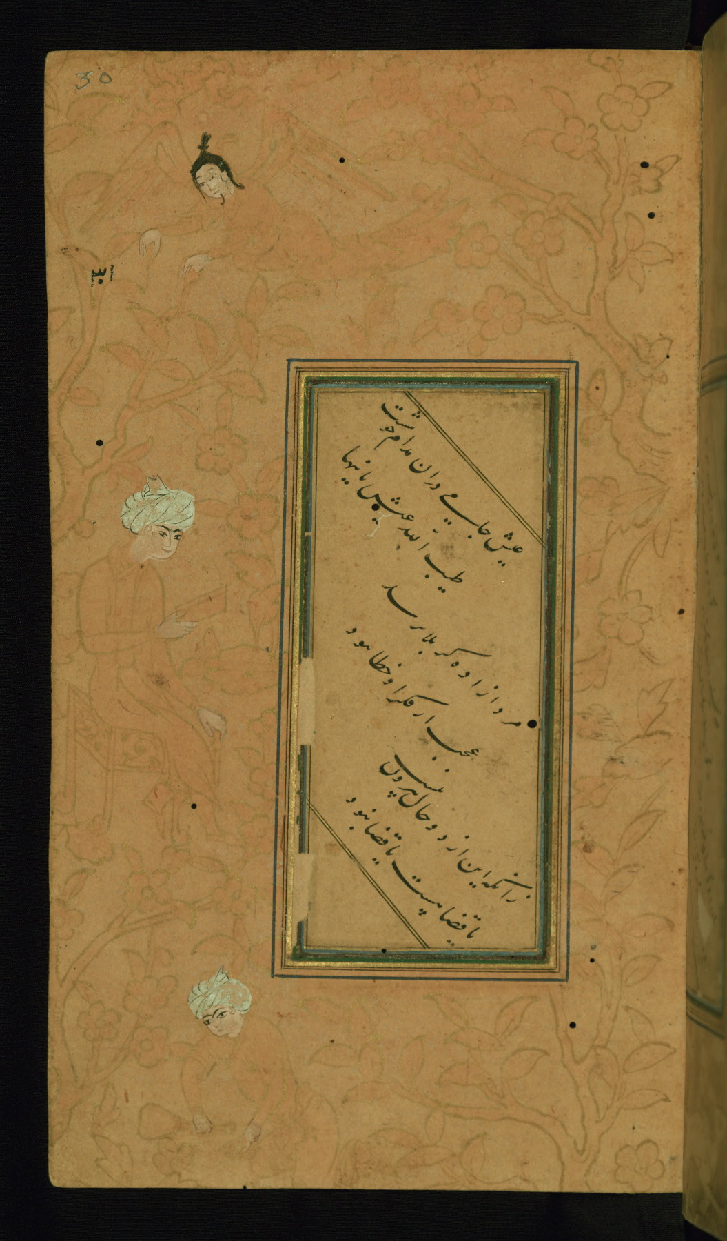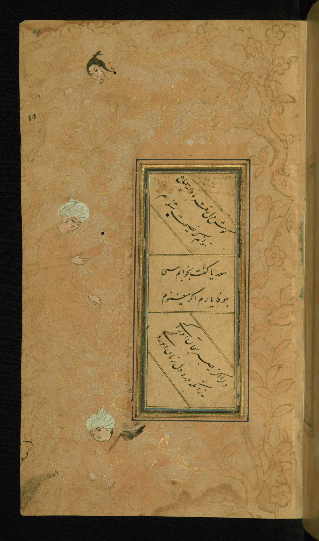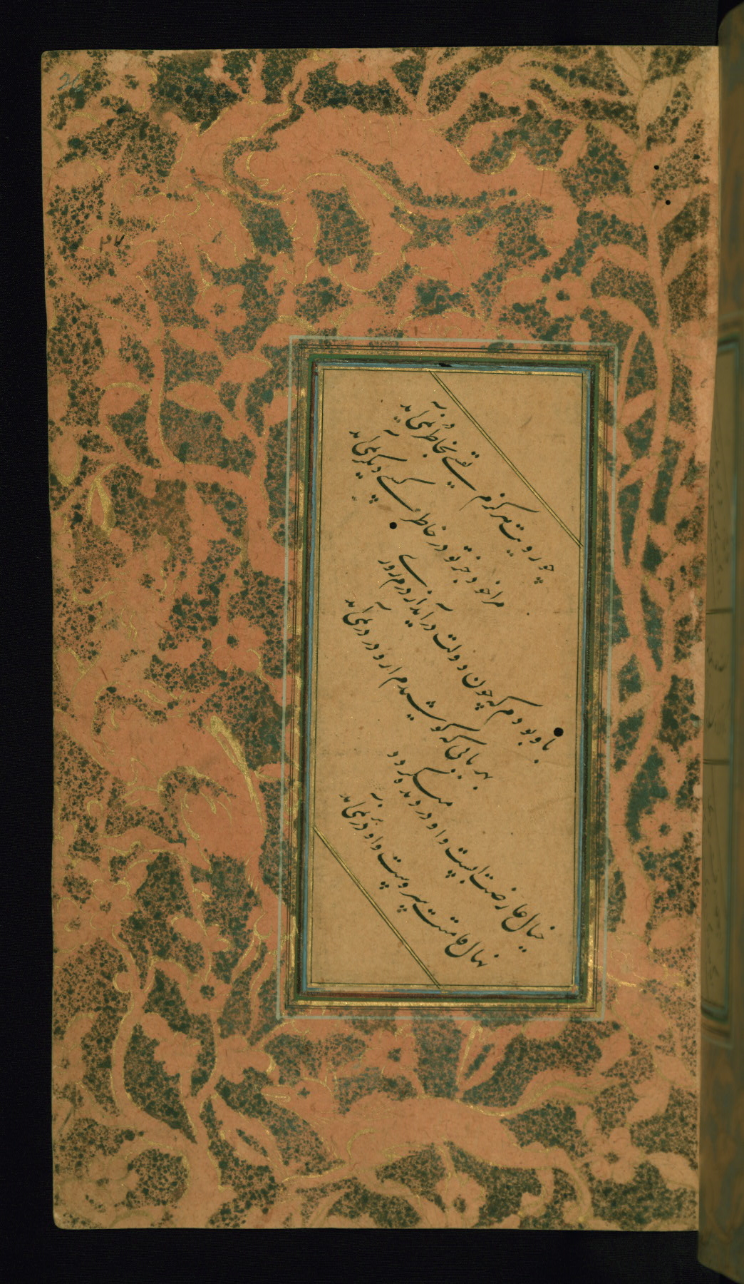 This illuminated and illustrated anthology was compiled in 1105 AH / 1693 CE in Safavid Iran. The manuscript includes works by such poets as Jāmī, Azārī, Fayz̤ī, Navāʾī, and Saʿdī. The margins of colored and marbled paper are decorated with stenciled, illuminated, and painted motifs, including an angel, a young man reading a book, a youth pouring wine, and various animals. There are five paintings in the codex (fols. 8b, 16b, 17a, 19b, and 24b). The green leather binding is not original to the codex and probably dates to the thirteenth century AH / nineteenth CE.