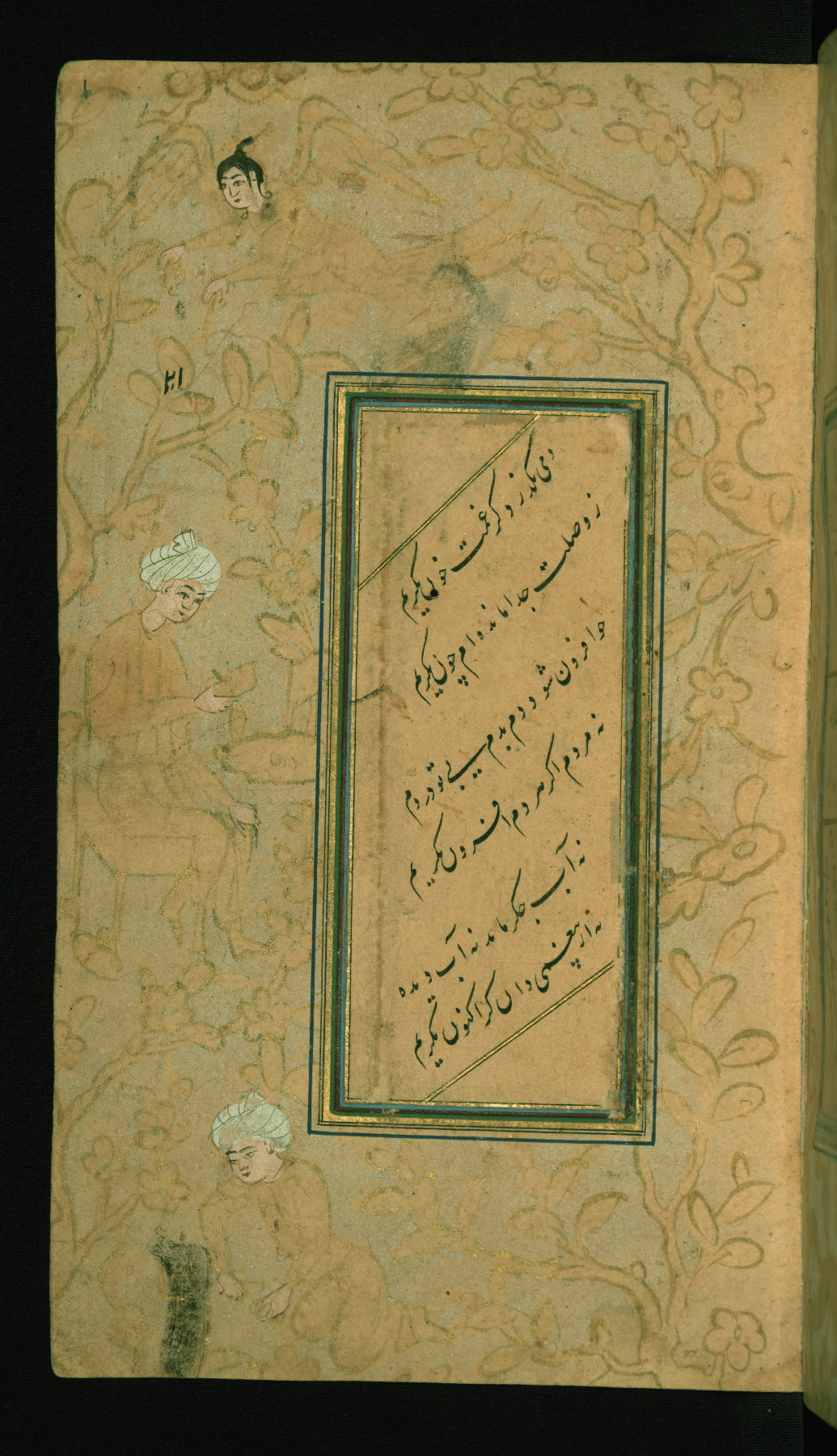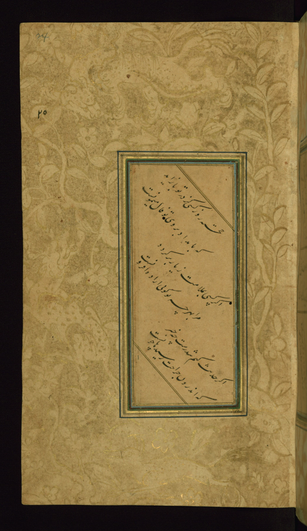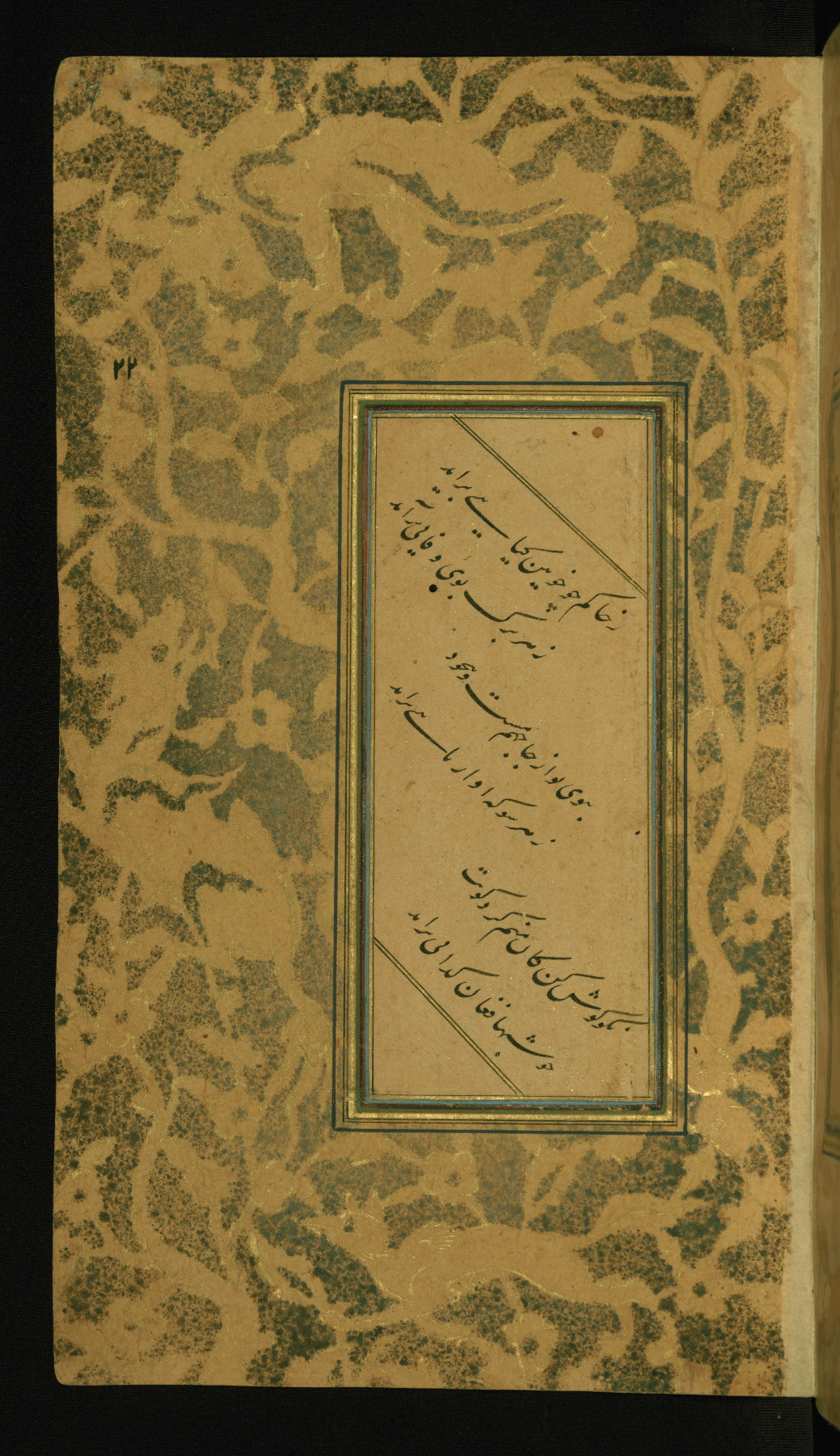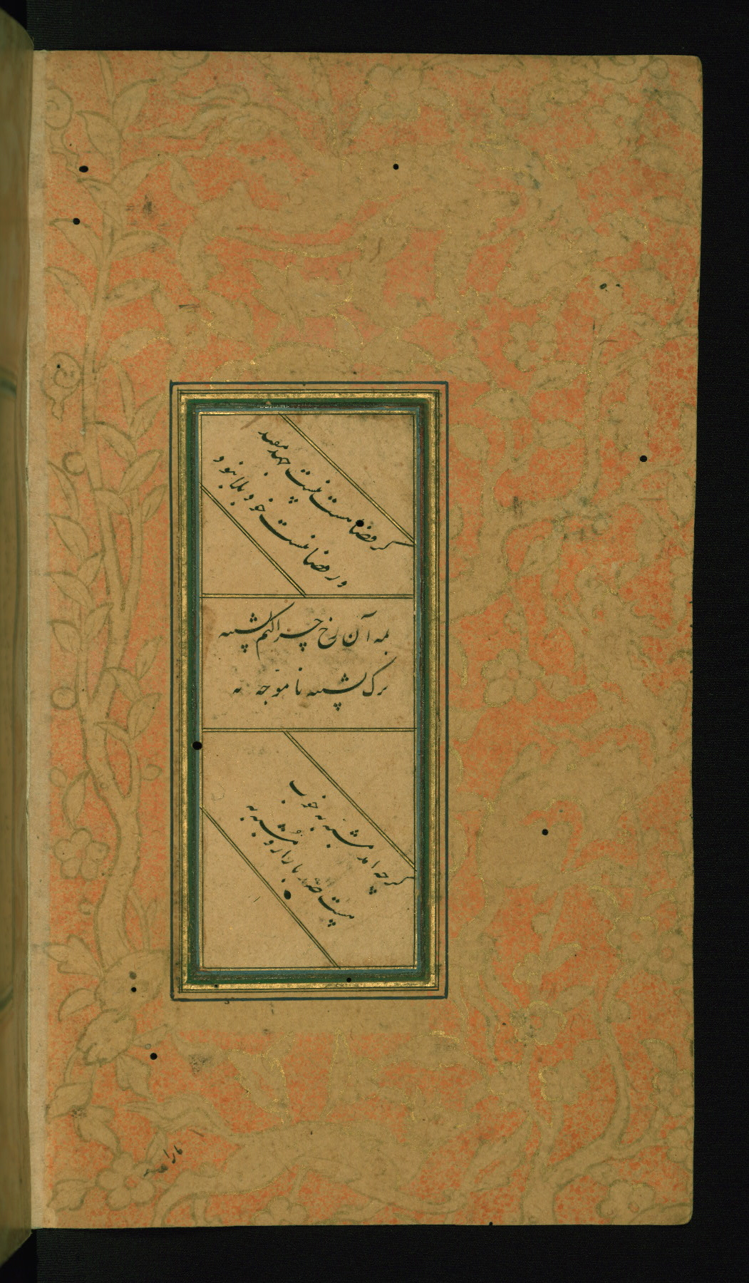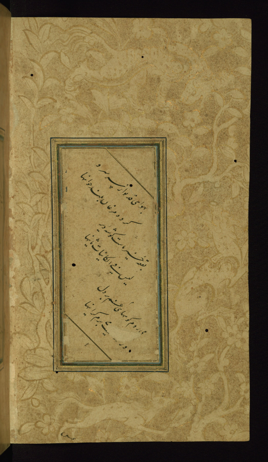 This illuminated and illustrated anthology was compiled in 1105 AH / 1693 CE in Safavid Iran. The manuscript includes works by such poets as Jāmī, Azārī, Fayz̤ī, Navāʾī, and Saʿdī. The margins of colored and marbled paper are decorated with stenciled, illuminated, and painted motifs, including an angel, a young man reading a book, a youth pouring wine, and various animals. There are five paintings in the codex (fols. 8b, 16b, 17a, 19b, and 24b). The green leather binding is not original to the codex and probably dates to the thirteenth century AH / nineteenth CE.