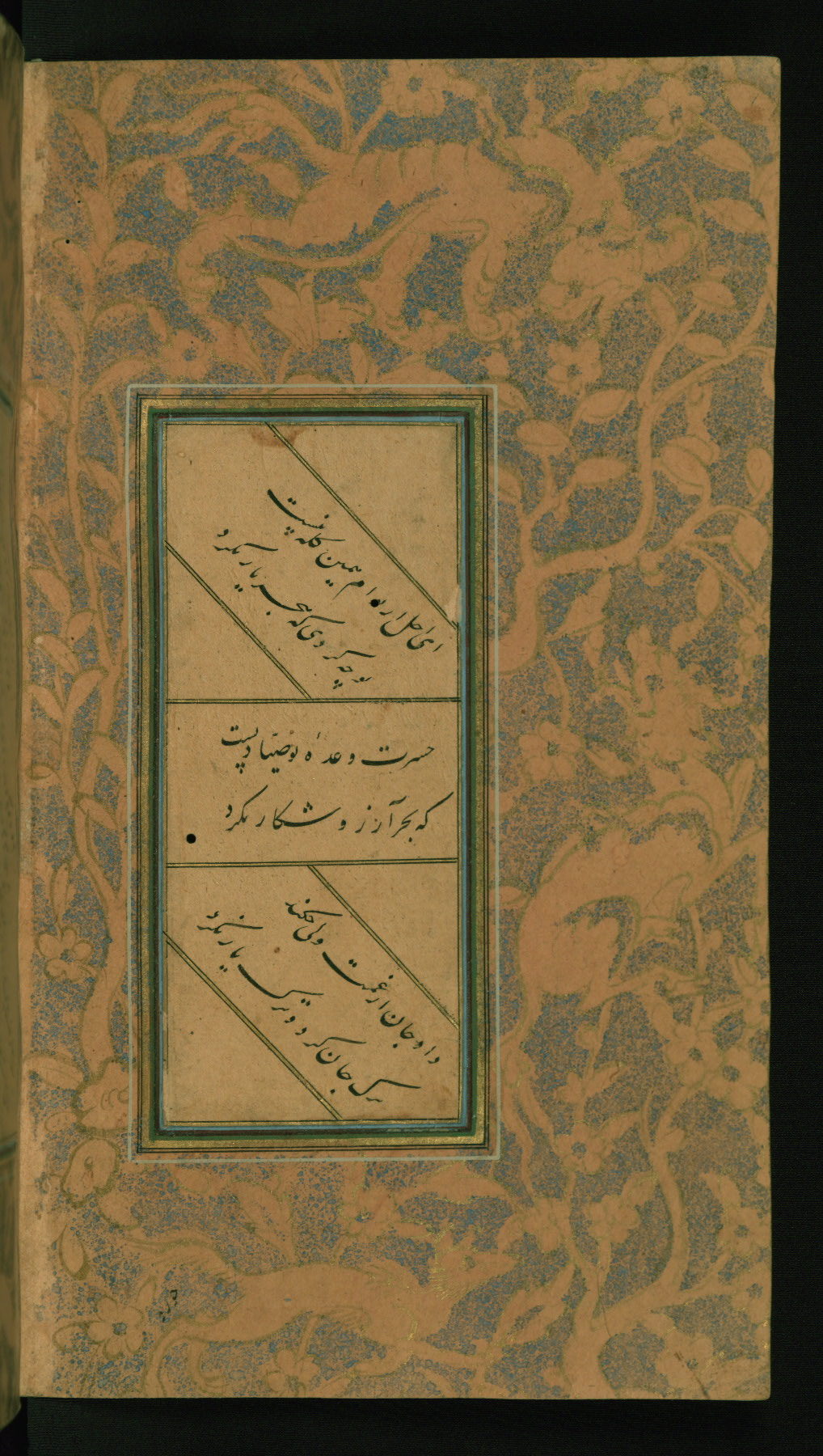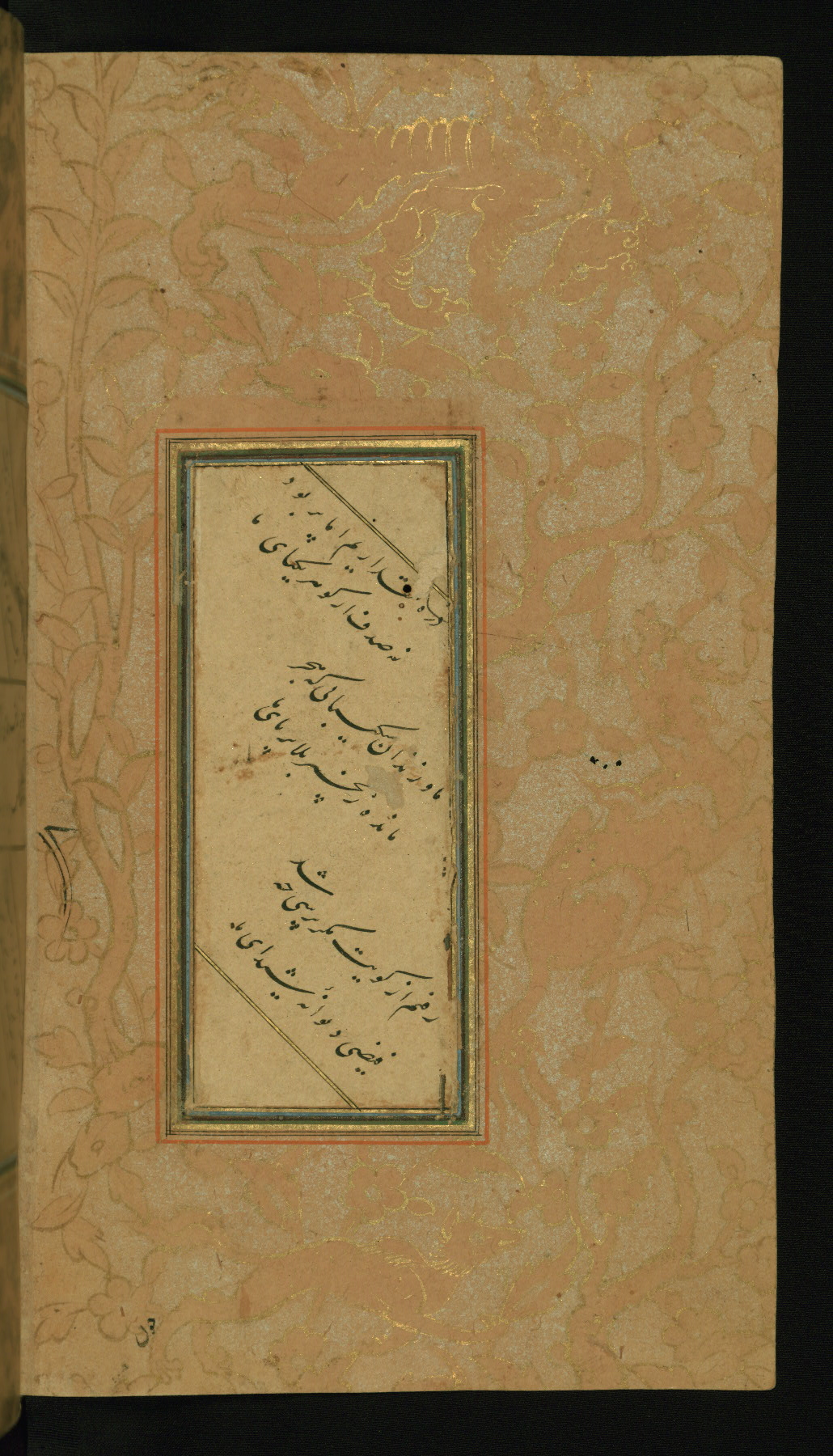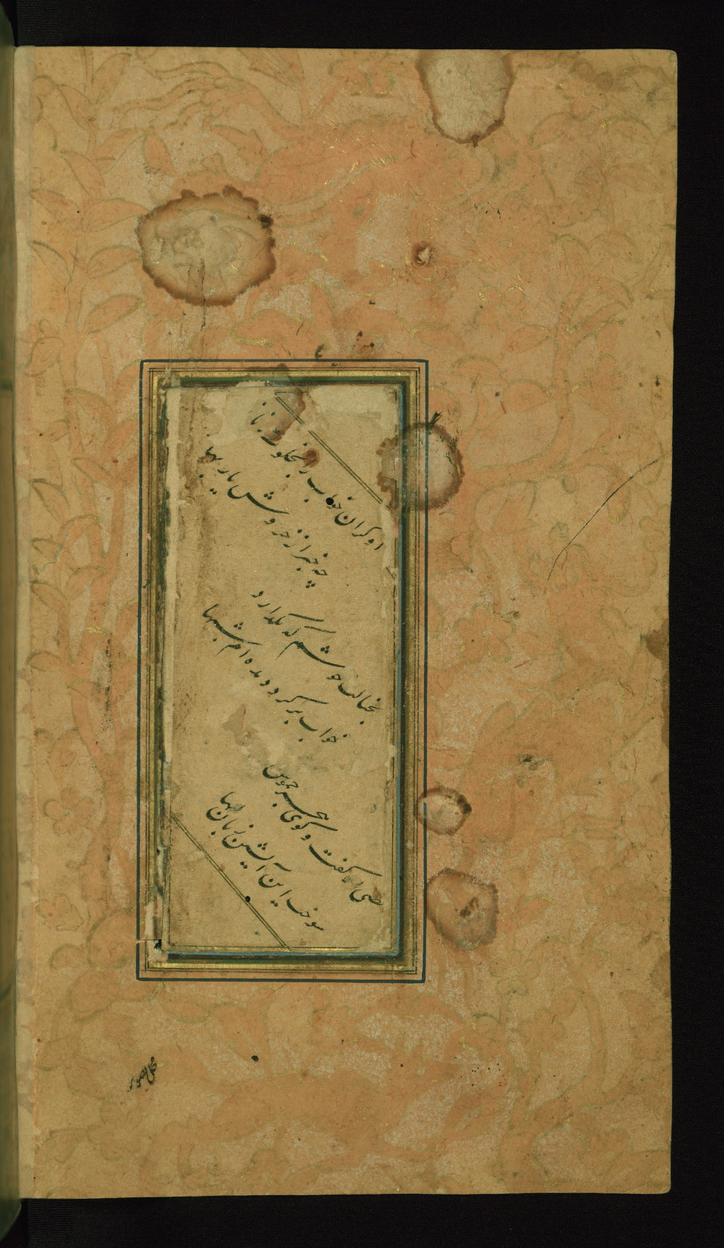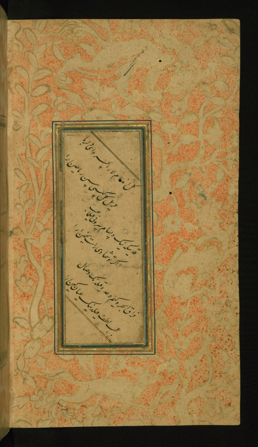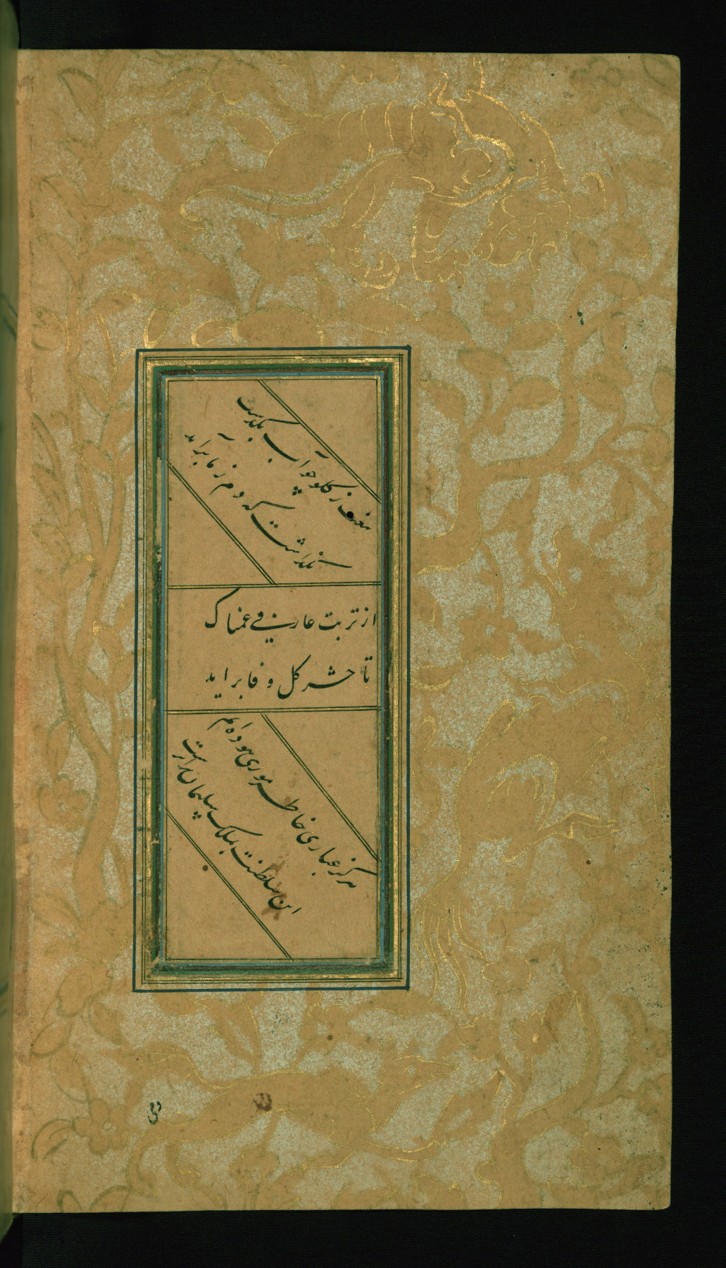 This illuminated and illustrated anthology was compiled in 1105 AH / 1693 CE in Safavid Iran. The manuscript includes works by such poets as Jāmī, Azārī, Fayz̤ī, Navāʾī, and Saʿdī. The margins of colored and marbled paper are decorated with stenciled, illuminated, and painted motifs, including an angel, a young man reading a book, a youth pouring wine, and various animals. There are five paintings in the codex (fols. 8b, 16b, 17a, 19b, and 24b). The green leather binding is not original to the codex and probably dates to the thirteenth century AH / nineteenth CE.