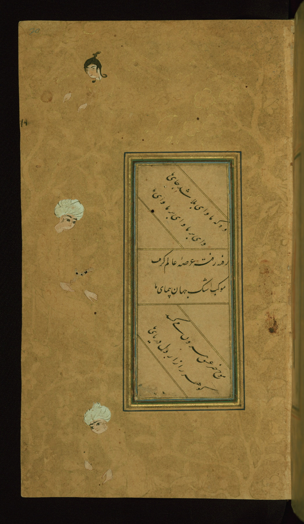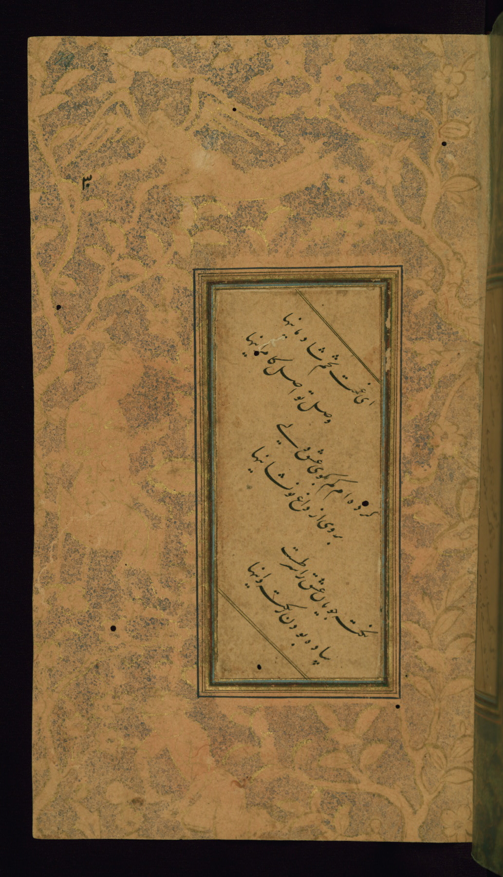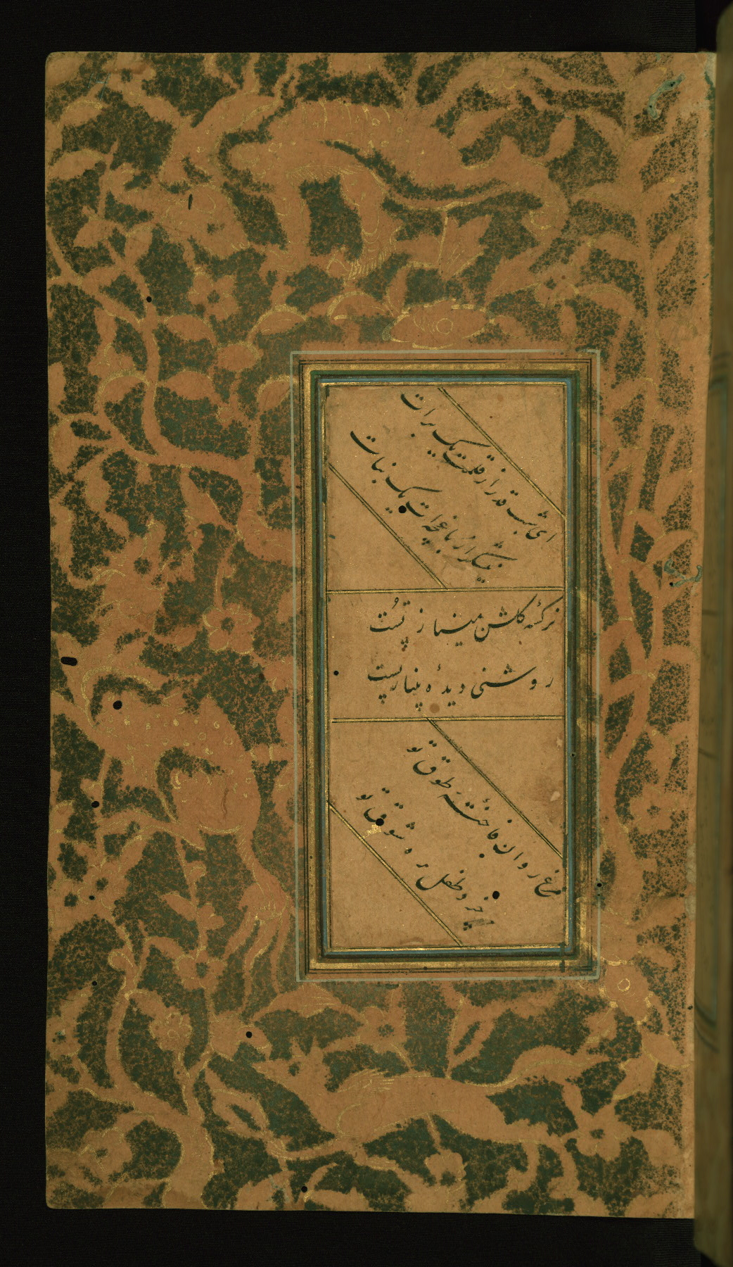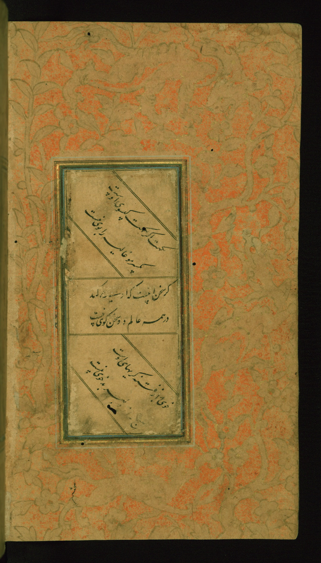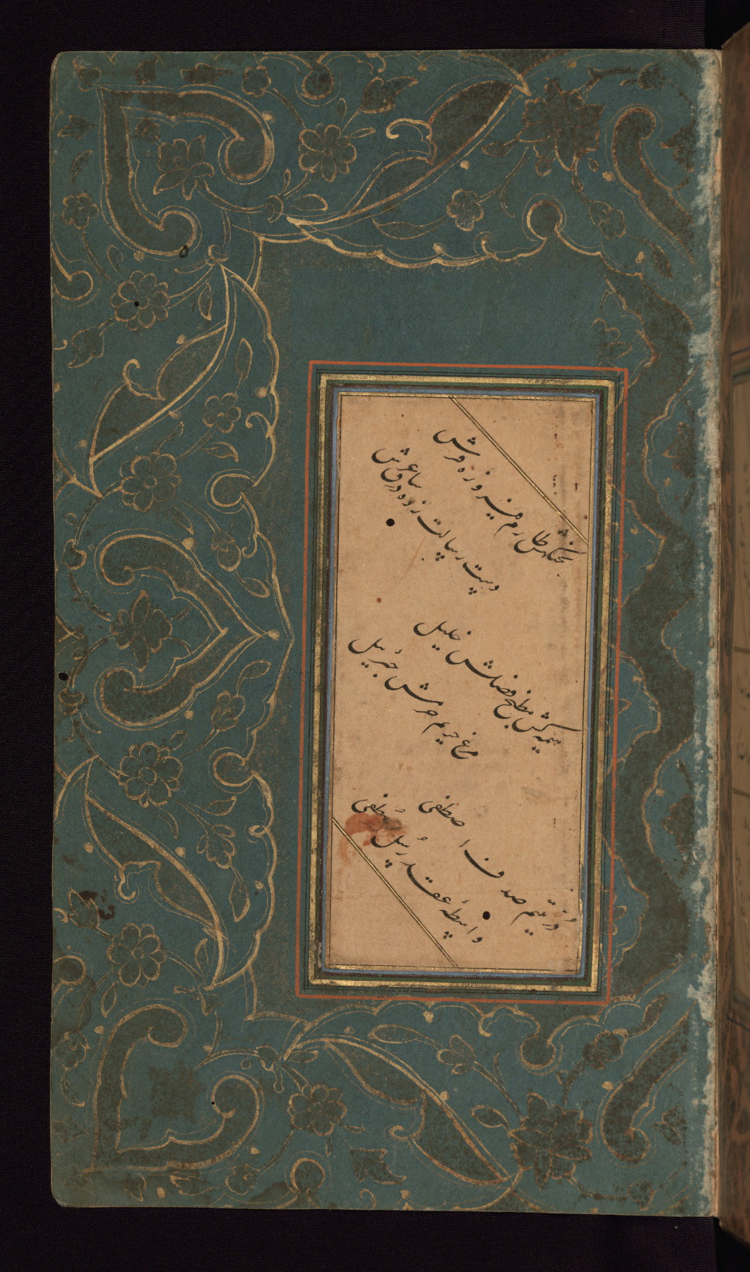 This illuminated and illustrated anthology was compiled in 1105 AH / 1693 CE in Safavid Iran. The manuscript includes works by such poets as Jāmī, Azārī, Fayz̤ī, Navāʾī, and Saʿdī. The margins of colored and marbled paper are decorated with stenciled, illuminated, and painted motifs, including an angel, a young man reading a book, a youth pouring wine, and various animals. There are five paintings in the codex (fols. 8b, 16b, 17a, 19b, and 24b). The green leather binding is not original to the codex and probably dates to the thirteenth century AH / nineteenth CE.