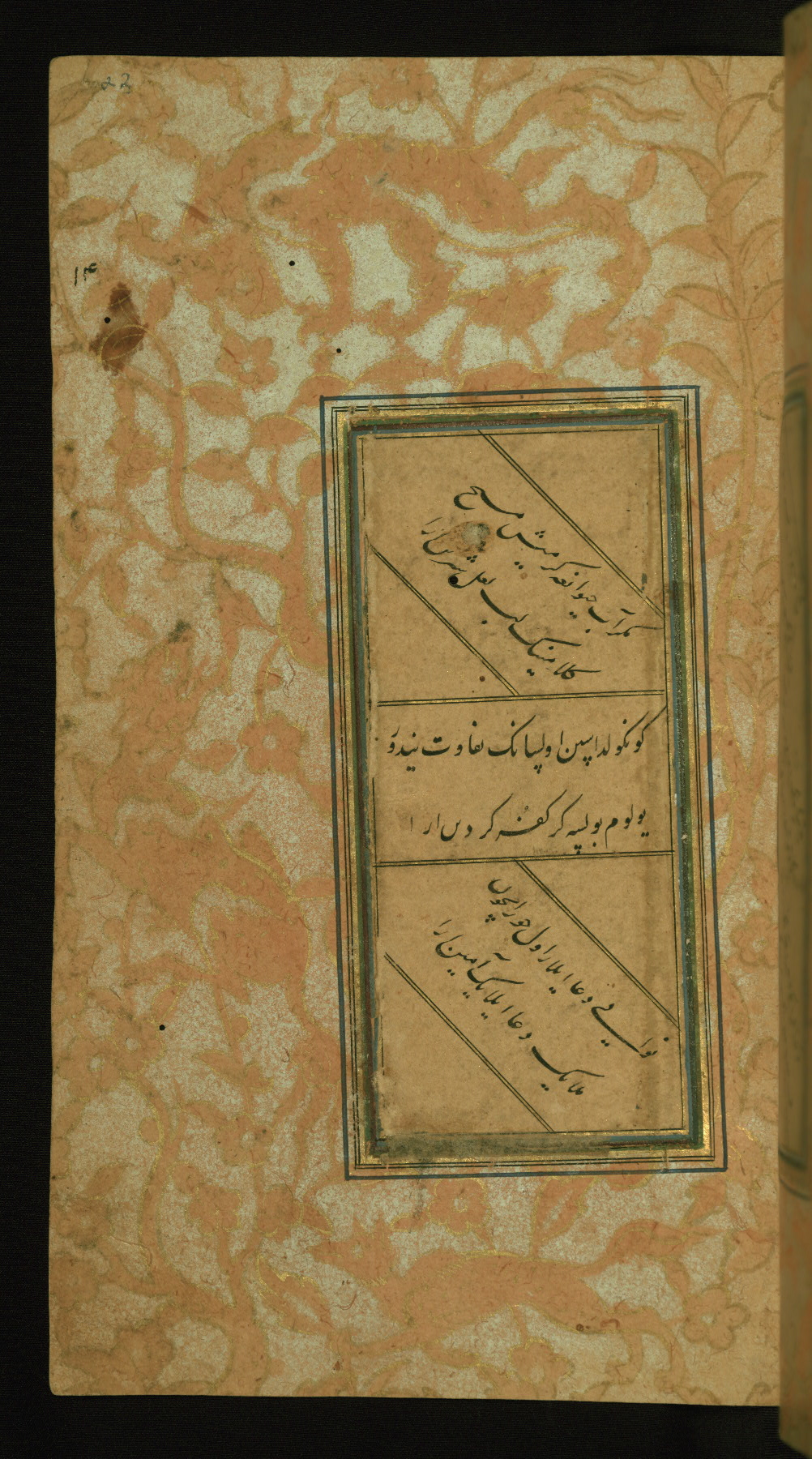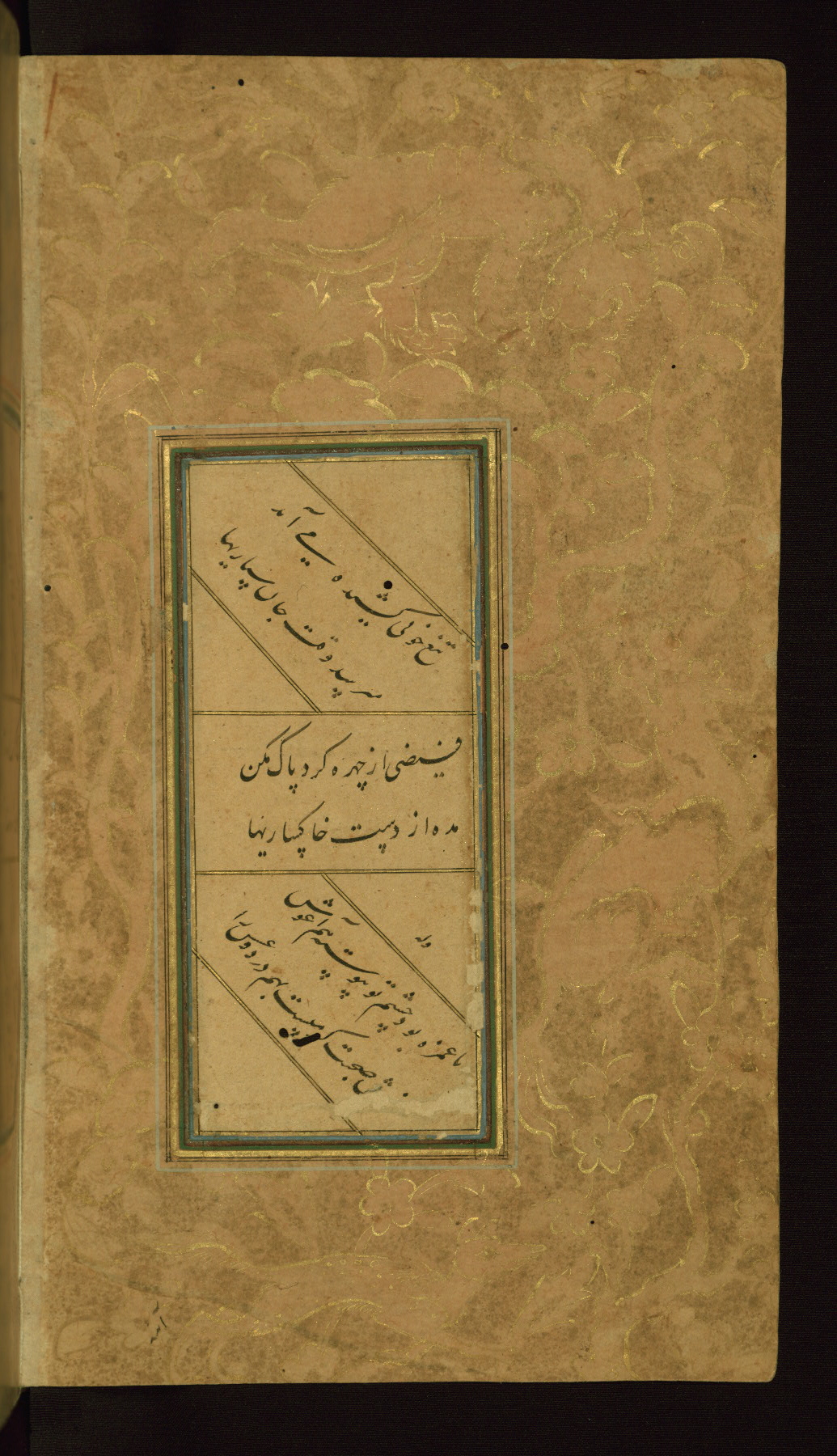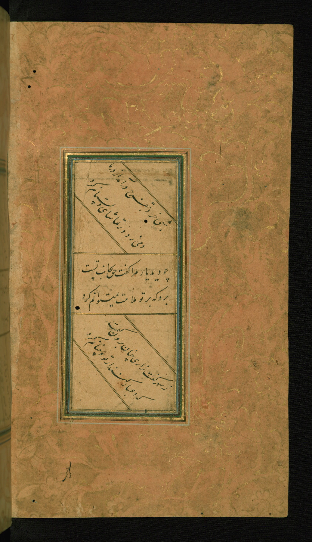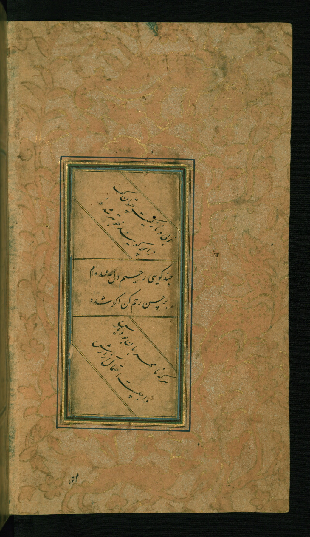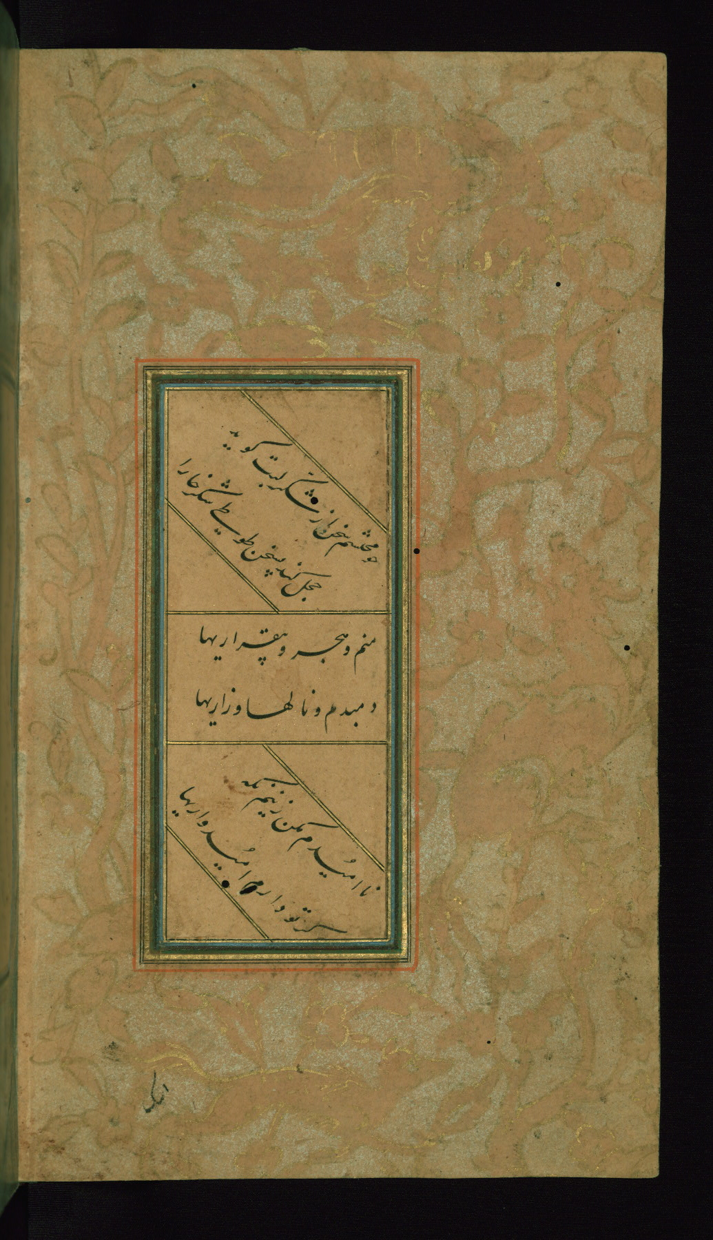 This illuminated and illustrated anthology was compiled in 1105 AH / 1693 CE in Safavid Iran. The manuscript includes works by such poets as Jāmī, Azārī, Fayz̤ī, Navāʾī, and Saʿdī. The margins of colored and marbled paper are decorated with stenciled, illuminated, and painted motifs, including an angel, a young man reading a book, a youth pouring wine, and various animals. There are five paintings in the codex (fols. 8b, 16b, 17a, 19b, and 24b). The green leather binding is not original to the codex and probably dates to the thirteenth century AH / nineteenth CE.