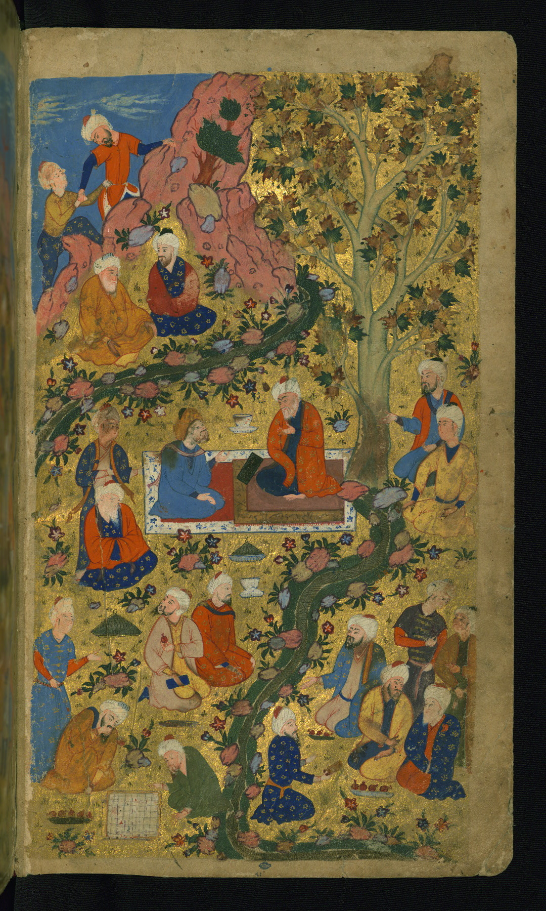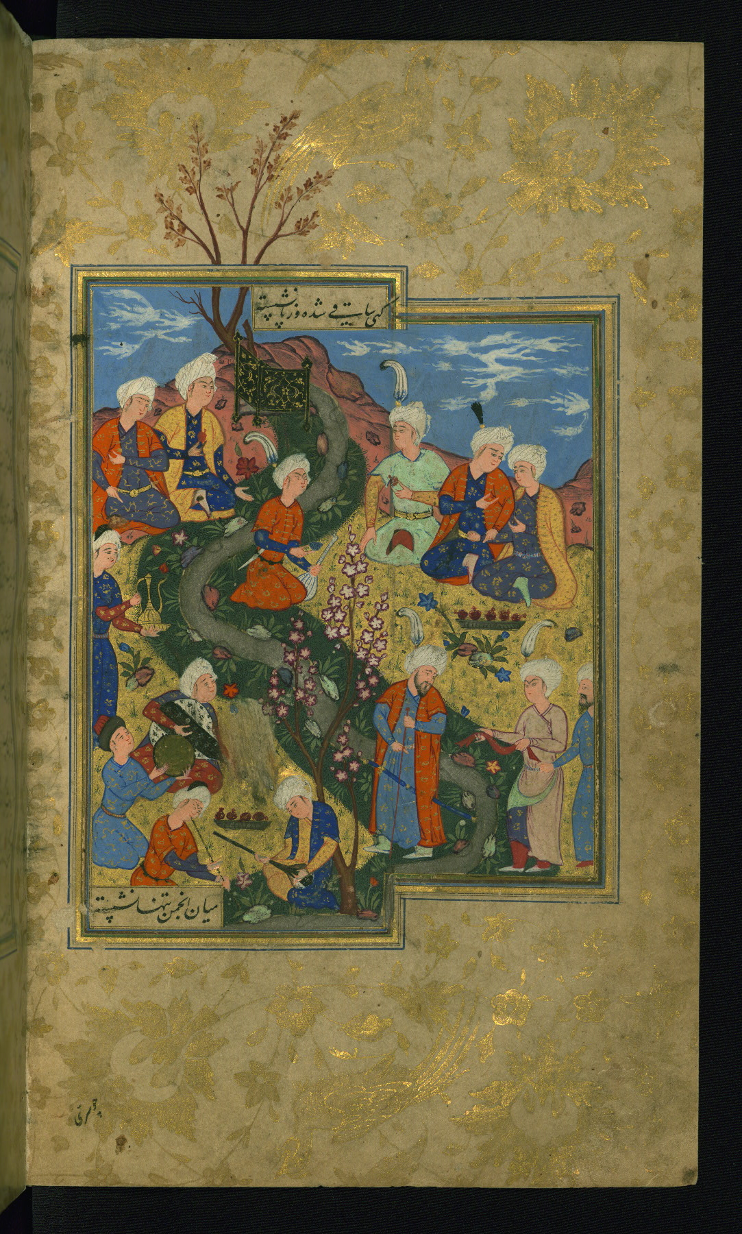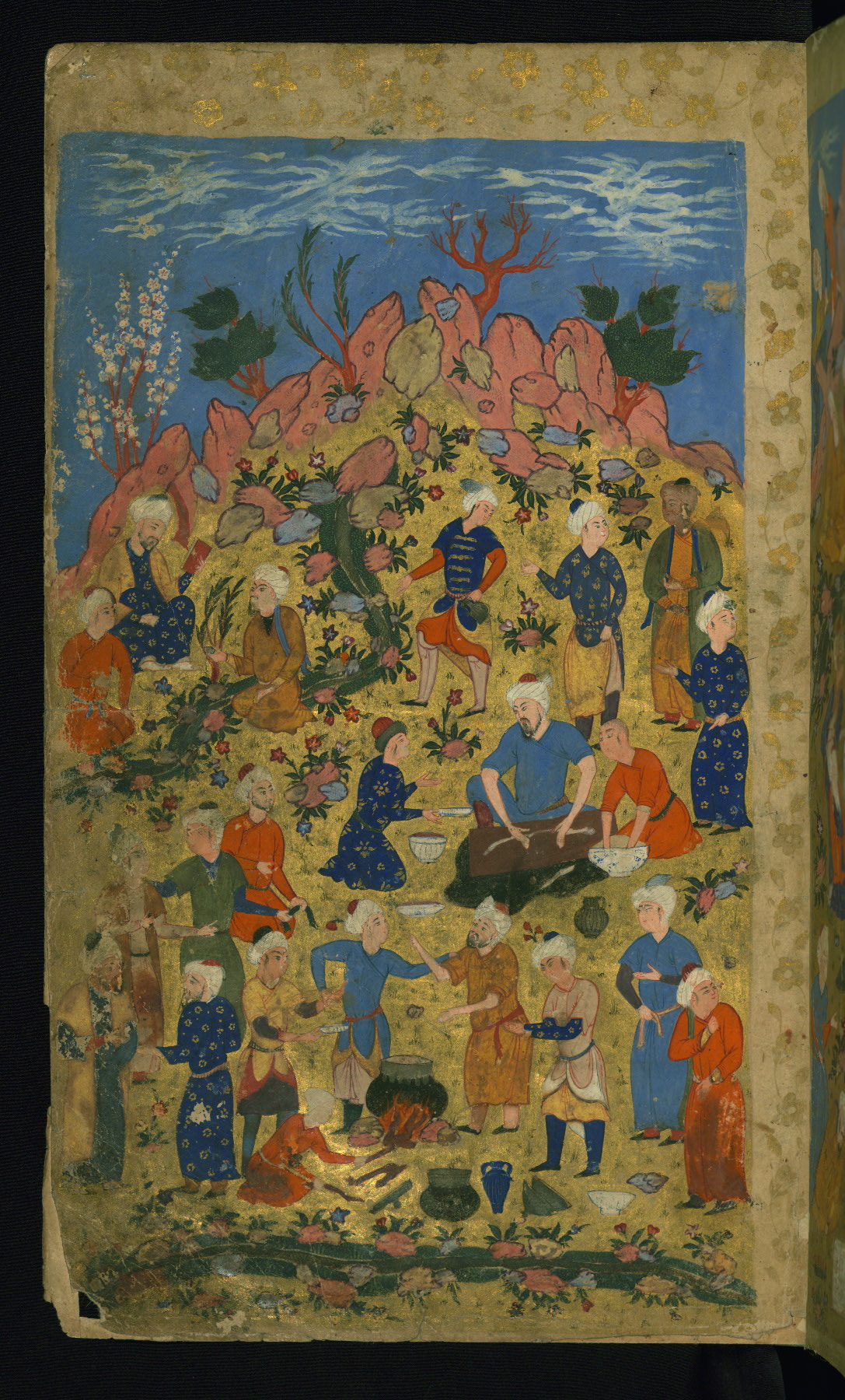 - Label: This is the left side of a double-page illustrated frontispiece depicting a festive gathering in a landscape with poets, chess players, and servants preparing food.