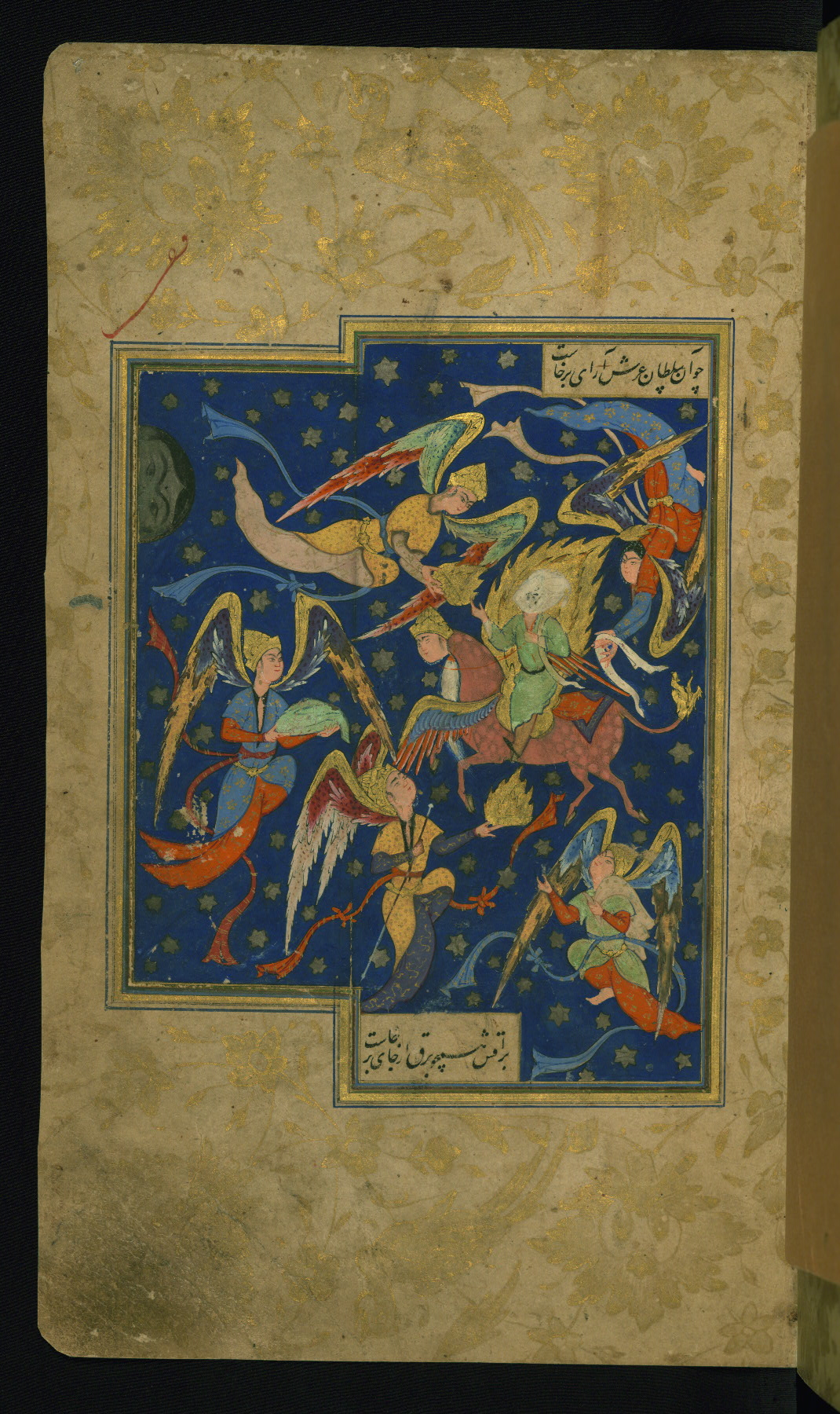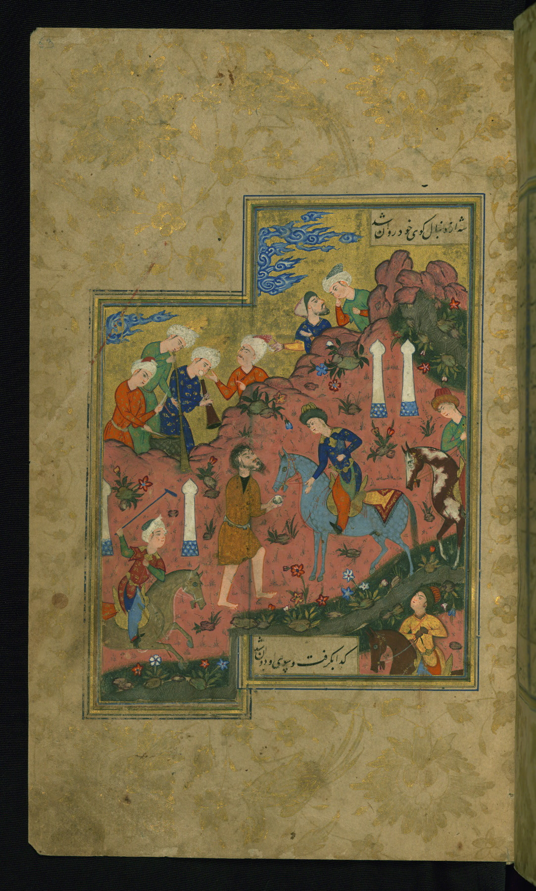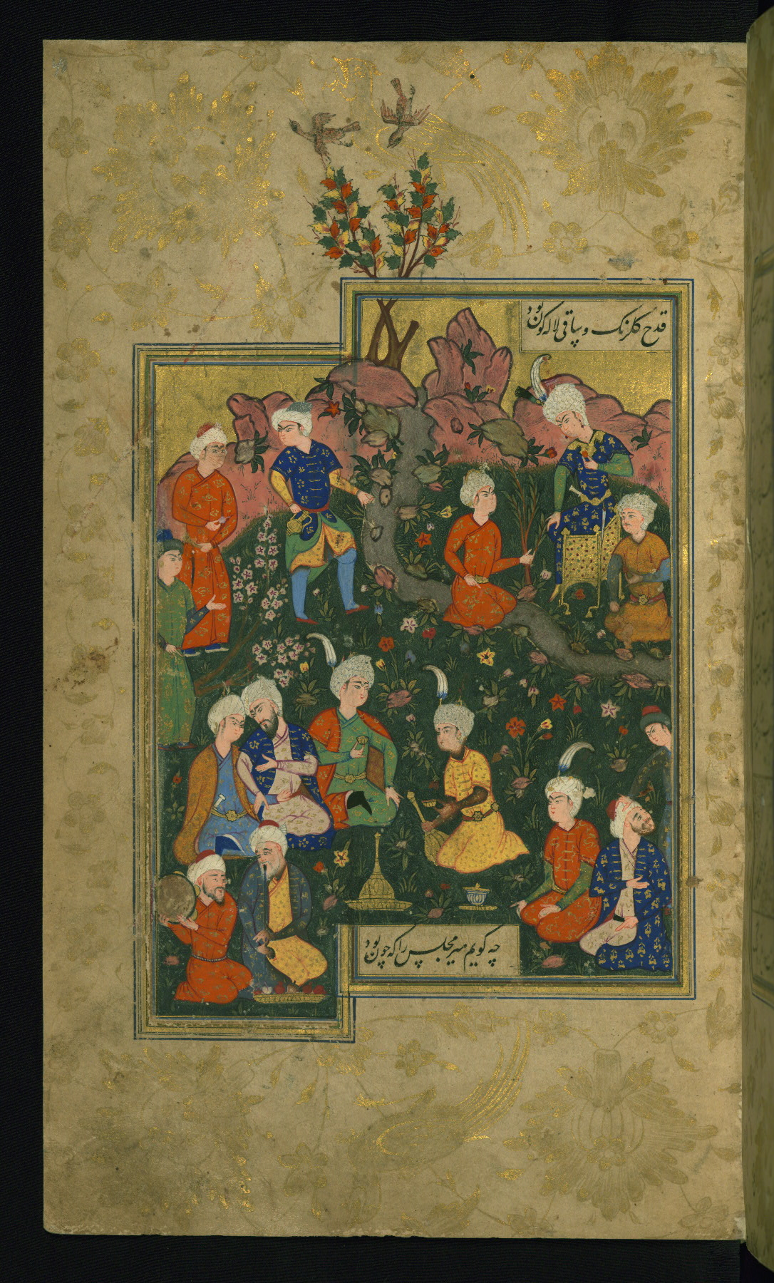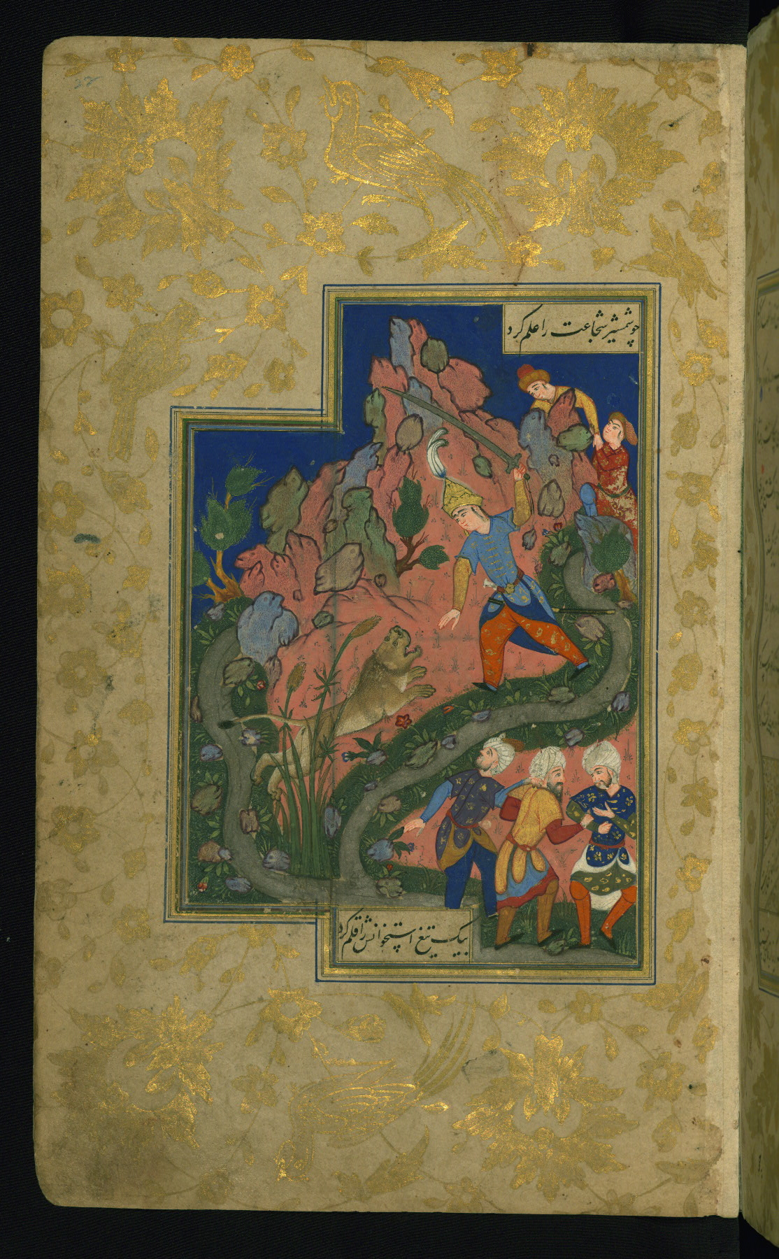 - Hand note: Written in nastaʿlīq script in black with ploychrome chapter headings