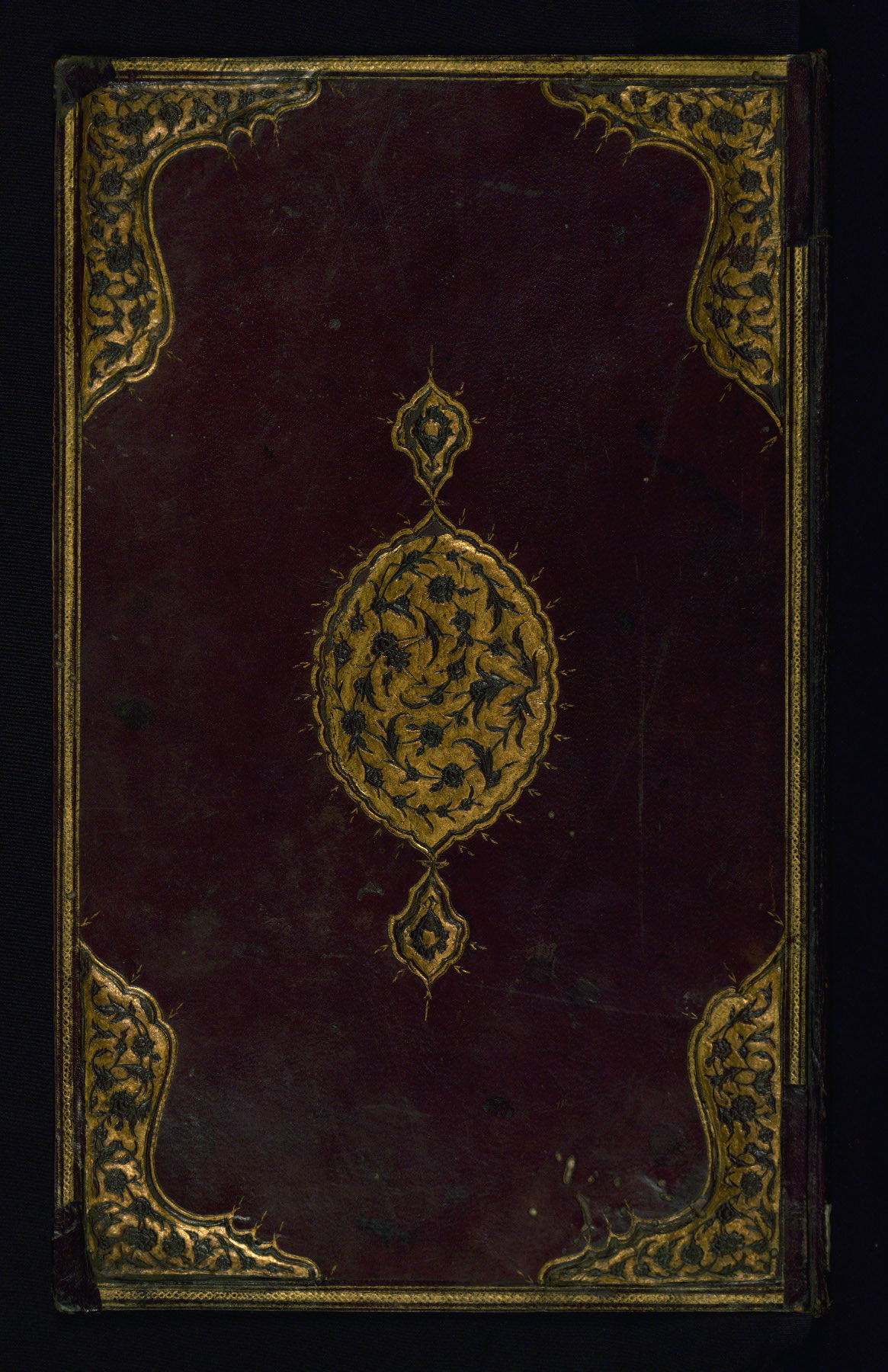 - Label: This brown leather binding is decorated with a central oval medallion with pendants and cornerpieces with arabesques on a gold ground.
