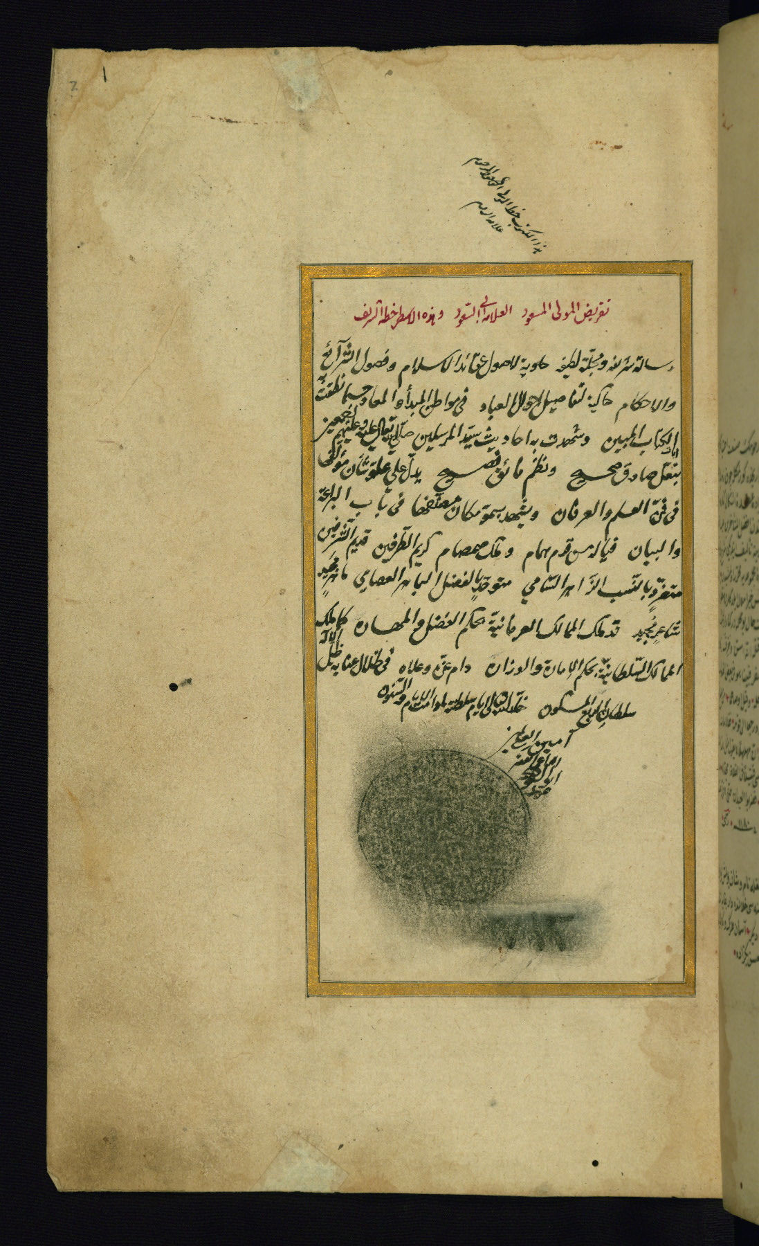 Approbation (recommendation) note on fol. 2a in Arabic signed by Abū al-Suʿūd Muḥammad; erased seal underneath with the number 712