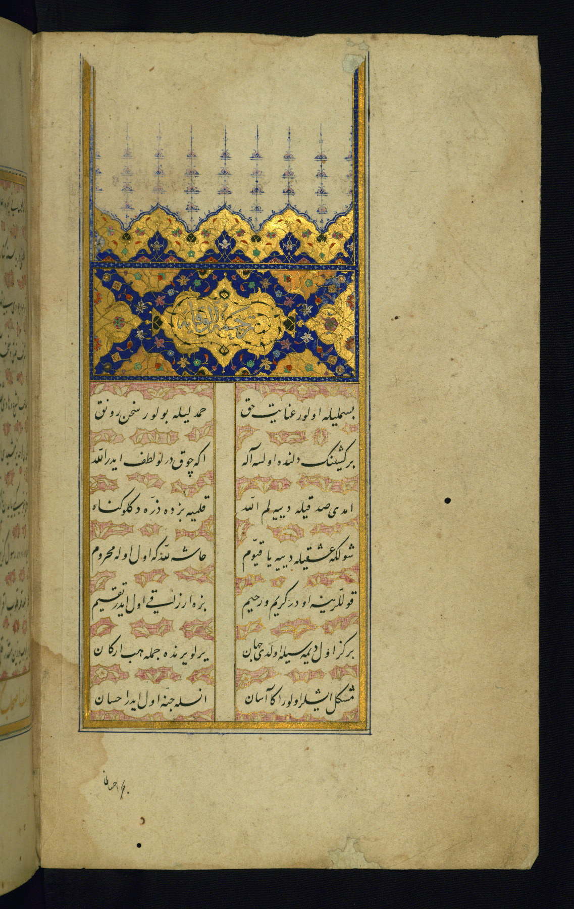 - Hand note: Written in nastaʿlīq script in black ink with headings in gold, red, and blue